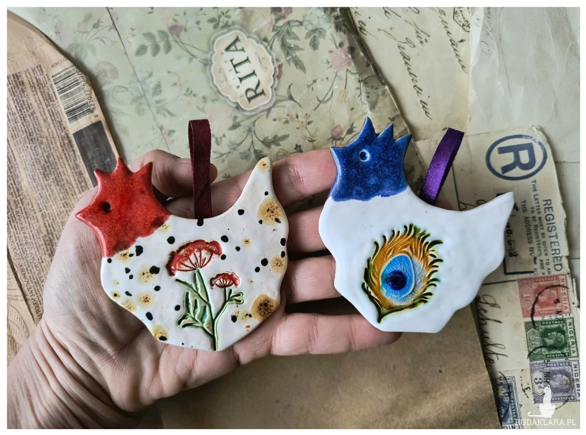 Zestaw złożony z 2 kurek do powieszenia na ozdobnej tasiemce. Wykonany z gliny szamotowej, wypalony na biskwit, a następnie szkliwiony w temperaturze 1260 stopni C. Idealnie sprawdzą się jako prezent okolicznościowy lub ozdoba domu.