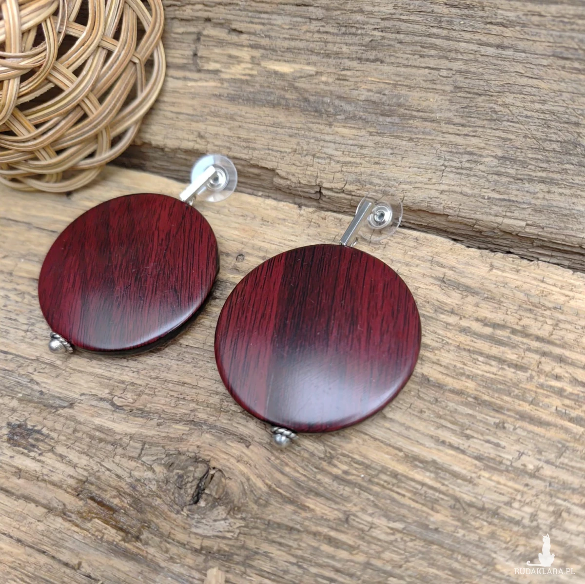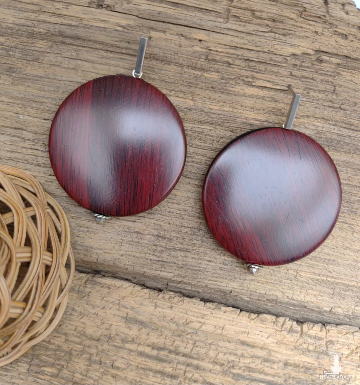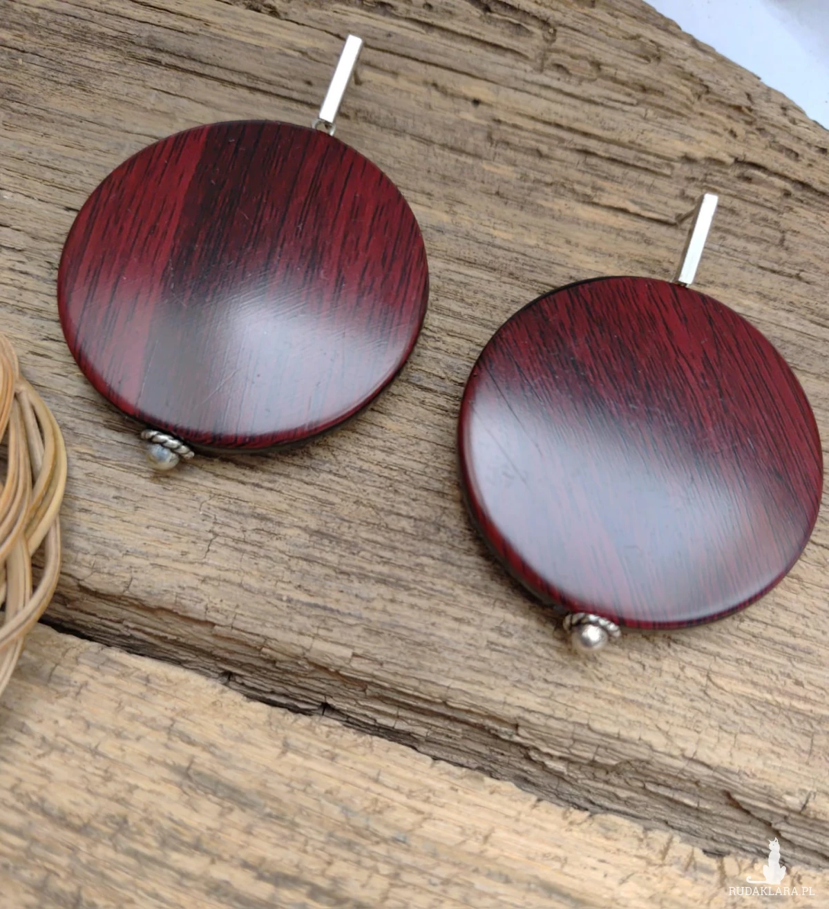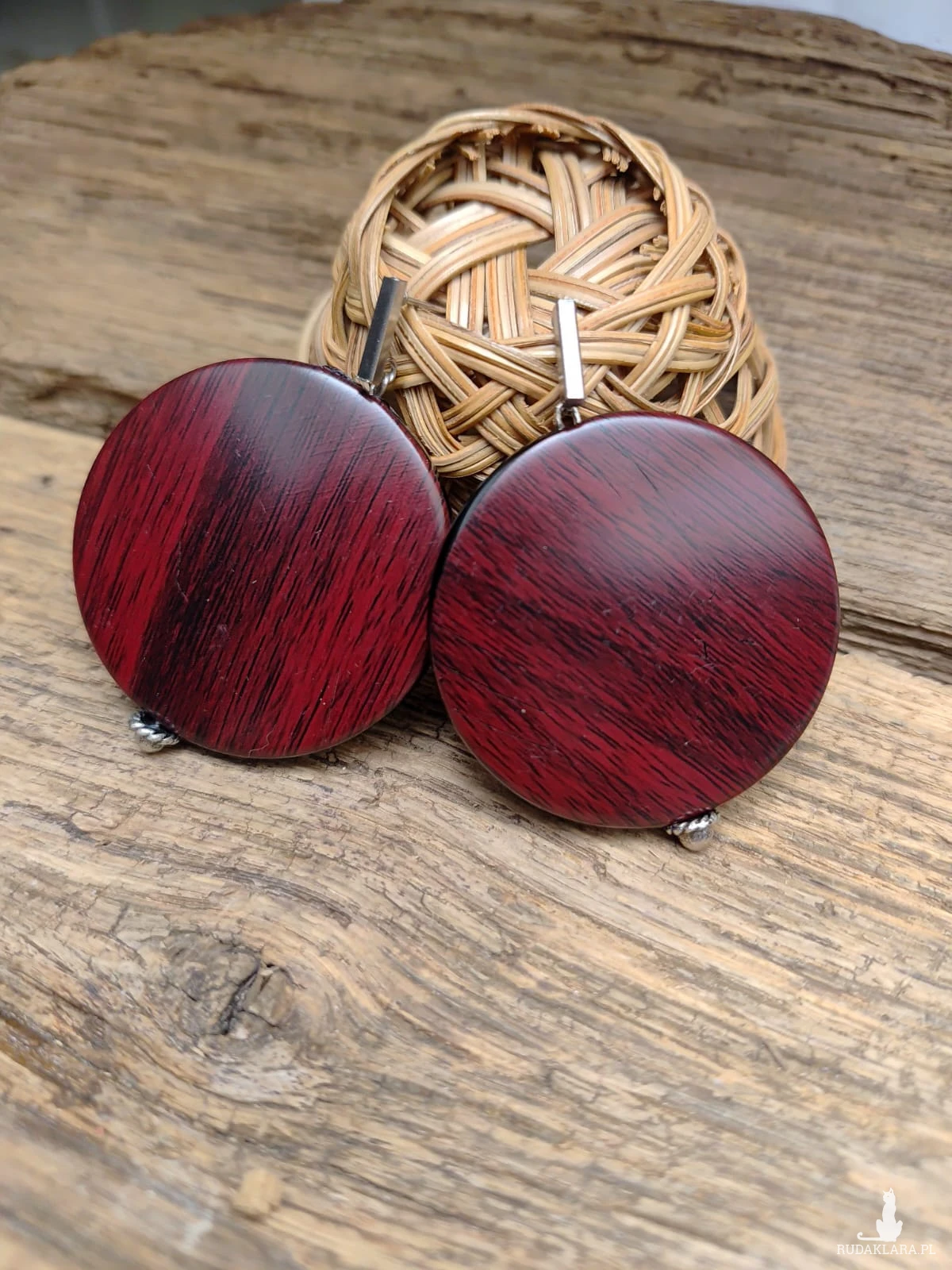 Kolczyki z materiału imitującego drewno w kolorze wiśni. akoła srednica 4