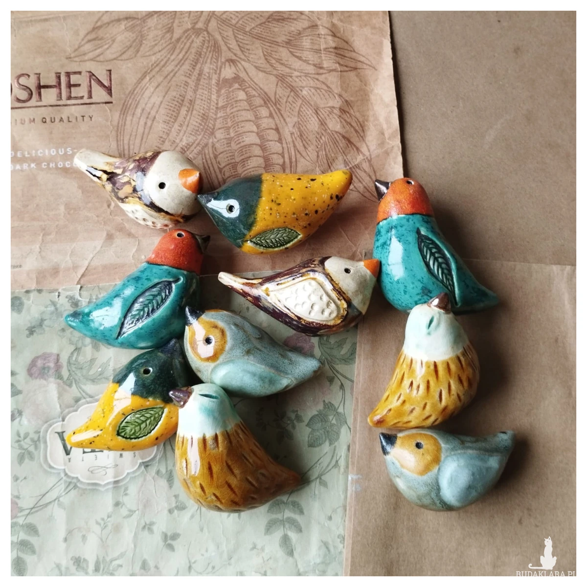 Zestaw 10 ptaszków ceramicznych, wykonanych z gliny szamotowej, wypalonych na biskwit, a następnie szkliwionych w temp 1260 stopni C. Polecam serdecznie