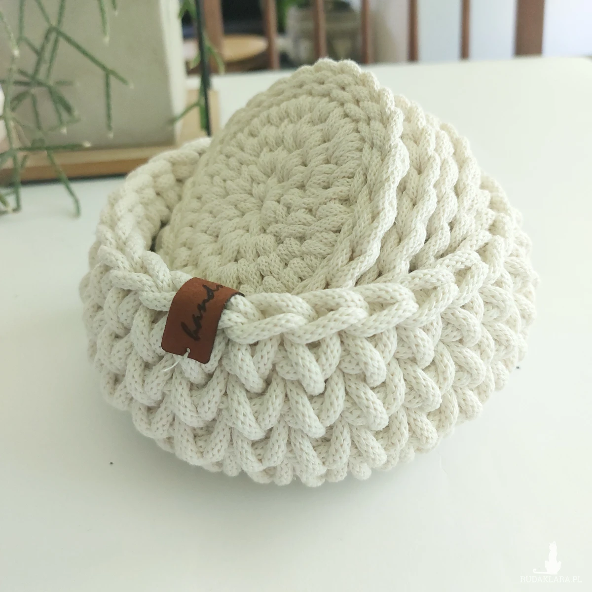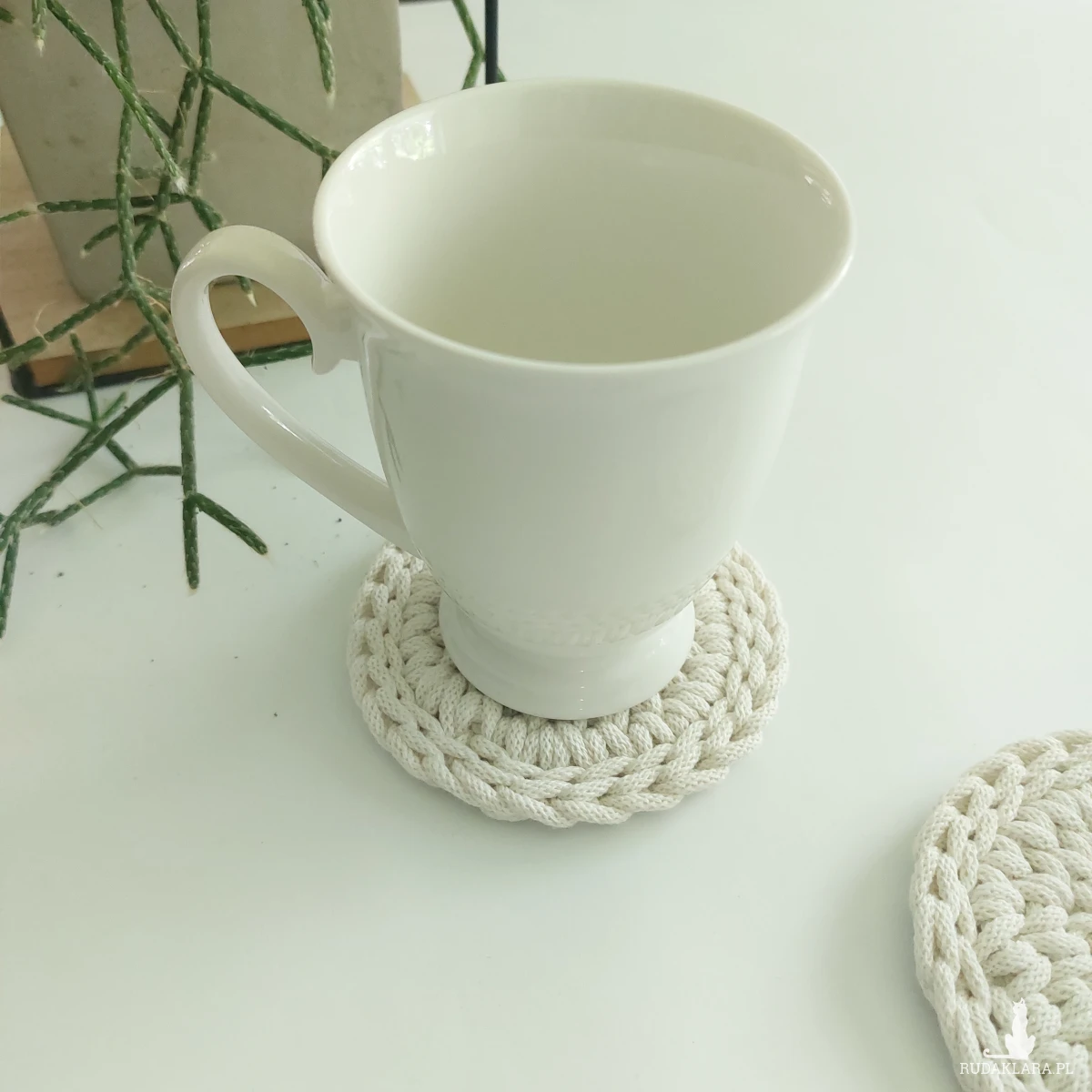 Do zaoferowania mam komplet podkładek pod kubek ( 4 szt) wykonanych ze sznurka bawełnianego o śr 3 mm w kolorze kremowym wraz z koszyczkiem do ich przechowywania. Koszyczek wykonany jest ze sznurka bawełnianego 5 mm.