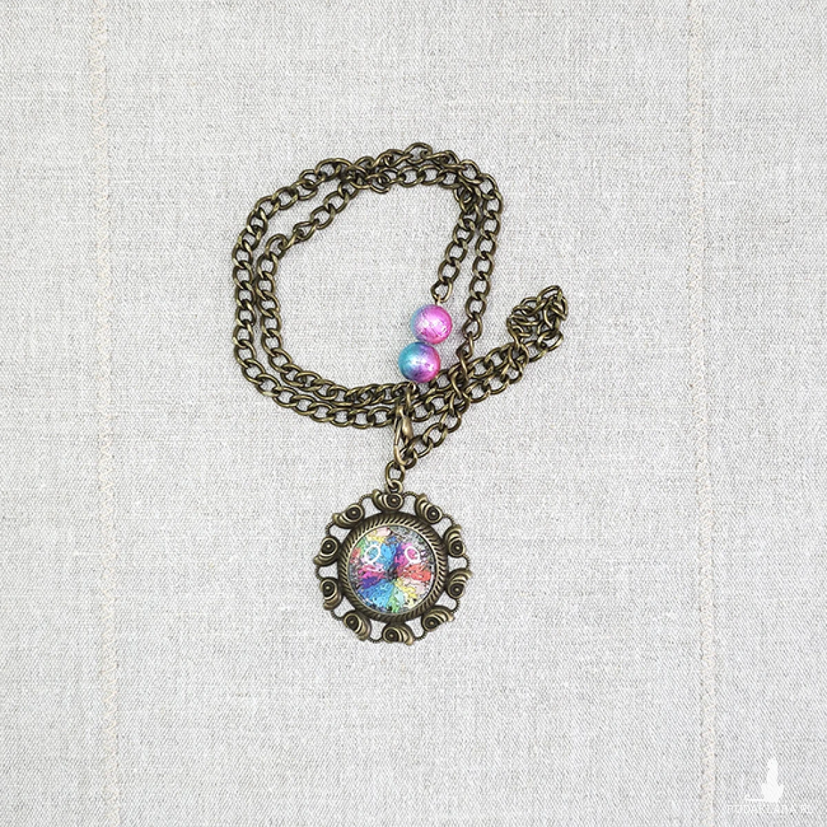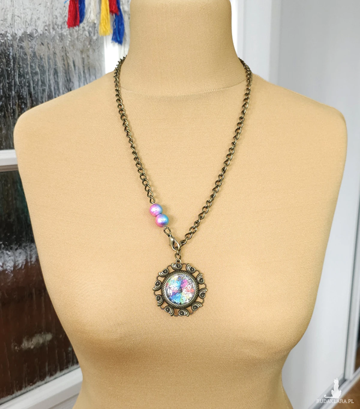 Naszyjnik z fragmentu rysunku mojego autorstwa ukrytego za szkłem w wisiorku. Wisiorek zawieszony na metalowym łańcuszku.