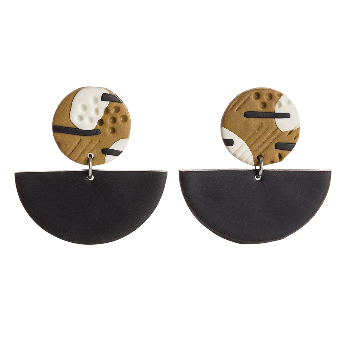 Ręcznie wykonane kolczyki. Okrągłe sztyfty z abstrakcyjnymi wzorami polaczone z czarnym, wiszącym elementem o półokrągłym kształcie. Kompozycja trzech kolorów: karmelowego/camel, czarnego i białego.