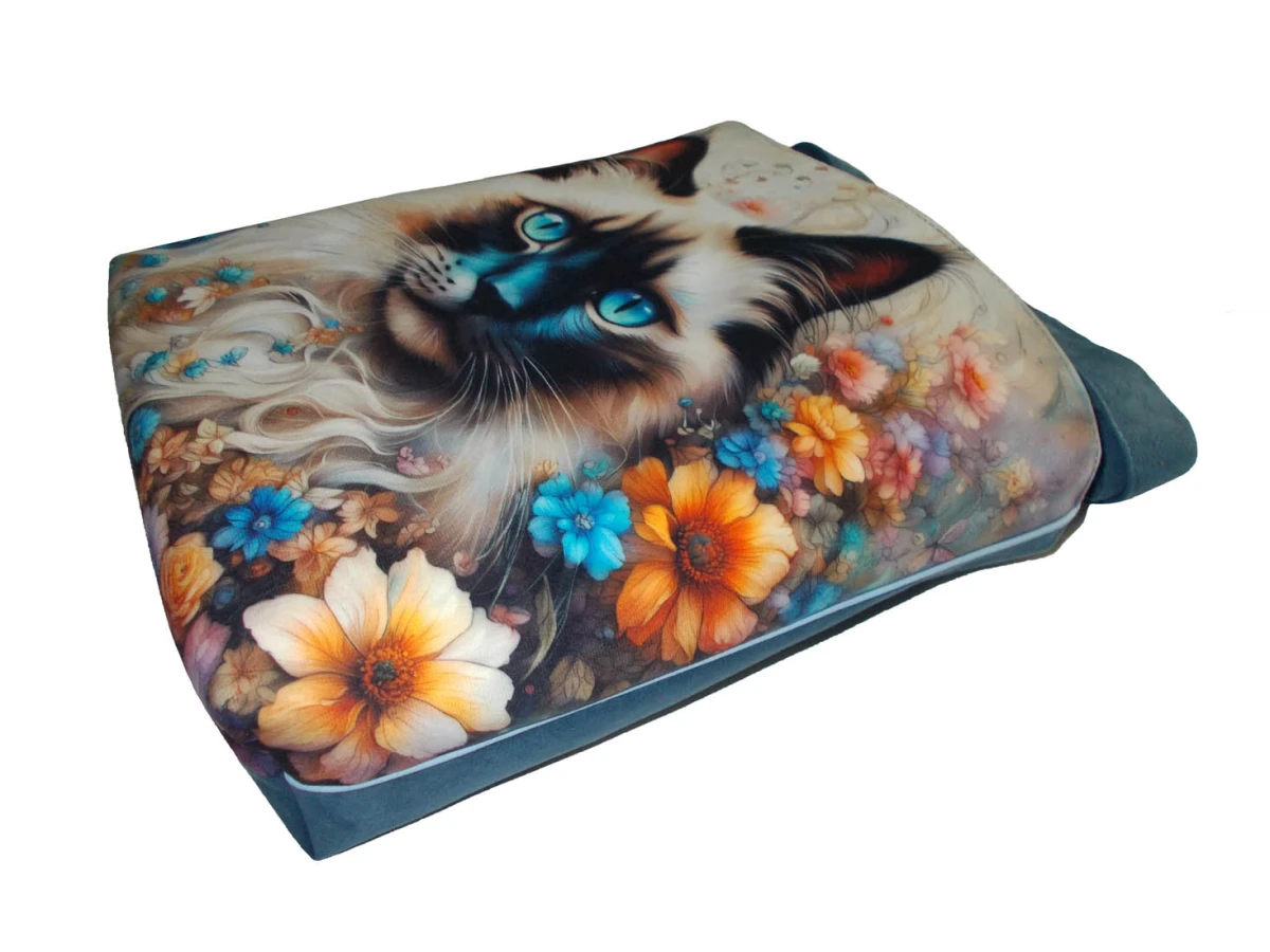 Autorska torba z usztywnionego eko zamszu, zapinana na zamek. Przód z weluru tapicerskiego. Pasek regulowany. Tył w korze paska (niebieski) Torba trzyma fason. Wewnątrz dwie kieszenie - jedna na zamek, druga z miejscem na telefon i coś jeszcze. W szwach wypustka. Denko poszerzone. szerokość 32cm wysokość 30cm plus denko 8cm