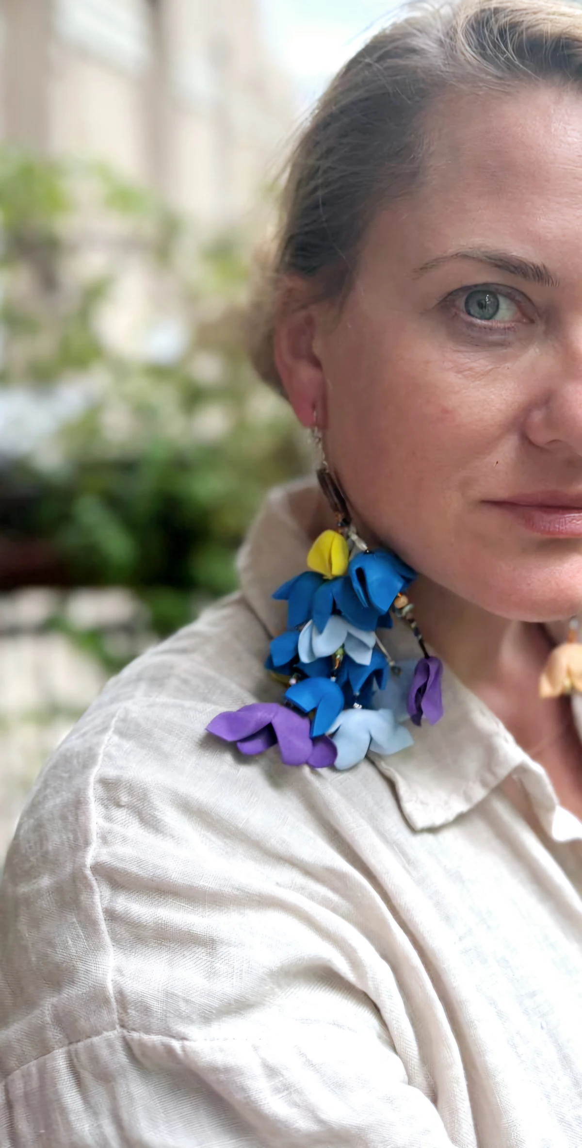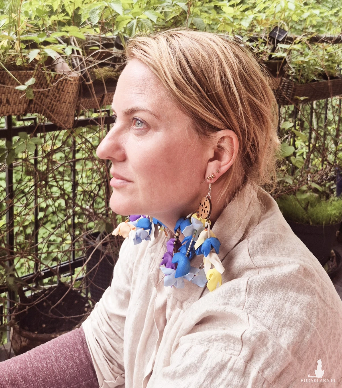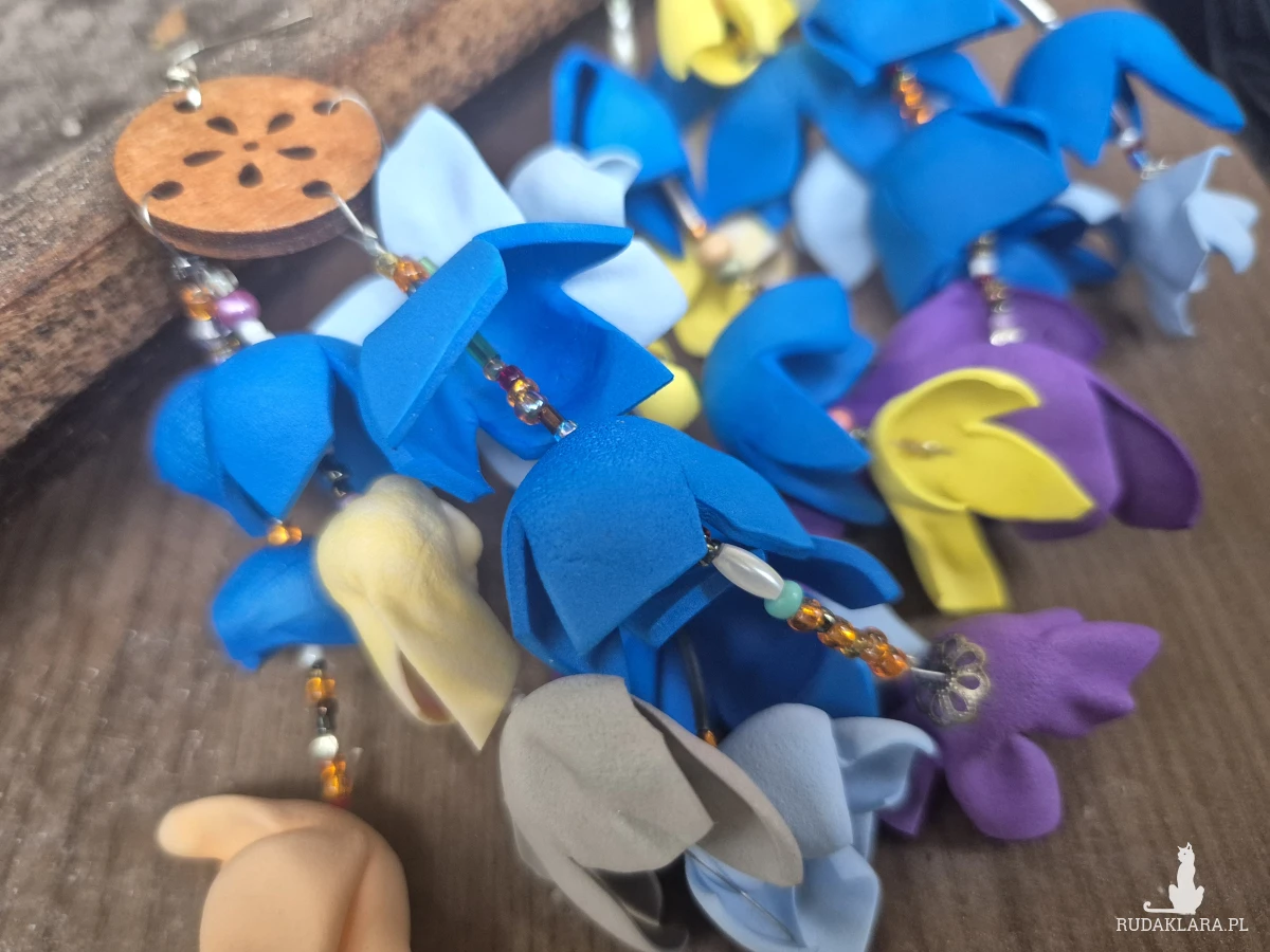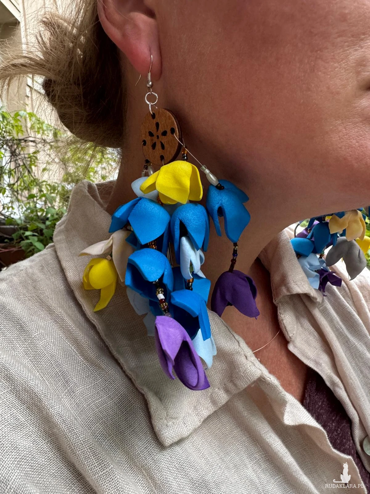 Kolczyki długie leciutkie kwiaty podstawa drewniana niezwykłe zwracające uwagę,poezja: straszny szok gdy polityka bez polotu lud słucha jak świnia grzmotu,box x1