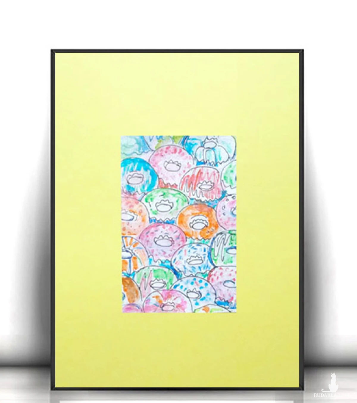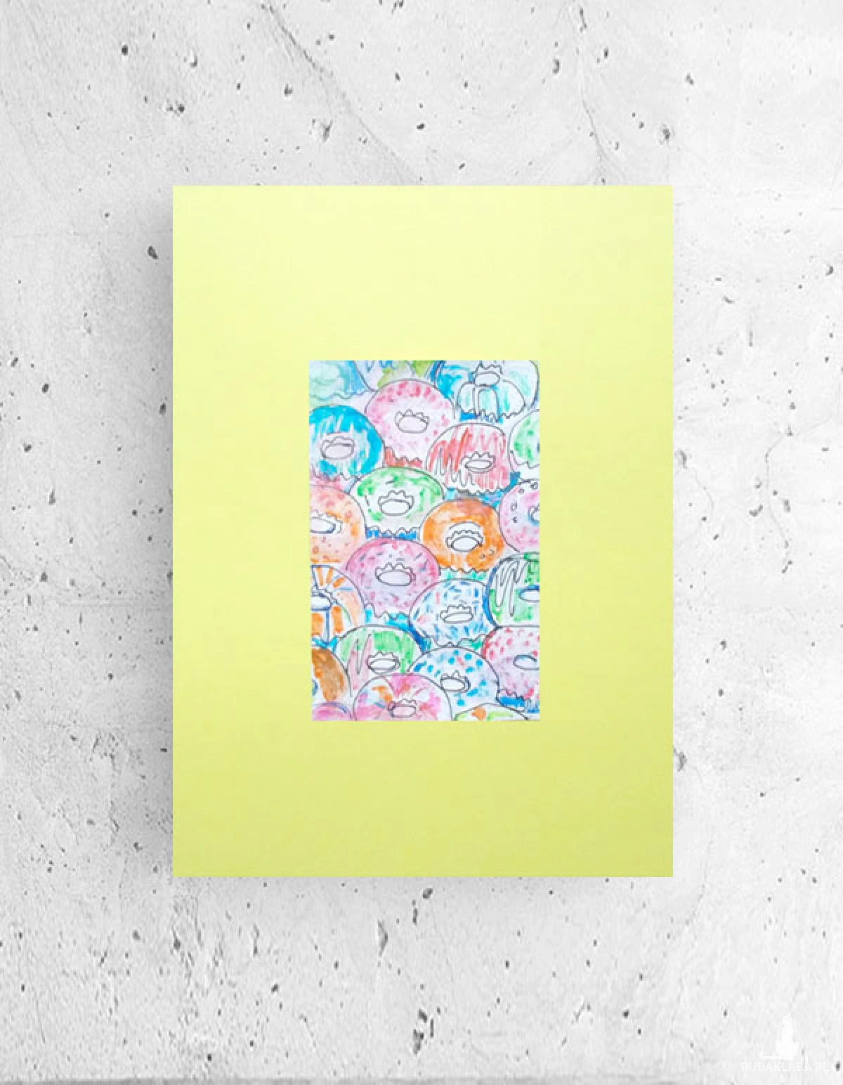 Kolorowy obrazek z ciasteczkami (donutami). Grafika na żółtym kartoniku formatu 21x30 cm. Poster wystarczy dać do ramki lub antyramy A4.