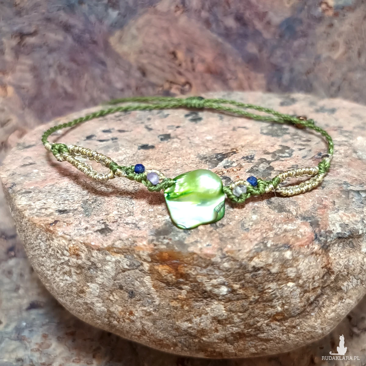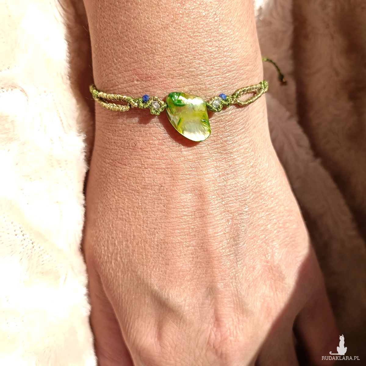 Bransoletka " Aquatic Plant " jest autorskim rękodziełem. Mikromakrama w połączeniu z naturalnymi kamieniami jest biżuterią elegancką, ciepłą w dotyku, lekką i przyjemną w noszeniu na co dzień i do wyszukanej kreacji.
