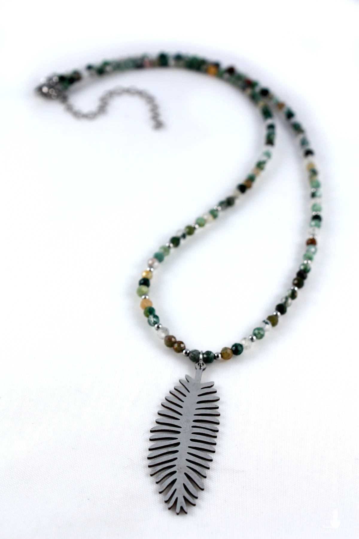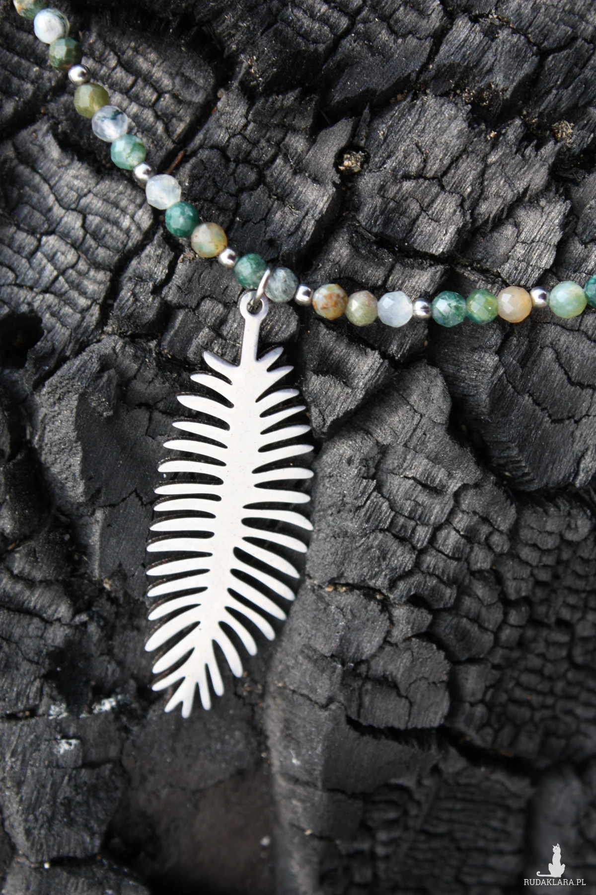 Naszyjnik wykonany z fasetowanych agatów indyjskich oraz dodatków w kolorze srebra wykonanych ze stali szlachetnej. Agaty użyte w naszyjniku są wielobarwne i pokazują swoją różnorodność, dzięki temu naszyjnik jest unikatowy i jedyny w swoim rodzaju. Regulowane zapięcie w postaci łańcuszka o długości 11 cm umożliwia noszenie naszyjnika jako krótki oraz dłuższy.