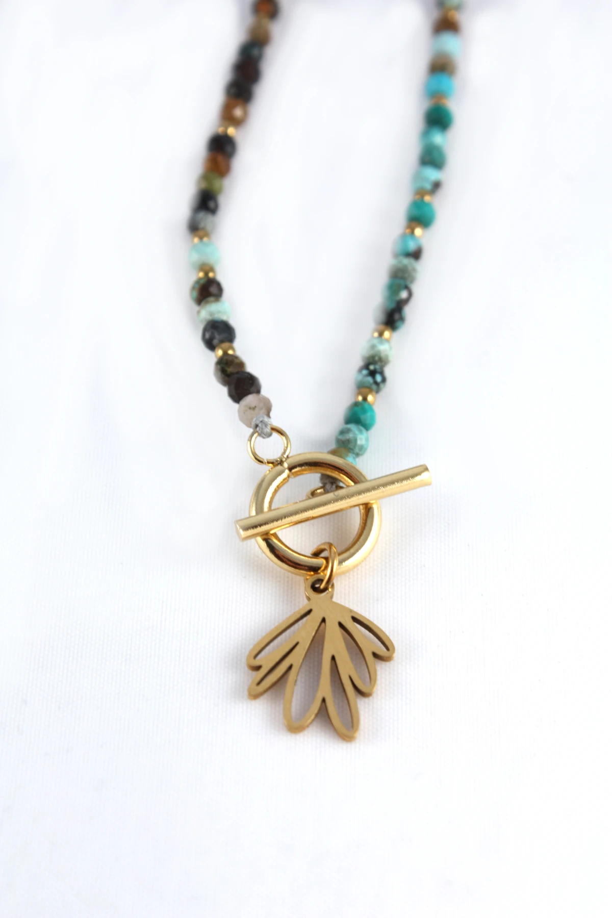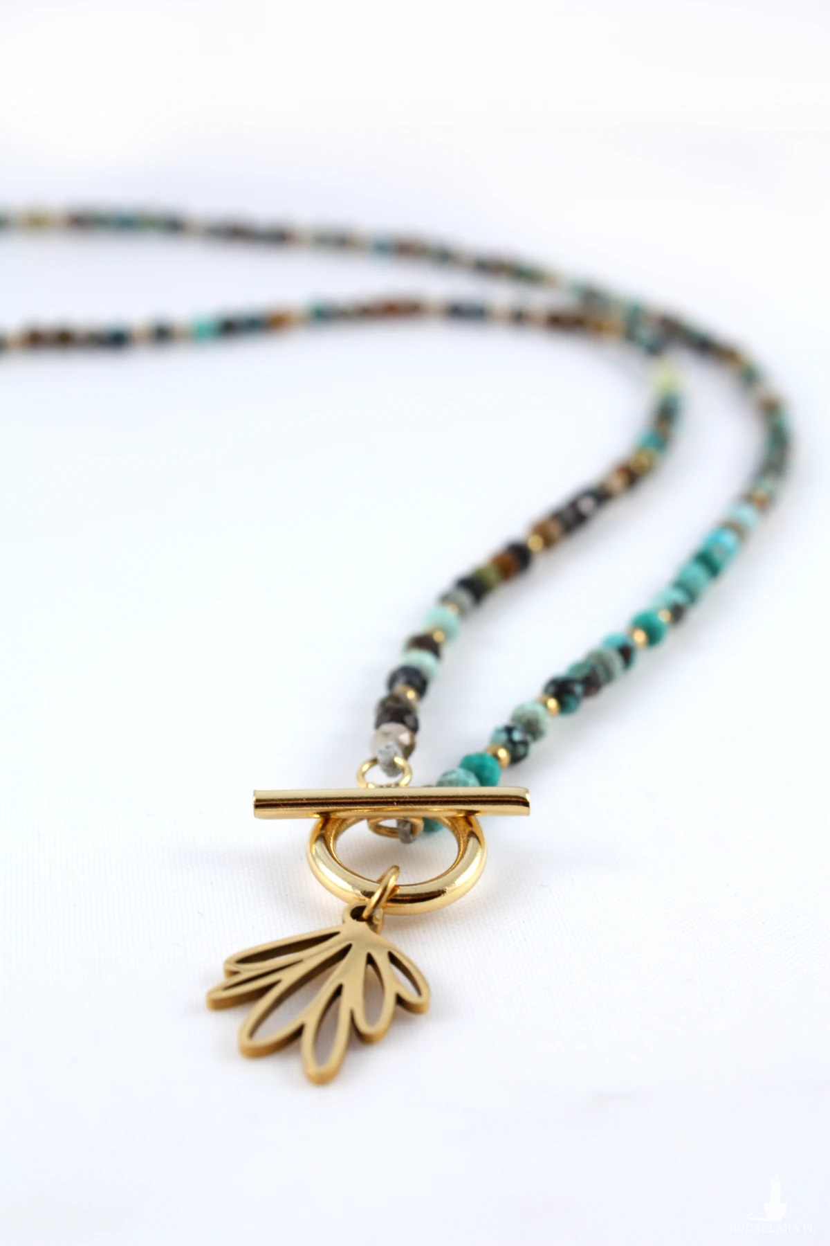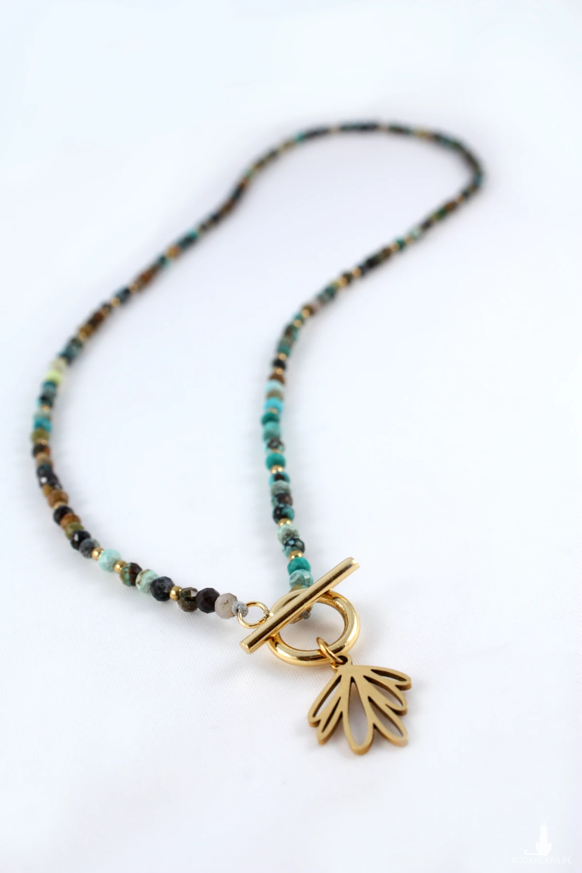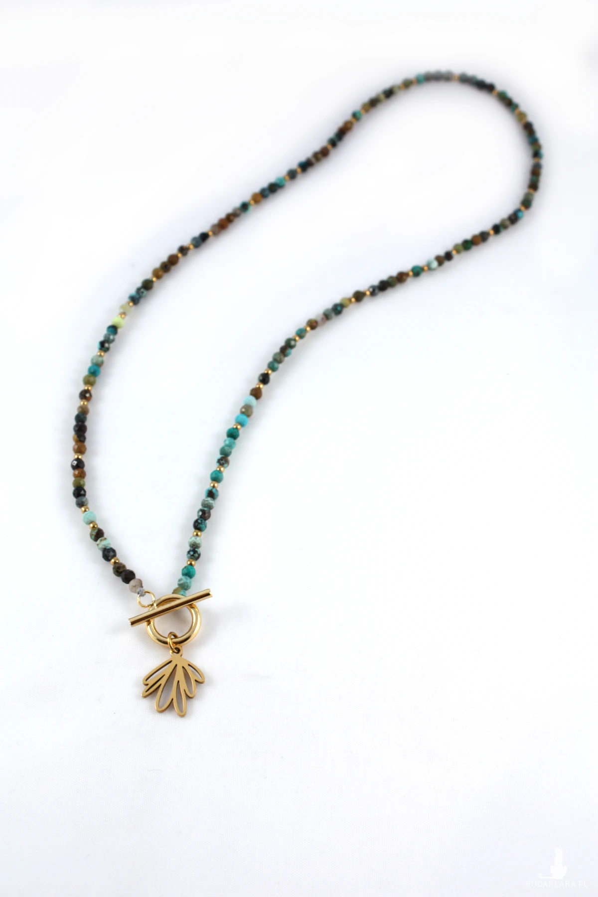 Naszyjnik z wygodnym zapięciem Toggle wykonany z fasetowanego turkusu i hematytów w kolorze złota. Turkusy użyte w naszyjniku są wielobarwne i posiadają charakterystyczne dla tego kamienia wtrącenia i żyłki, co czyni naszyjnik jeszcze piękniejszym i unikatowym. Drugiego takiego samego nie ma na całym świecie :-)