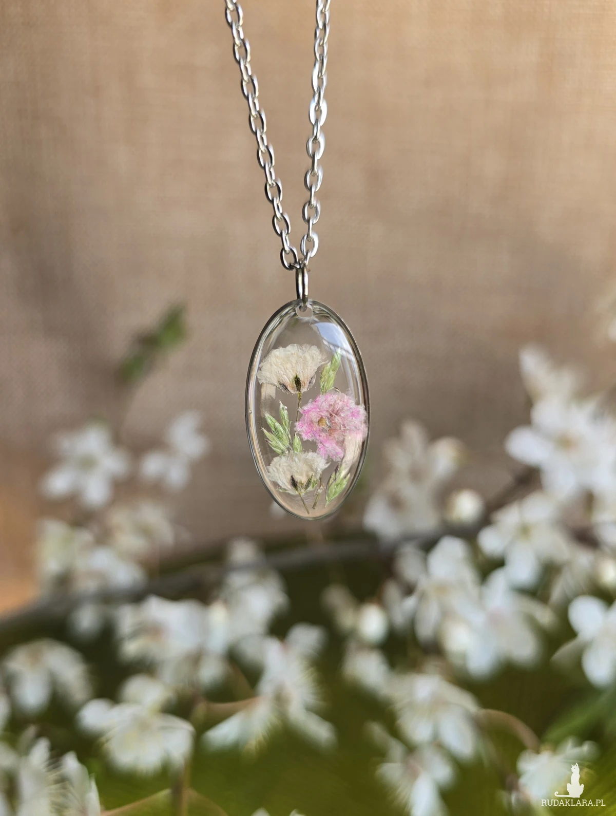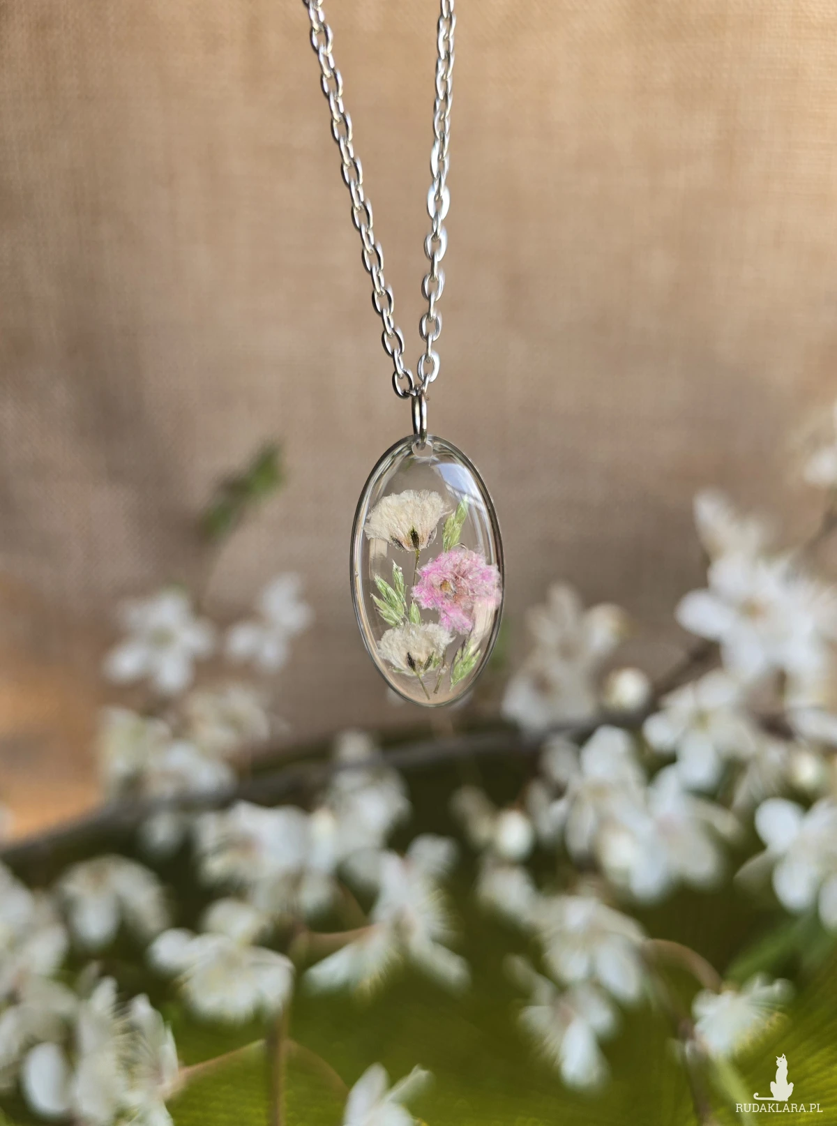 Srebrna zawieszka srebrny wisiorek naszyjnik żywica z żywicy kwiaty z kwiatami jajowata retro naturalna dziewczęca kobieca gipsówka