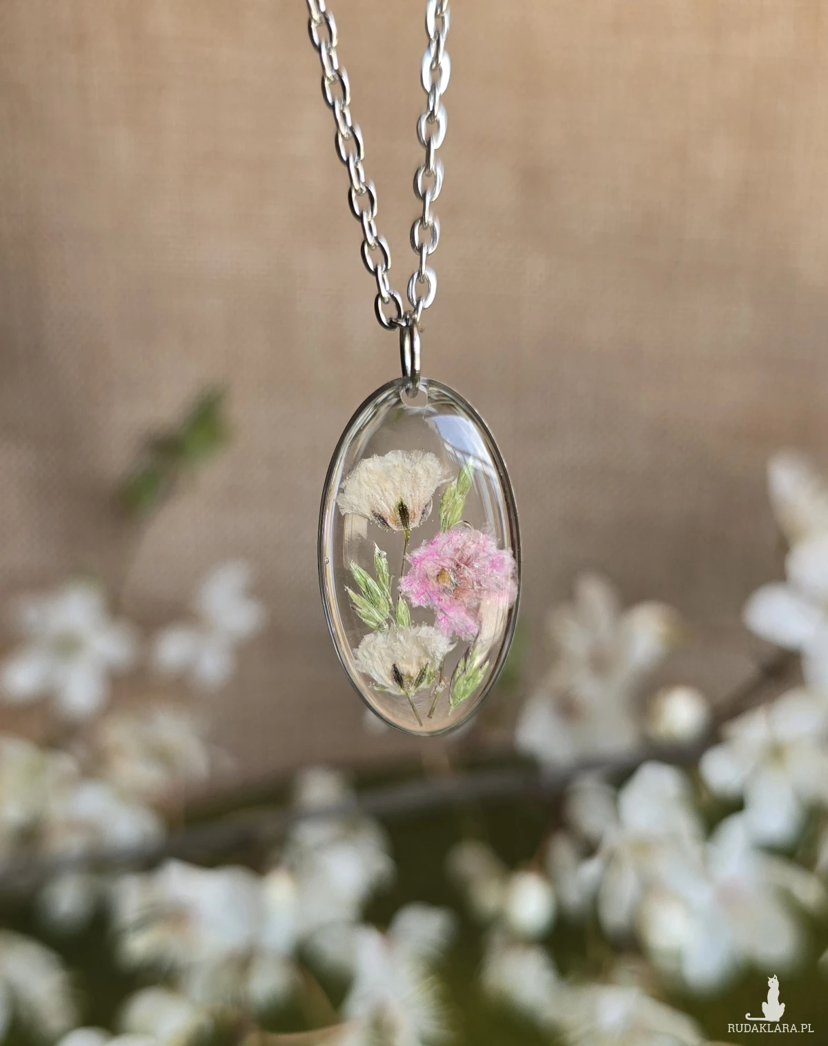 Oferuję Państwu unikalną biżuterię. Zawieszka jest wykonana z suszonych kwiatów i żywicy epoksydowej. Biżuteria jest wspaniałym i oryginalnym prezentem na lata.
