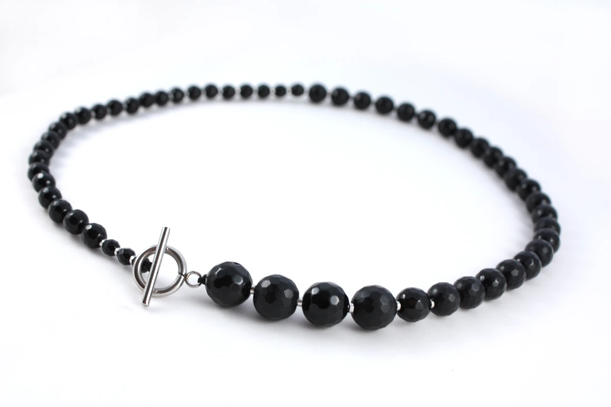 Naszyjnik łączący prostotę i piękno. Idealnie fasetowane kulki onyksu o różnych wielkościach ułożone od najmniejszych do największych, bądź odwrotnie, są doskonałym, wyraźnym dodatkiem do stylizacji. Długość naszyjnika to ok 47 cm. Zapięcie toggi jest wygodne i łatwe do zastosowania. Wszystkie metalowe dodatki to szlachetna stal chirurgiczna, w kolorze srebra, która nie uczula skóry.