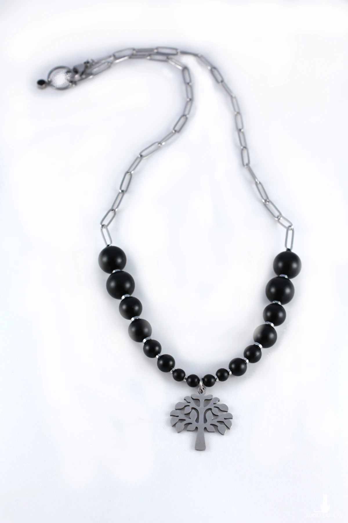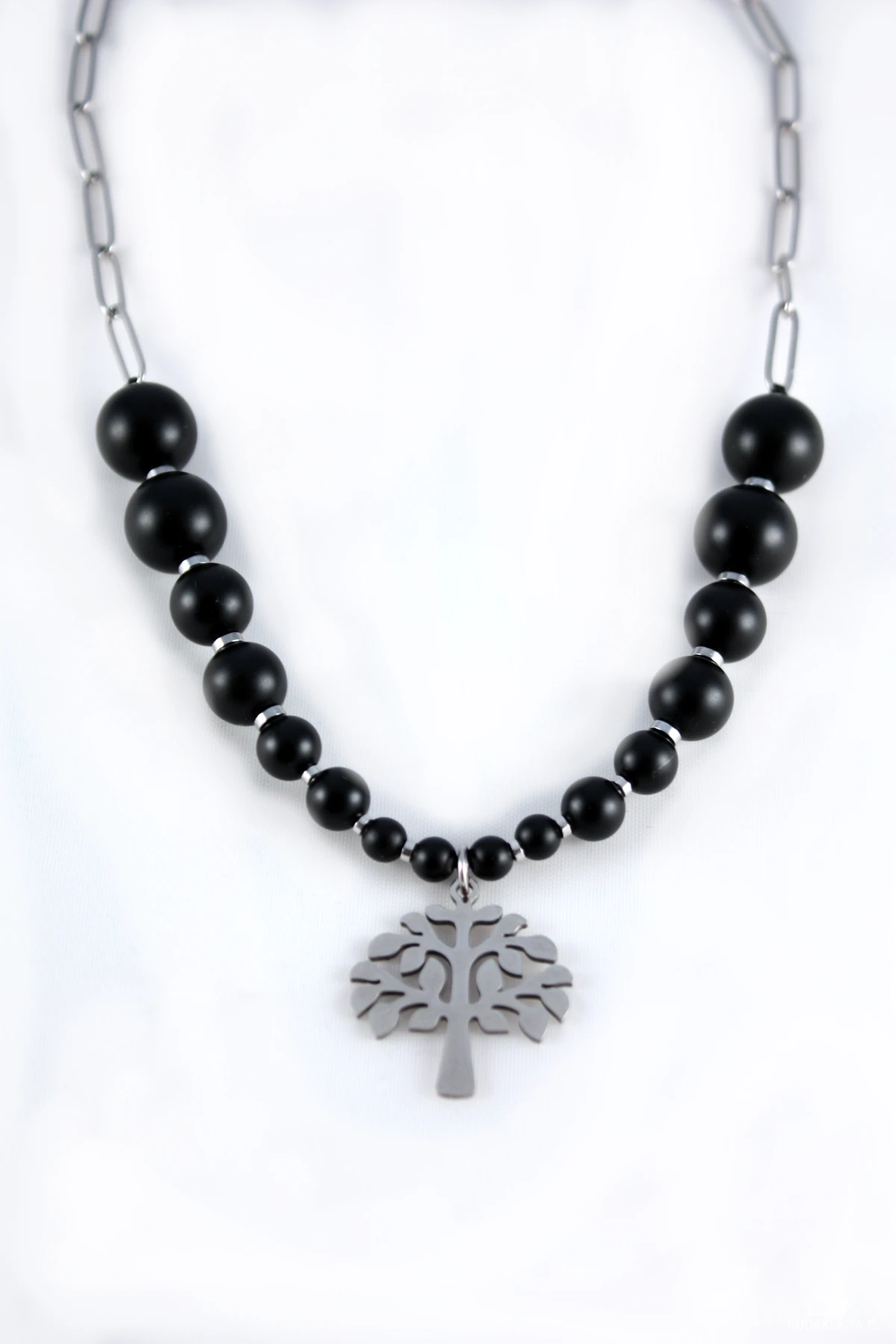 Prostoty i piękny naszyjnik z zawieszką w postaci drzewa to doskonały element stroju, który podkreśli indywidualność i klasę. Idealne, gładkie, matowe kulki onyksu o różnych wielkościach połączone z łańcuszkiem tworzą harmonijną, symetryczną ozdobę. Długość naszyjnika to 50 cm. Duży karabińczyk stanowi wygodne i łatwe do zastosowania zapięcie. Wszystkie metalowe dodatki to szlachetna stal chirurgiczna, w kolorze srebra, która nie uczula skóry.