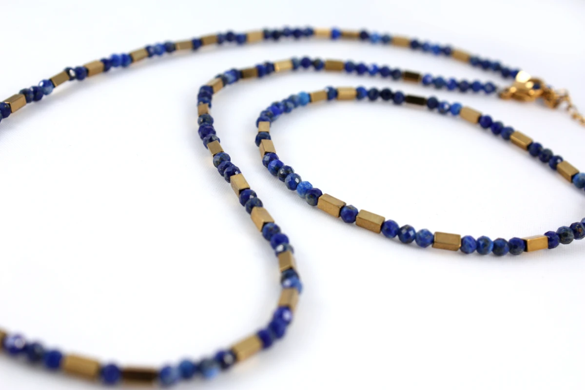 Naszyjnik z naturalnych kamieni lapis lazuli z prostokątnymi elementami w kolorze złota z hematytu. Naszyjnik poosiada możliwość przedłużenia dzięki czemu można go indywidualnie dopasować. Lapis lazuli ma niezwykłe właściwości: reguluje krążenie krwi, wspomaga prawidłowy przepływ krwi i może pomóc w obniżeniu ciśnienia krwi. Łagodzi stany zapalne. Kamień ten ma właściwości przeciwzapalne, co może przynieść ulgę w bólach i obrzękach, szczególnie przy migrenach.