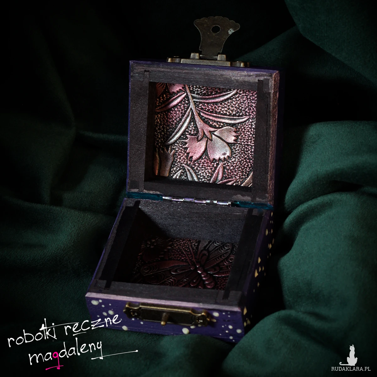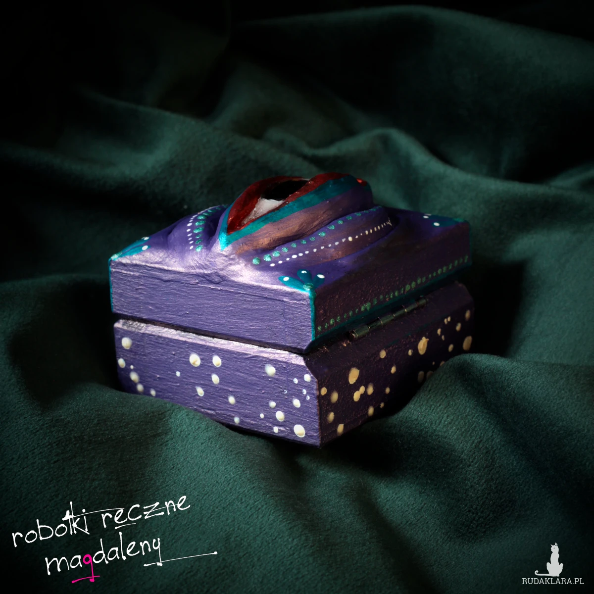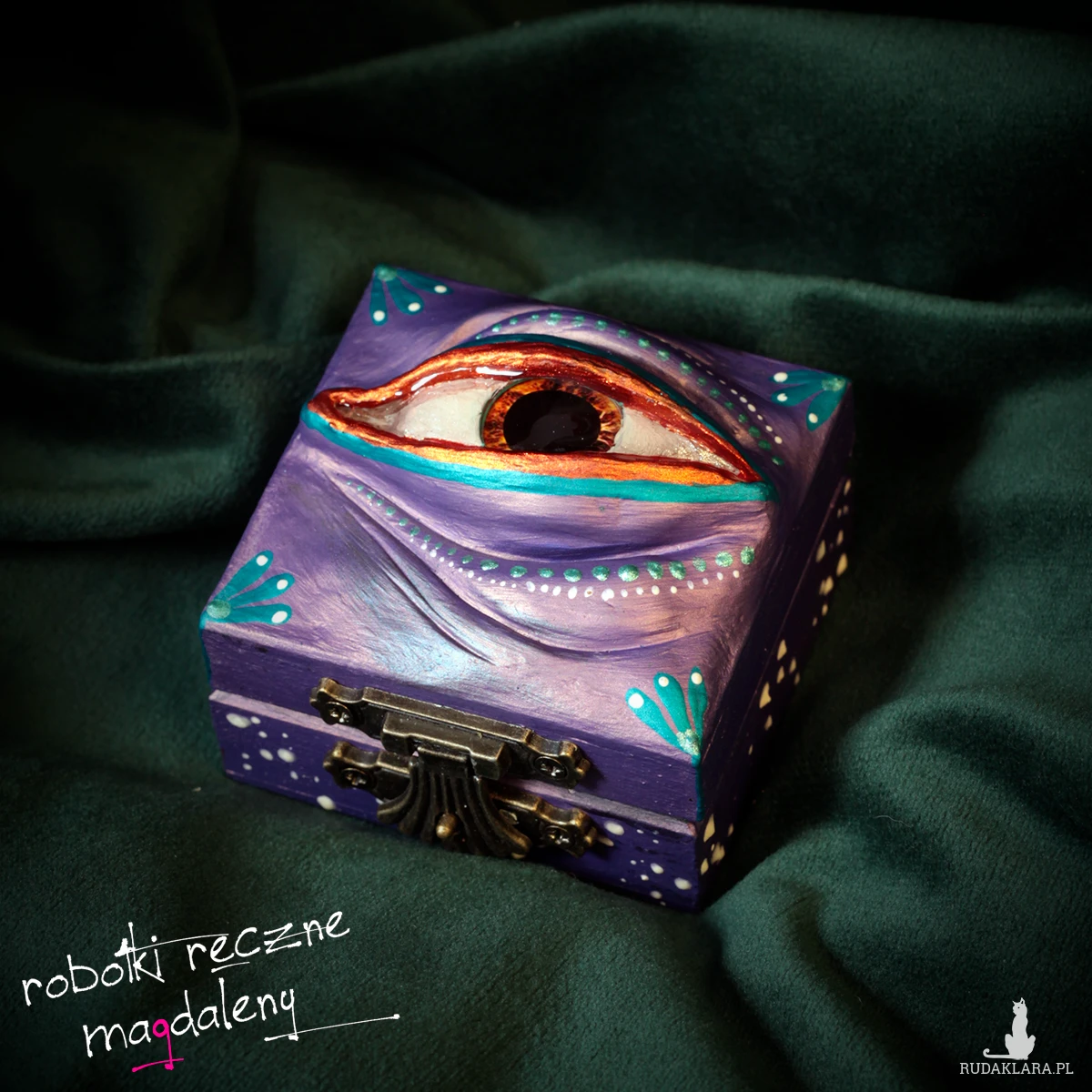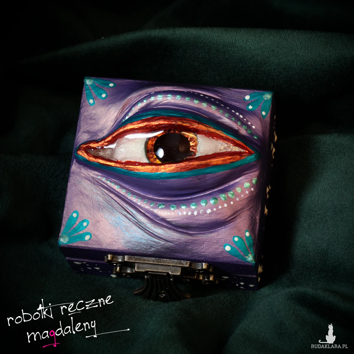 Szkatułka drewniana ze szklaną źrenicą, malowane farbami akrylowymi, zabezpieczone bejcą i lakierem akrylowym.