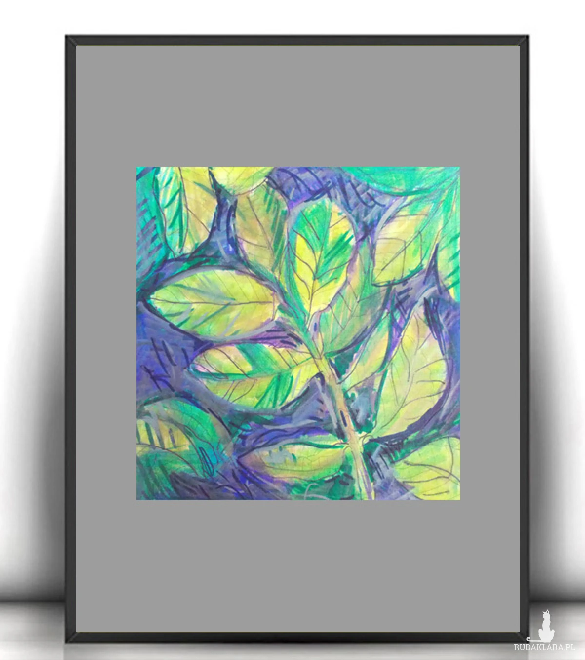 Kolorowy obrazek z liśćmi. Grafika na szarym kartoniku w rozmiarze A4. Ilustrację należy tylko oprawić w ramkę 21x30 cm. Dekoracja na ścianę do przedpokoju, jadalni, sypialni, kuchni, salonu, pokoju młodzieżowego lub dziecięcego, gabinetu, holu. Obrazek będzie pasował zarówno do wnętrz boho, nowoczesnych, hygge, loftowych, eklektycznych, jak i do tradycyjnych, rustykalnych, vintage, klasycznych. Przedmiot do ozdoby wnętrz.