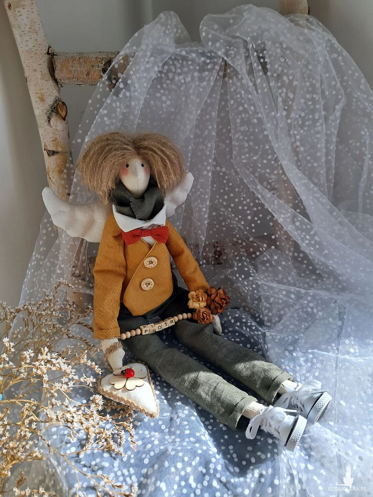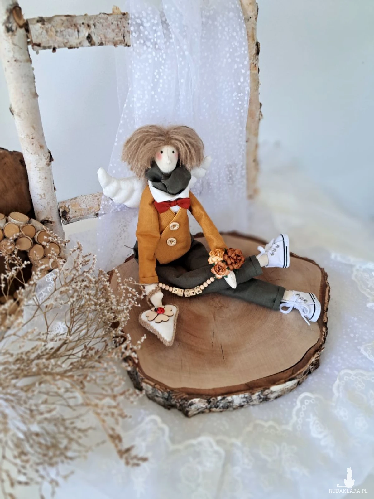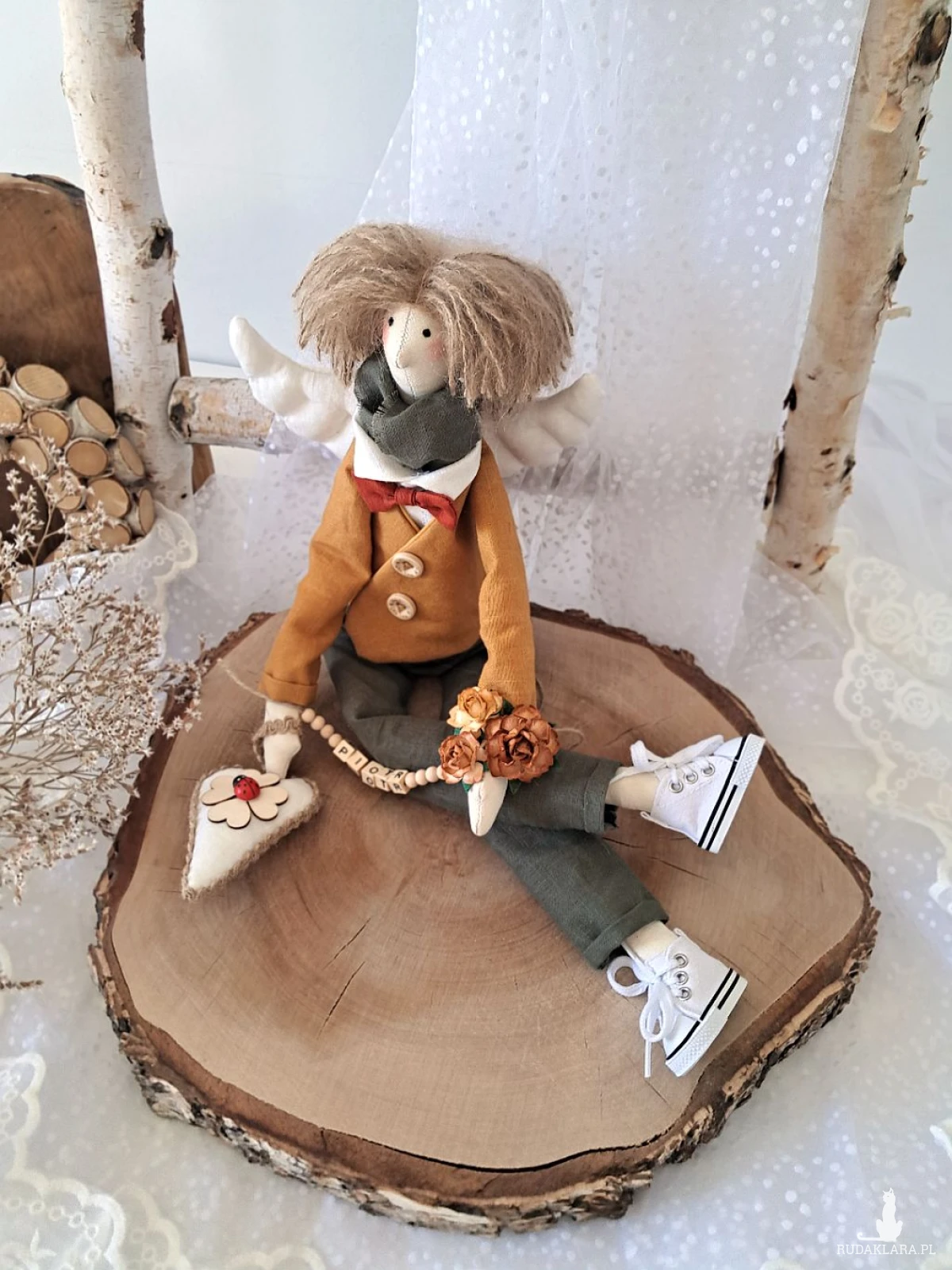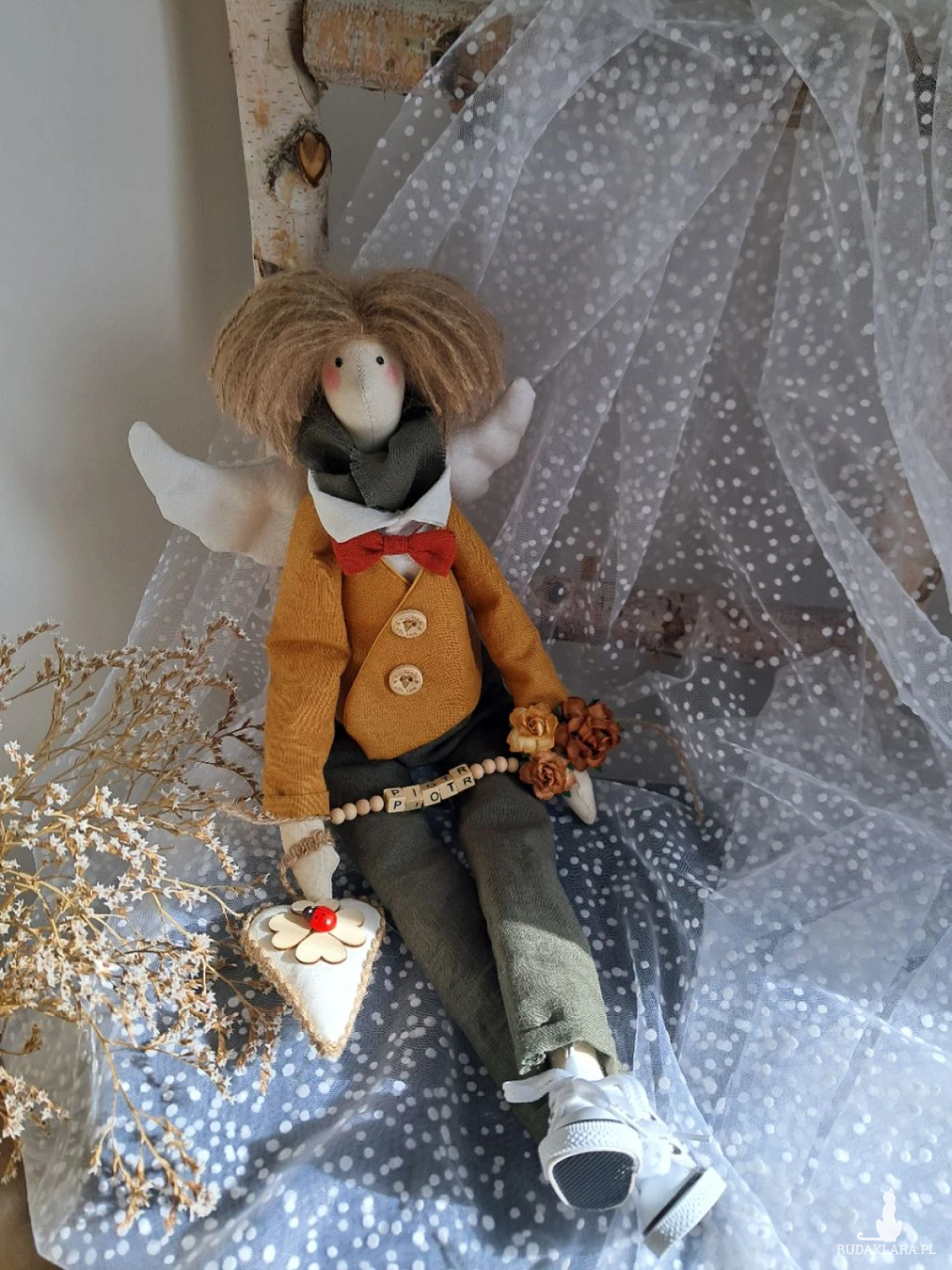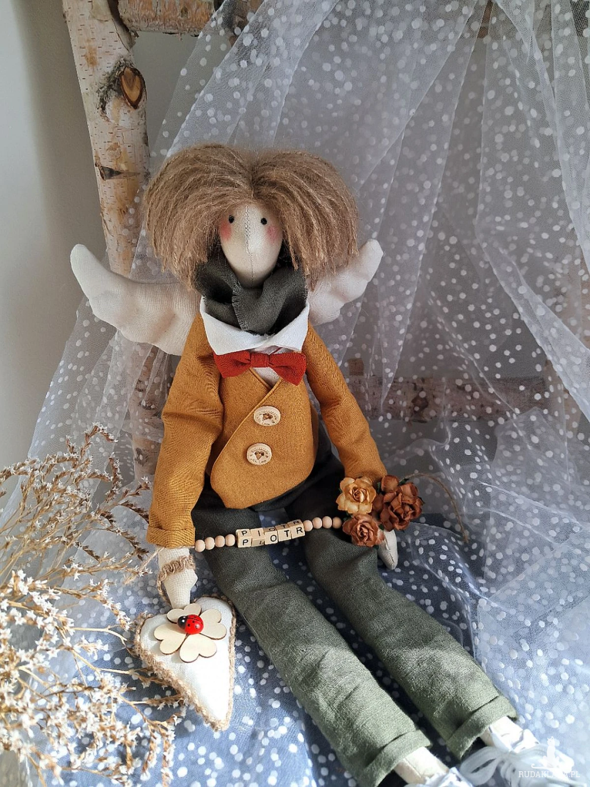Witam serdecznie. Mam do sprzedania anioła chłopca. Ubranko z wysokogatunkowego lnu: biała koszula, marynarka koloru musztardy, spodnie ciemna zieleń. Pod szyją apaszka i muszka. Guziki drewniane. Skrzydła i serduszko również uszyte z lnu. Serduszko udekorowane koniczynką czterolistną i biedroneczką. Na stópkach białe trampki. Włosy z wełny koloru brązowego. Imię koralikowe zmienię stosownie do potrzeby (proszę o wiadomość w tym zakresie)Wysokość 47 cm. Może siedzieć lub być zawieszony.