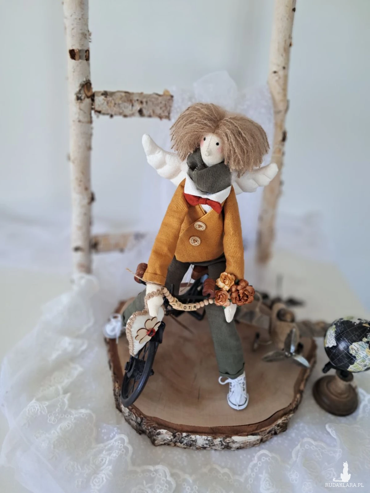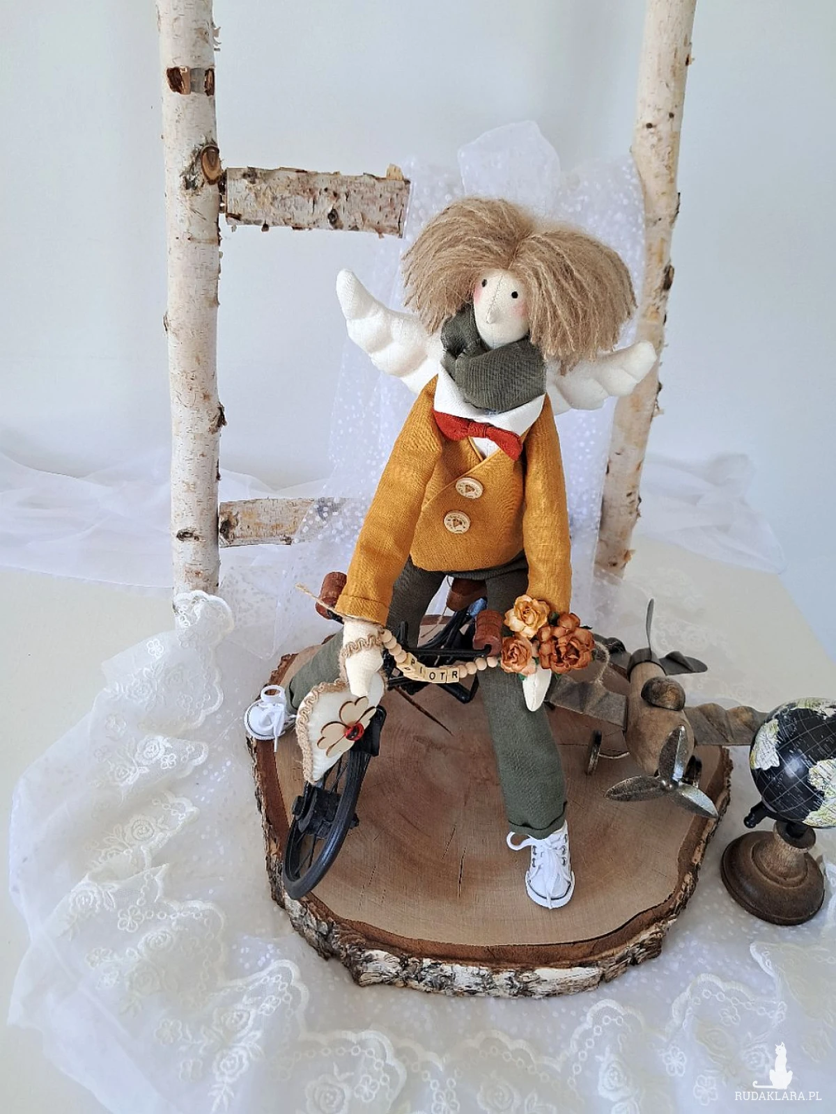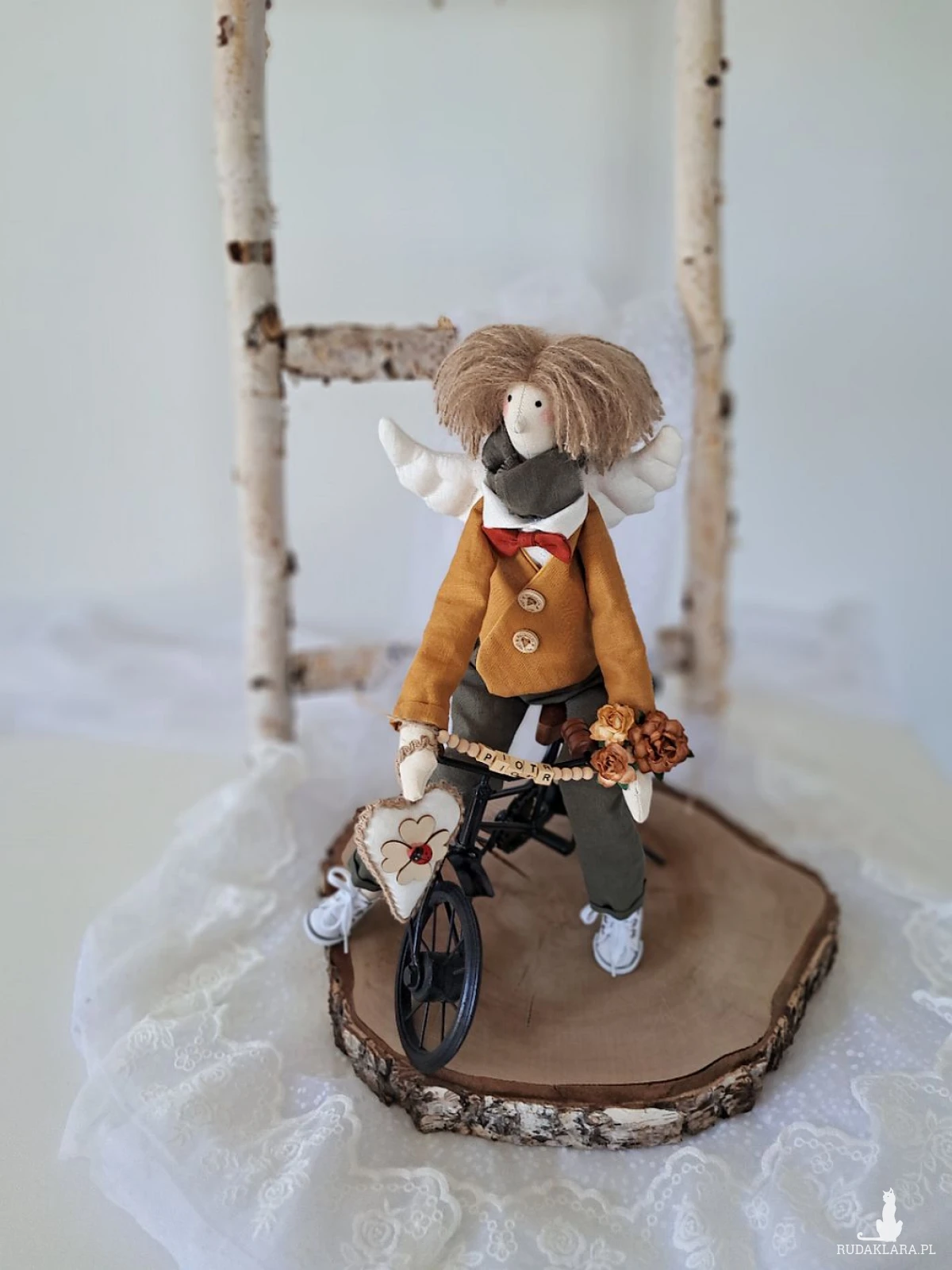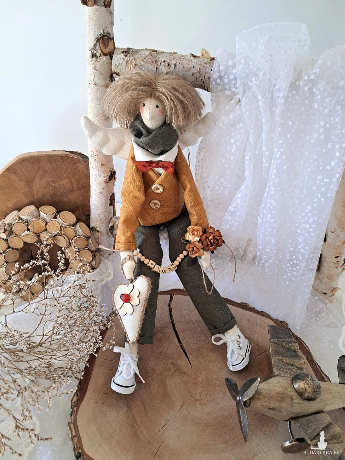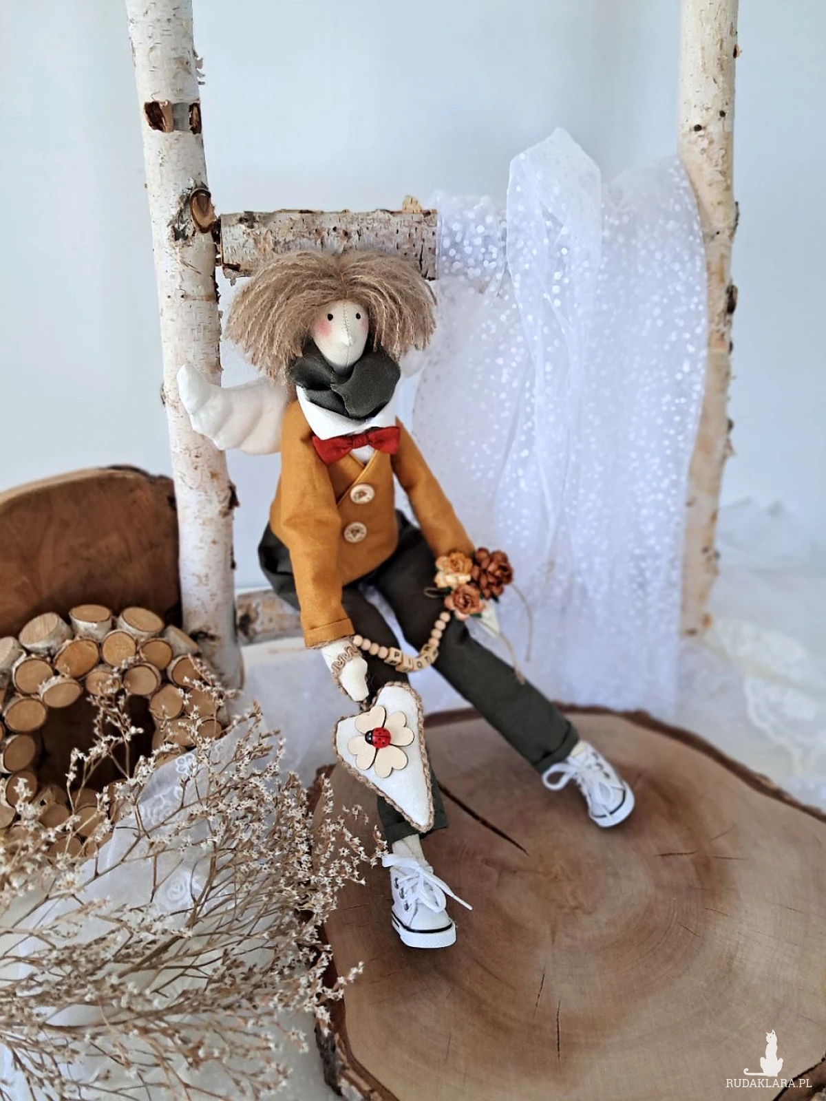 Witam serdecznie. Mam do sprzedania anioła chłopca. Ubranko z wysokogatunkowego lnu: biała koszula, marynarka koloru musztardy, spodnie ciemna zieleń. Pod szyją apaszka i muszka. Guziki drewniane. Skrzydła i serduszko również uszyte z lnu. Serduszko udekorowane koniczynką czterolistną i biedroneczką. Na stópkach białe trampki. Włosy z wełny koloru brązowego. Imię koralikowe zmienię stosownie do potrzeby (proszę o wiadomość w tym zakresie)Wysokość 47 cm. Może siedzieć lub być zawieszony.
