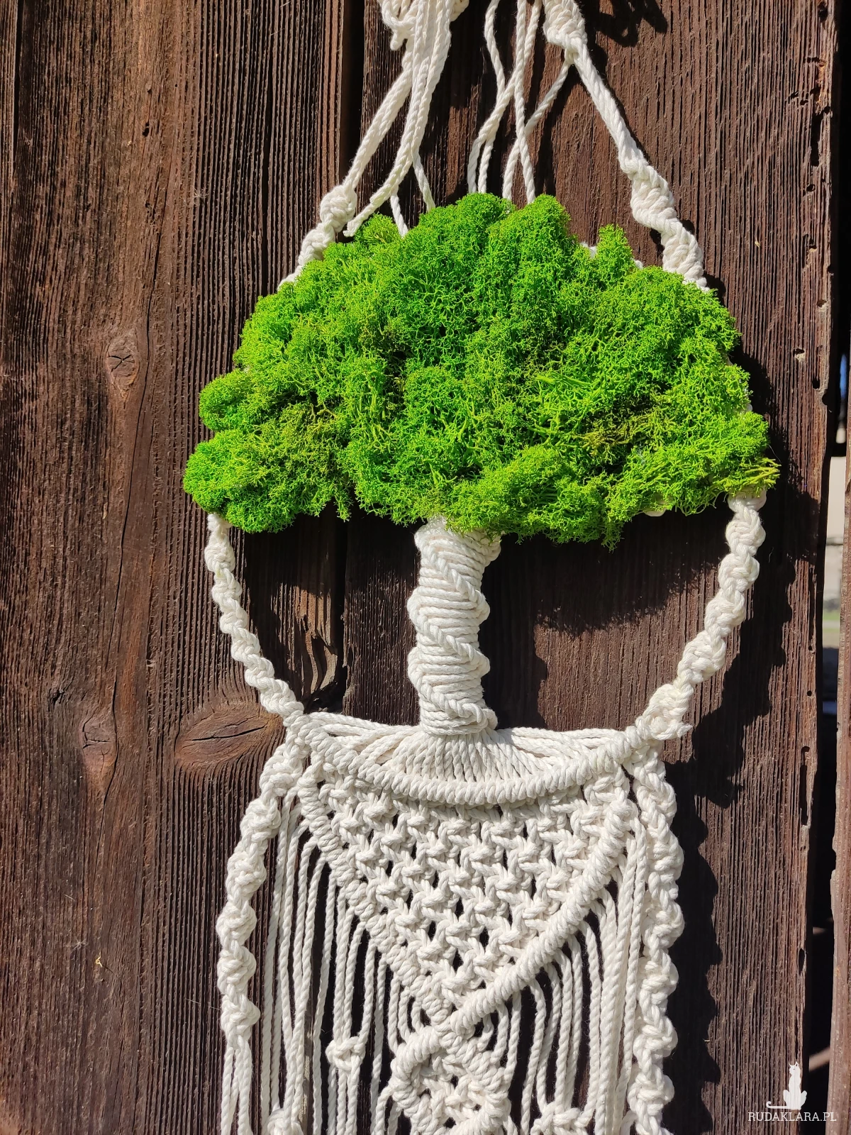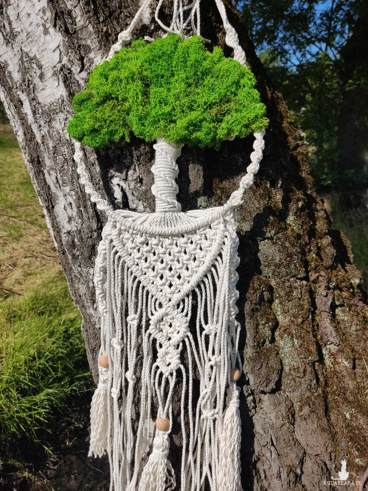 Sprzedam ręcznie wykonane drzewko metodą makramy z chrobotkiem. Drzewko zostało wyplecione ze sznurka 3 PLY w kolorze naturalnym z dodatkiem drewnianych koralików. Całkowita długość z drzewka wynosi 80cm, średnica koła 25 cm.