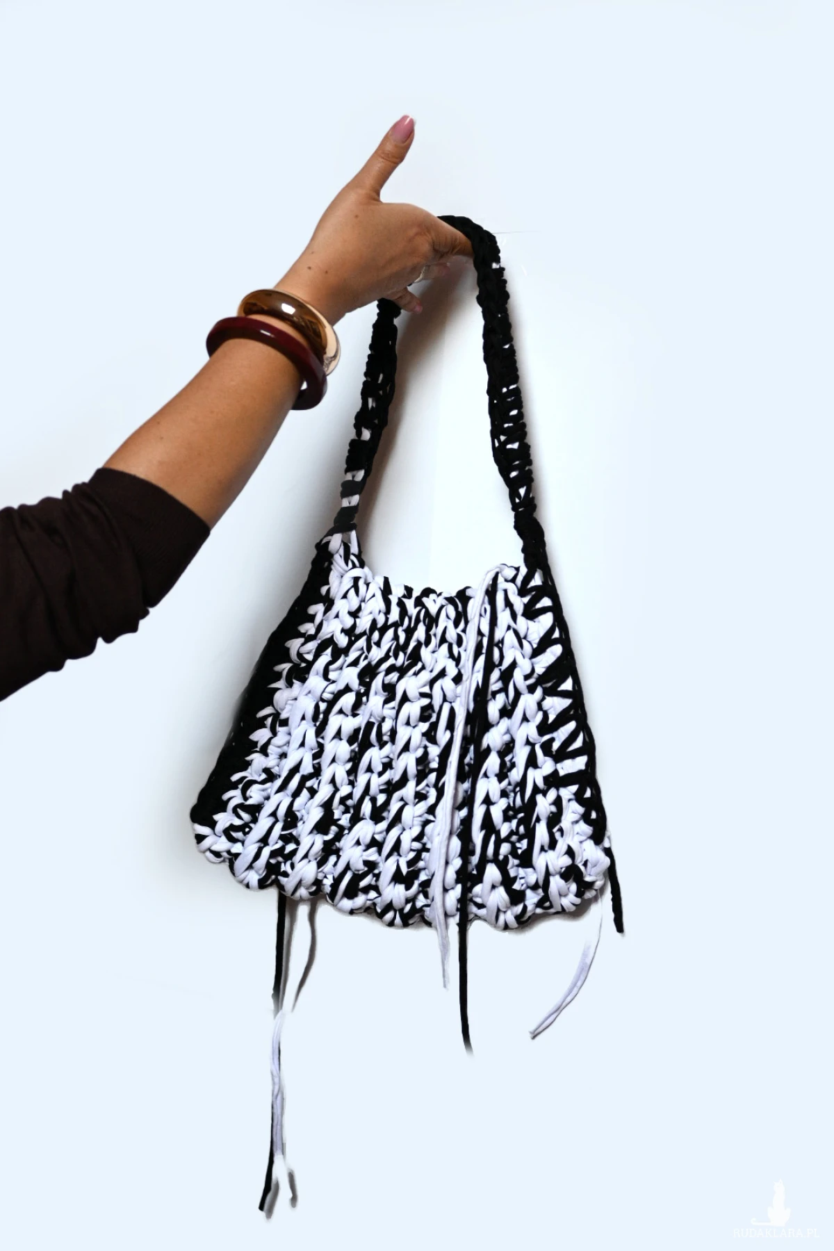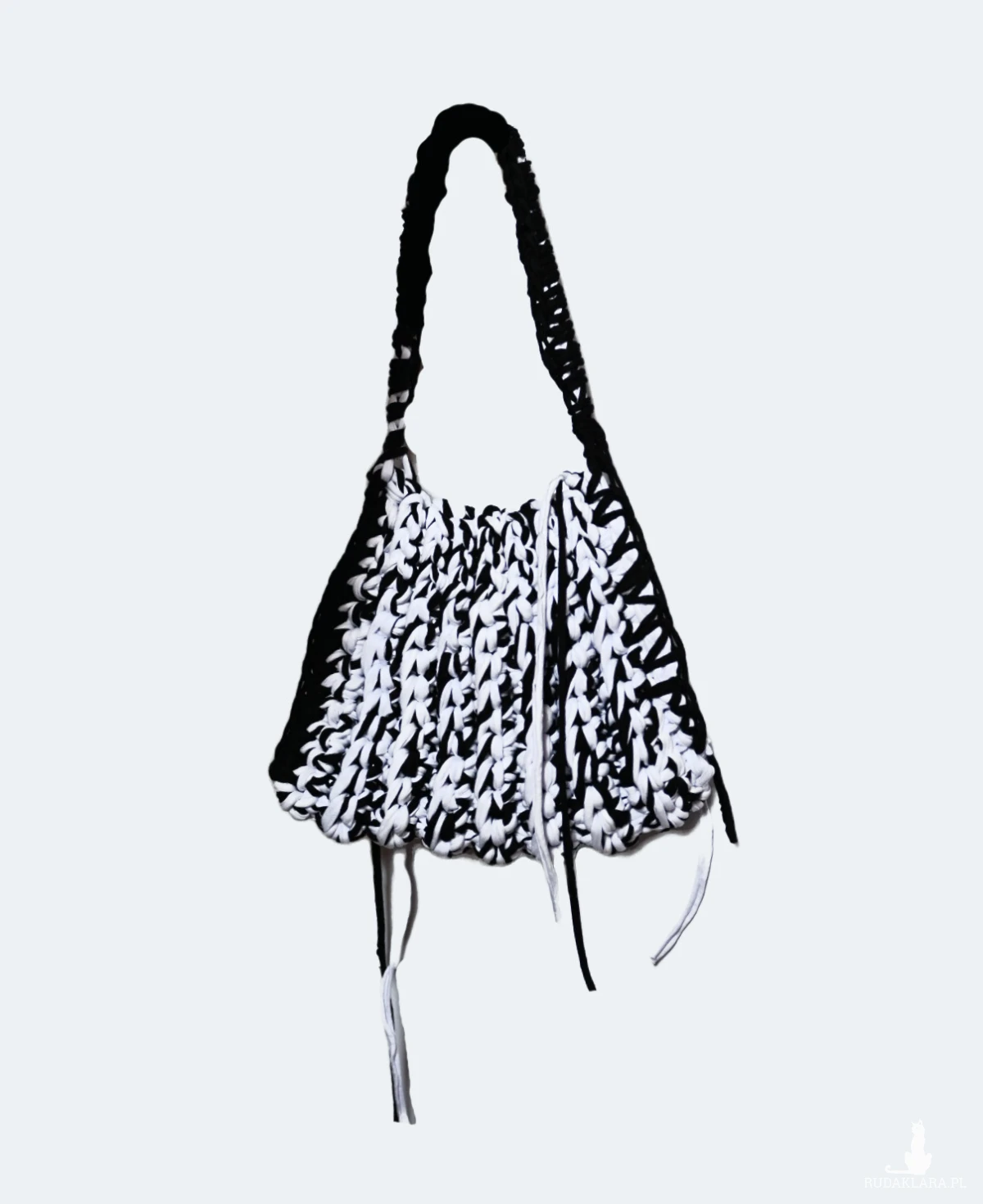 Ręcznie wykonana torba na szydełku z materiałów w 100% pochodzących z recyklingu. Każda sztuka to unikat, niepowtarzalna pod względem układu kolorów i faktury.