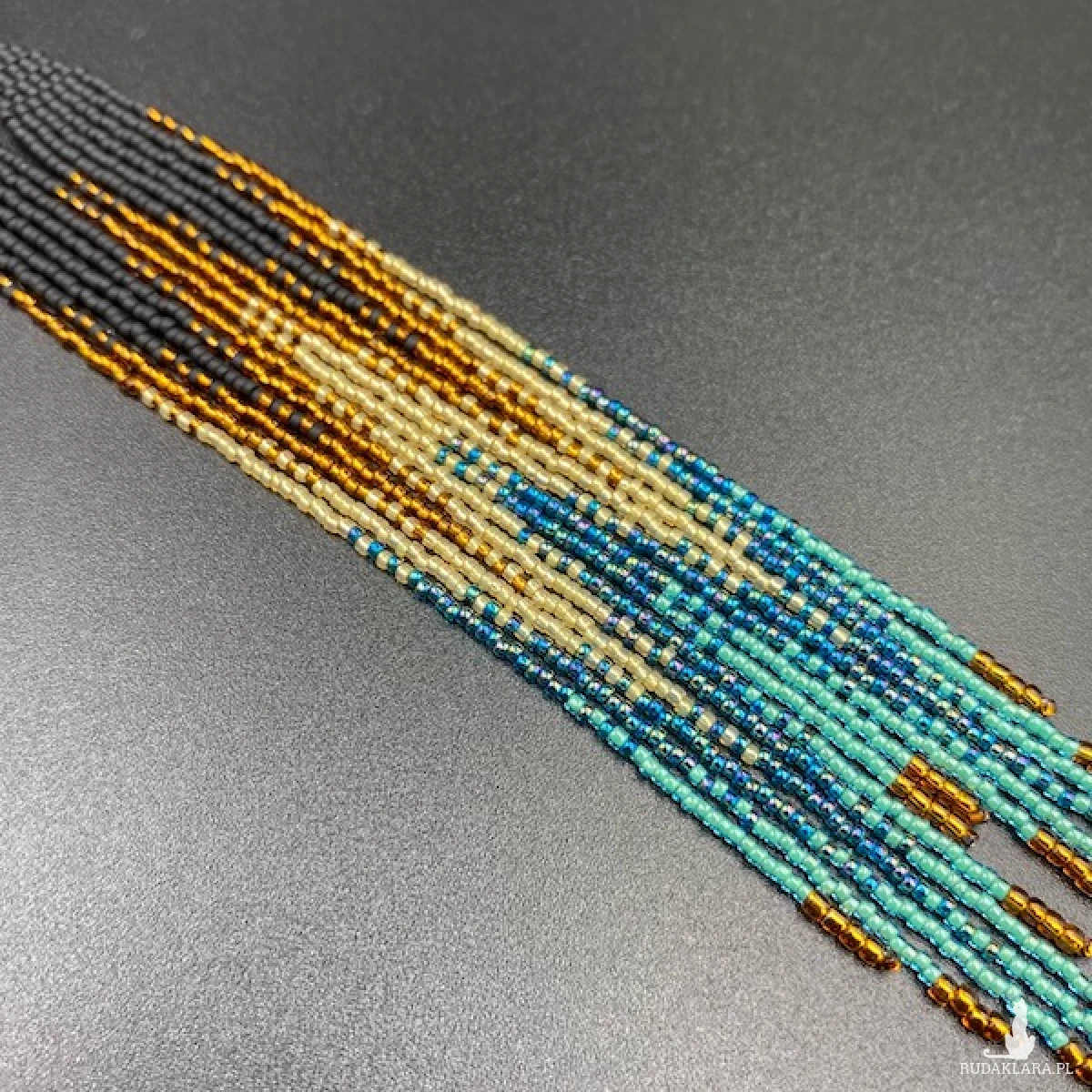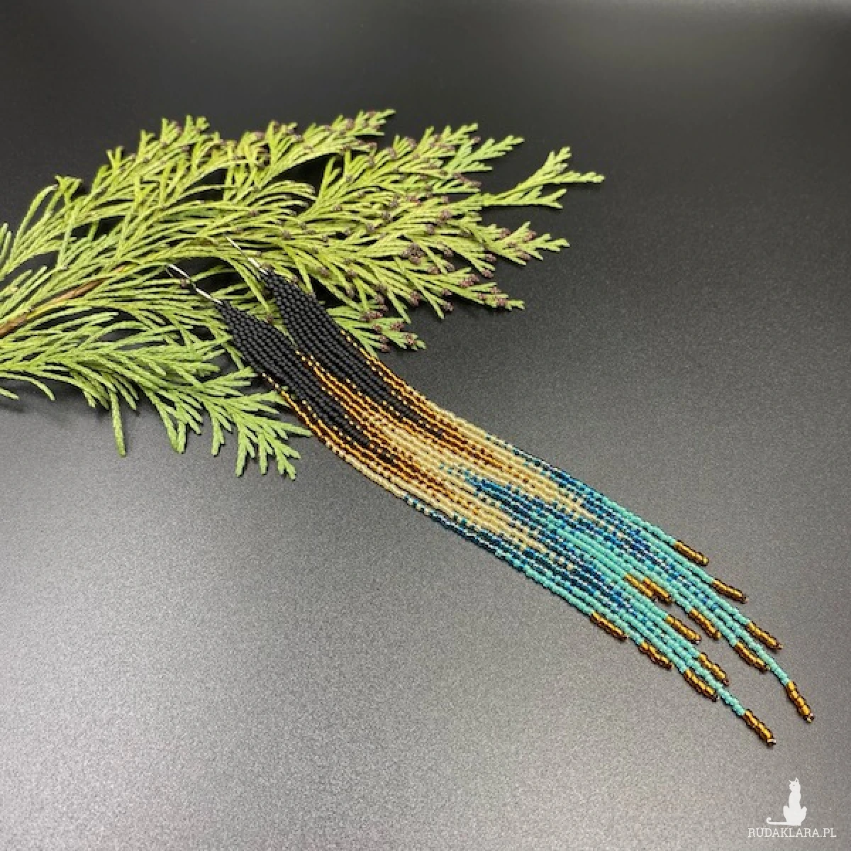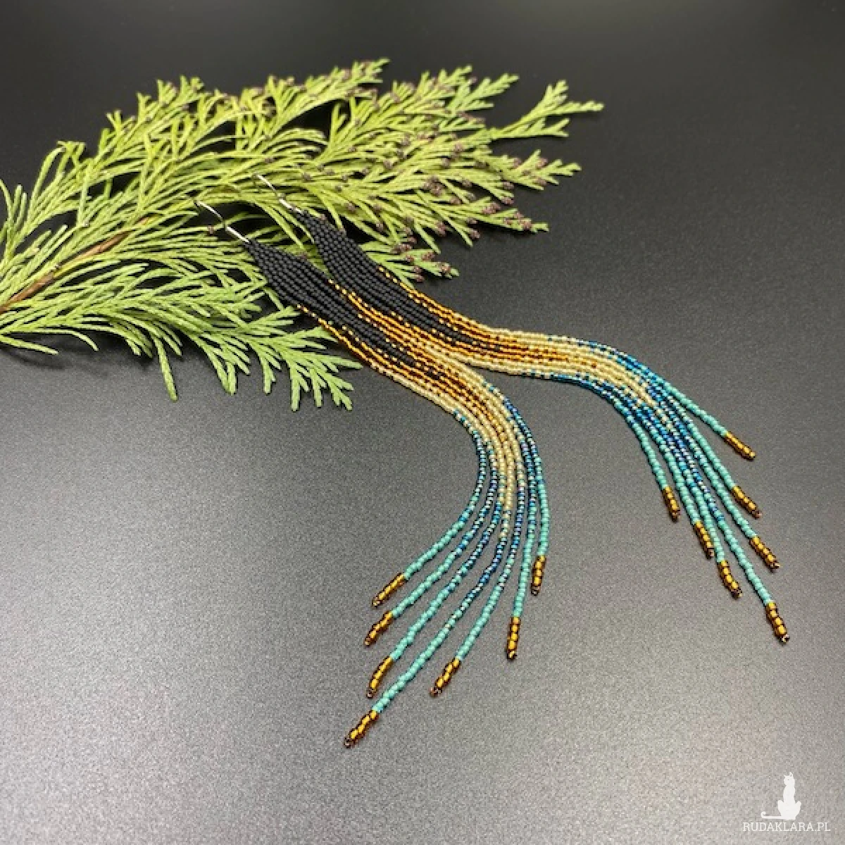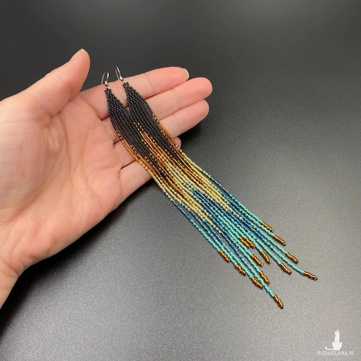 Bardzo długie i wąskie kolczyki do ramion z efektem cieniowania, zostały wykonane z najmniejszych na rynku koralików Toho 15. W 100% utkane ręcznie i z największą starannością.