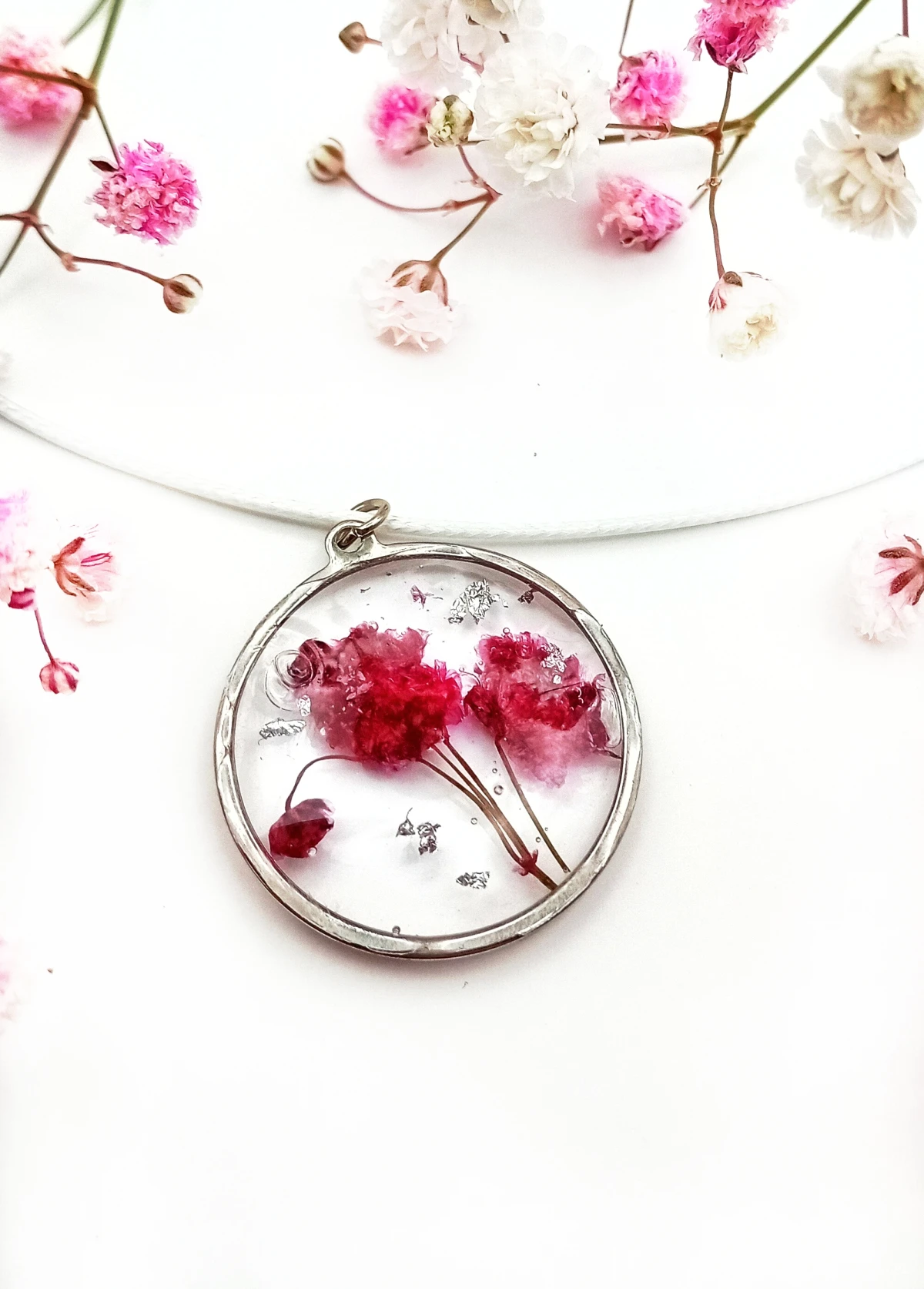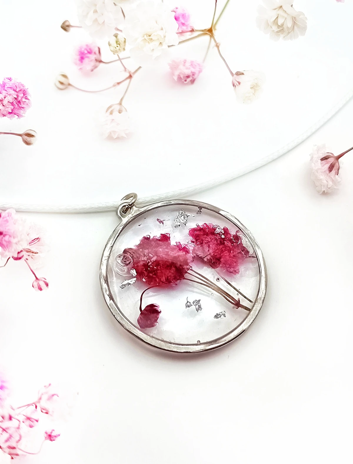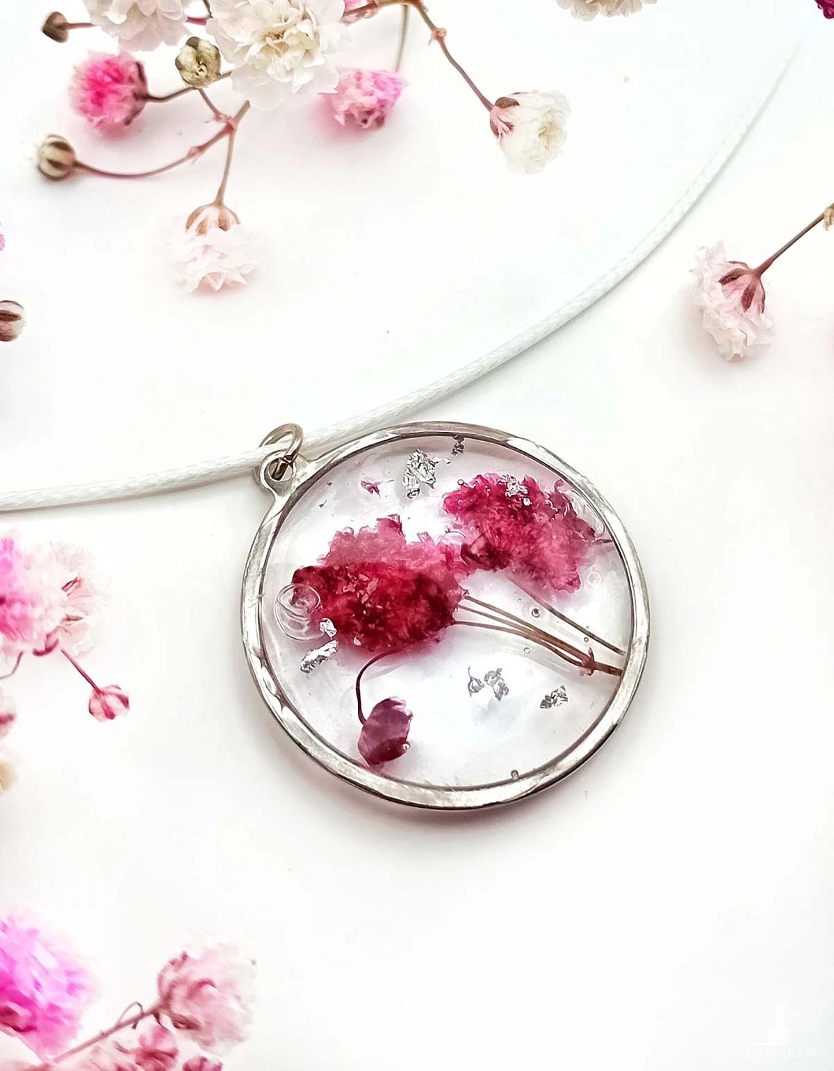 Zawieszka: Ręcznie wykonana z żywicy UV, ozdobiona suszoną fioletową gipsówką oraz srebrnymi drobinkami, zamknięta w okrągłej bazie w kolorze srebra