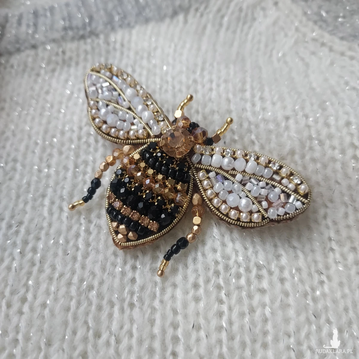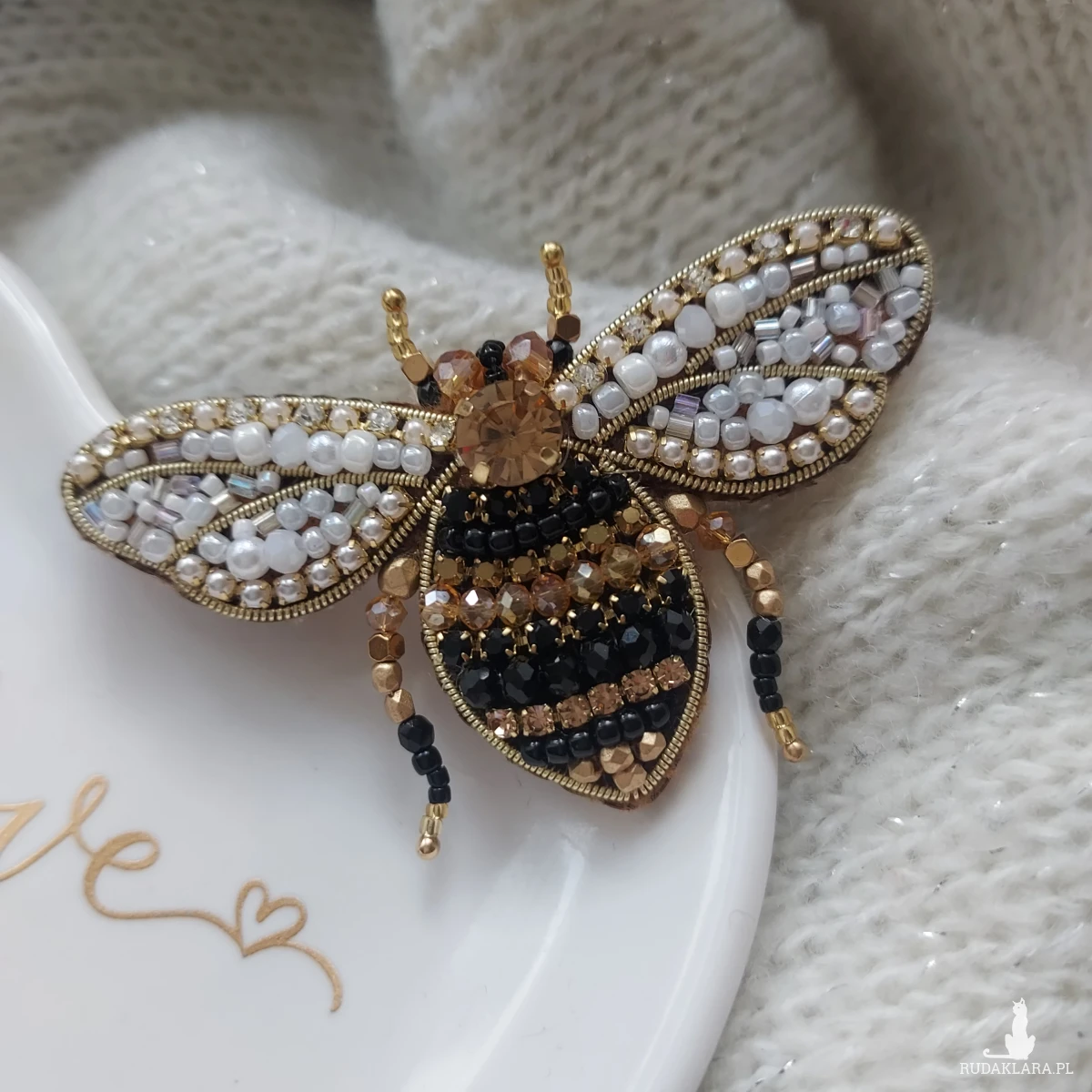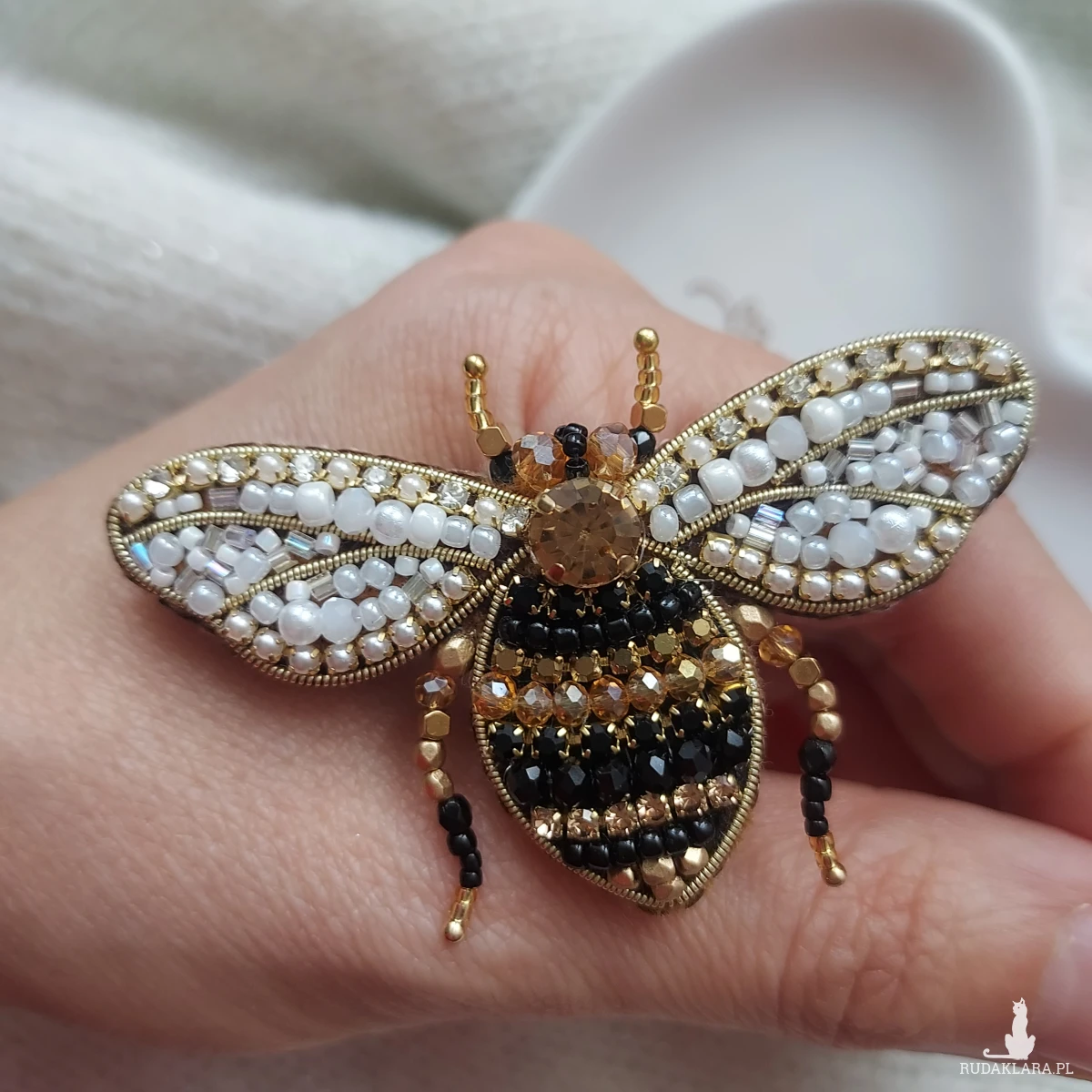 Perłowo-złoto-brązowa broszka pszczoła wykonana techniką haftu koralikowego to idealny dodatek biżuteryjny dla osób ceniących nie tylko estetykę, ale także otaczającą nas przyrodę!
