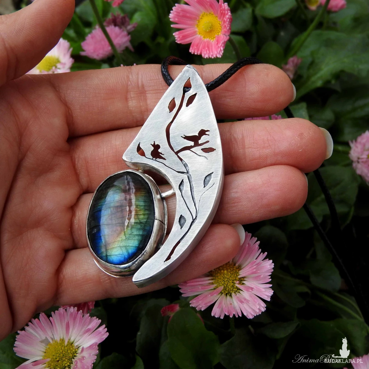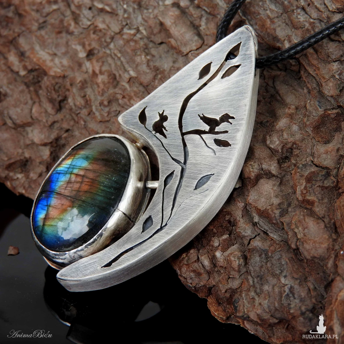 wisior powstał ze srebra próby 925 i 999. Kolorowemu labradorytowi, iryzującemu