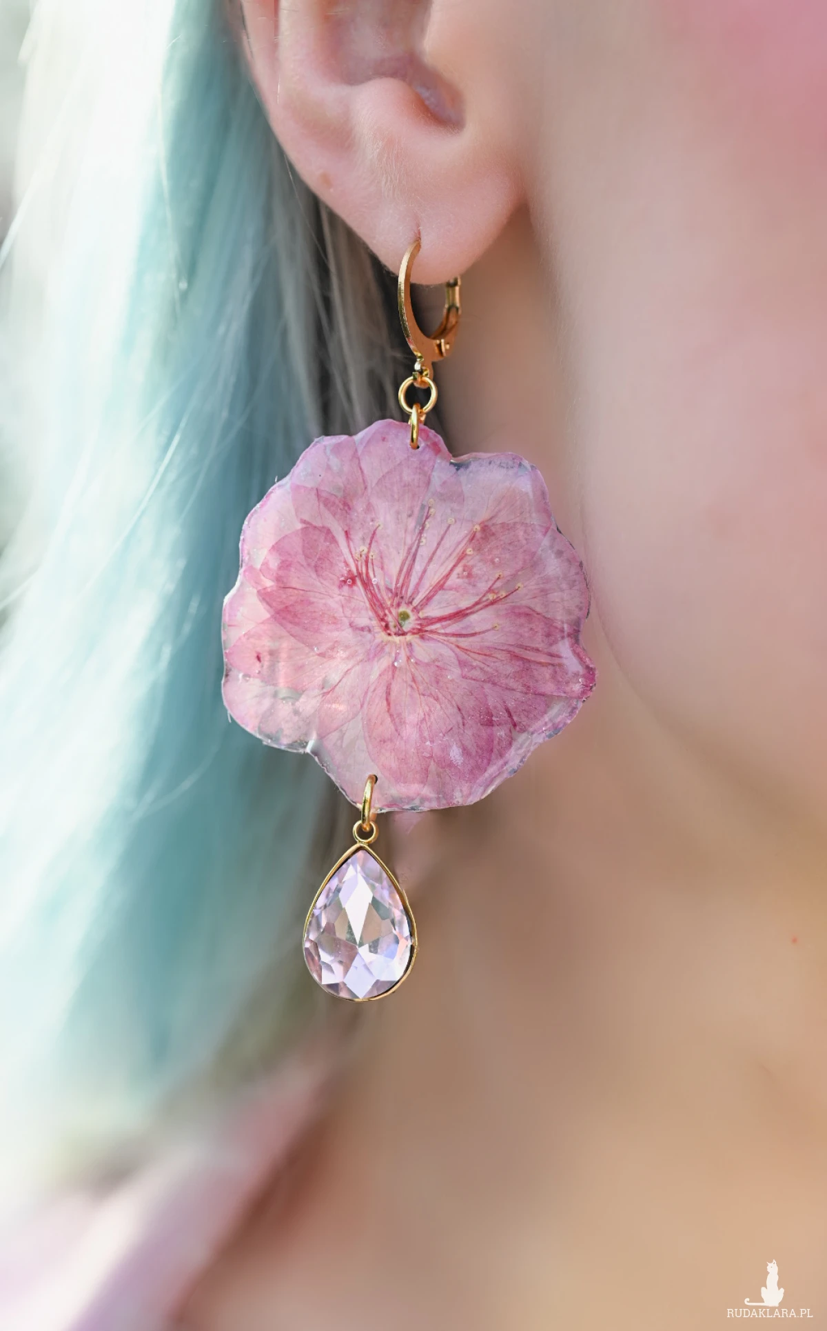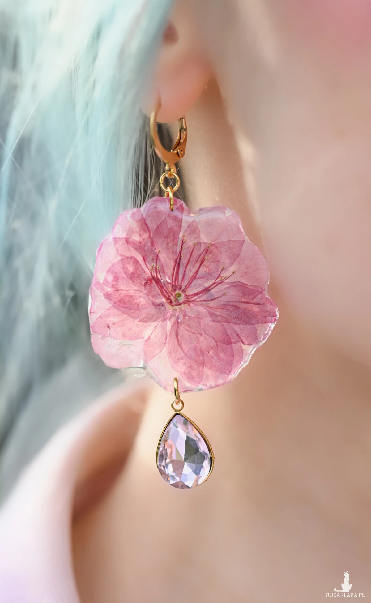 Delikatne, długie kolczyki z prawdziwym kwiatem wiśni zatopionym w krystalicznie czystej żywicy.