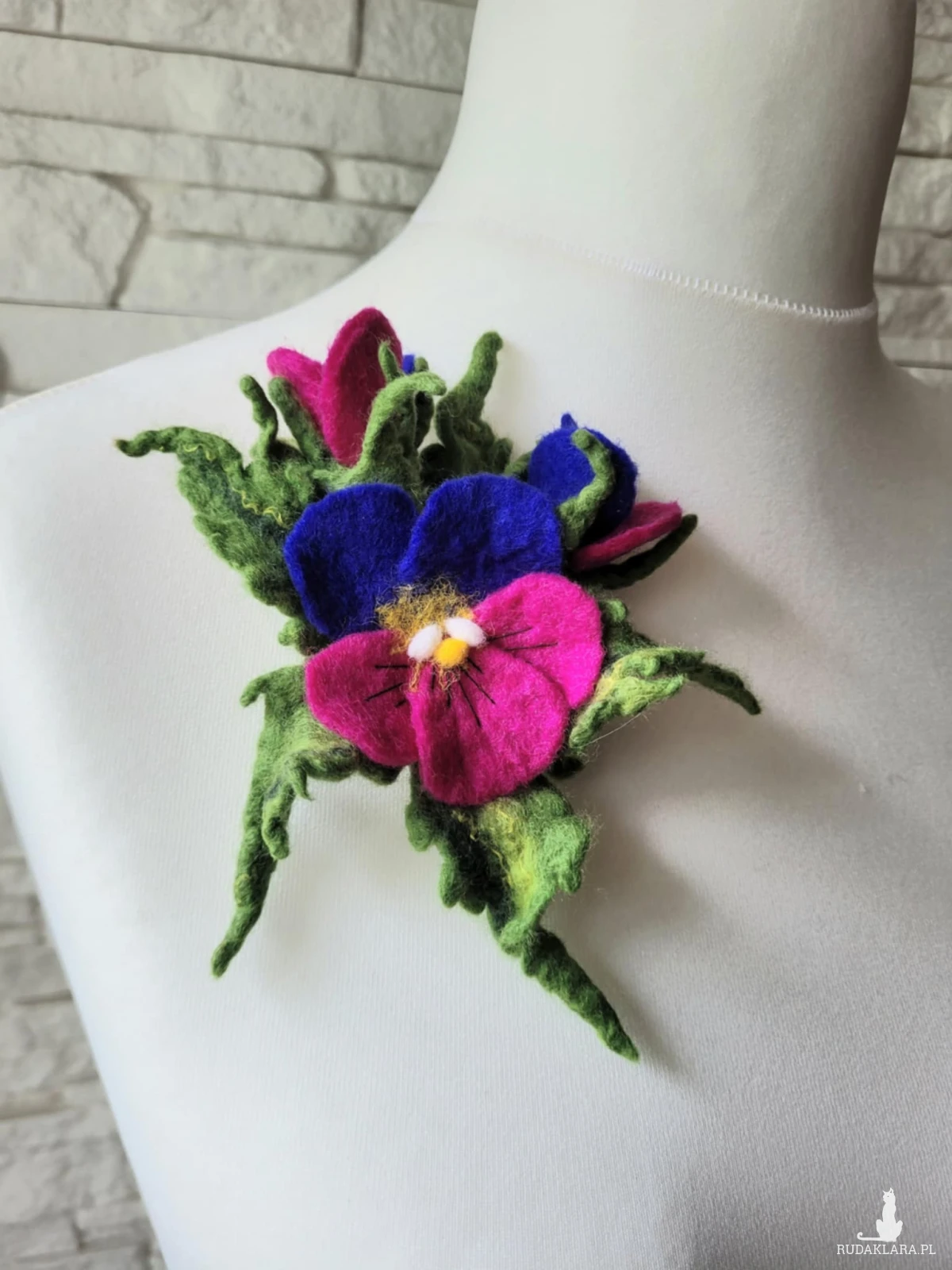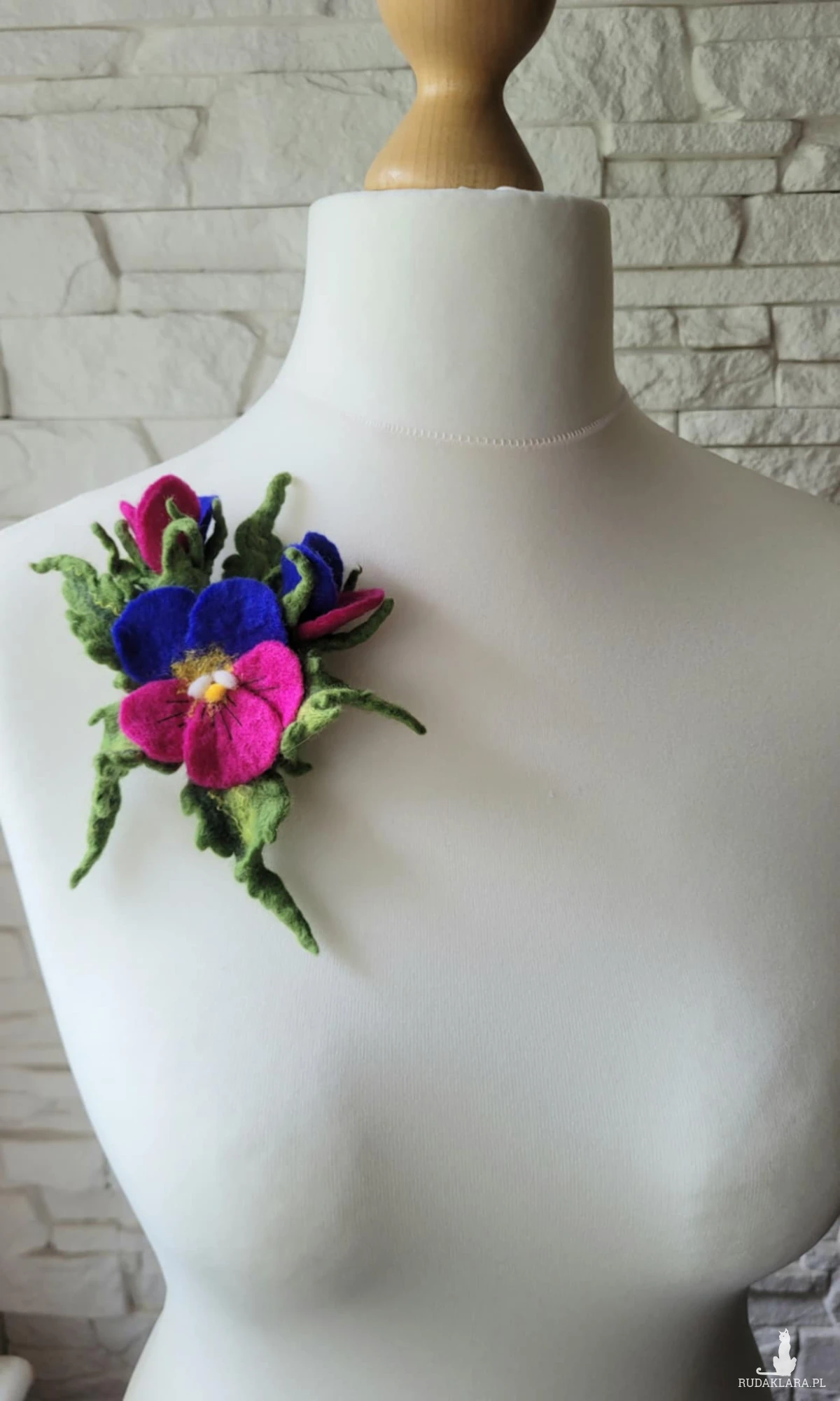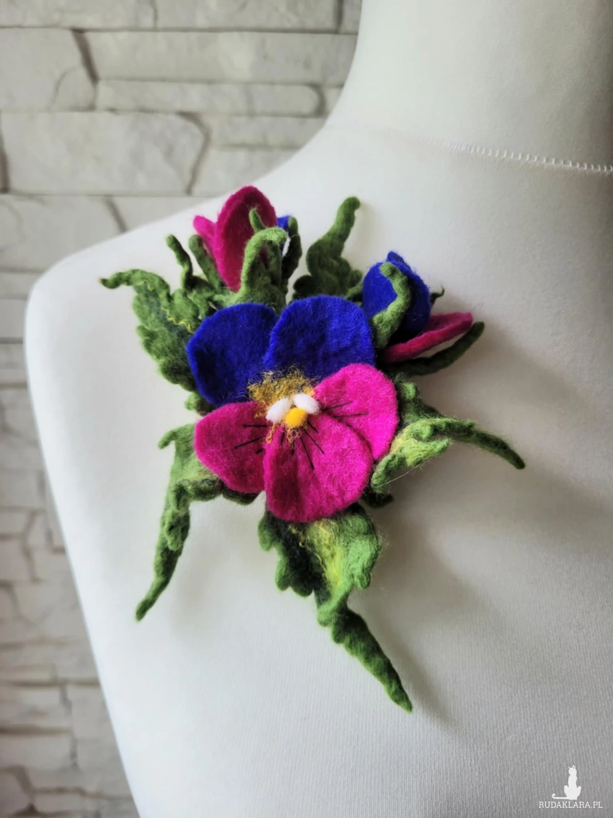 Broszka bratek wykonana techniką filcowania na mokro z wełny merynosów australijskich.