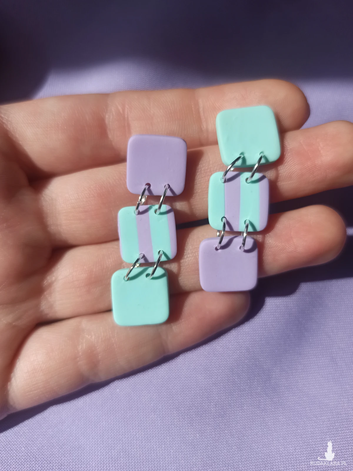 Kolczyki sztyfty w kształcie połączonych ze sobą trzech kwadratów fioletowy miętowy i w paski