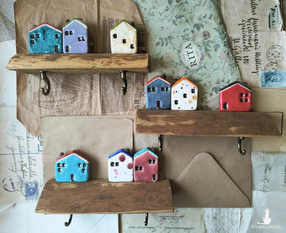 Stylizowany wieszak na drewnianym obladrze o wymiarach 19 cm x 10 cm, na 2 mosiężne haczyki, ozdobiony ceramicznymi domkami, wykonanymi z gliny ceramicznej. Dodatki zostały wypalone zostały na biskwit, a następnie poszkliwione w temperaturze 1260 stopni C. Z tytułu wygodne mocowanie w postaci zawieszek. Serdecznie polecam!!!