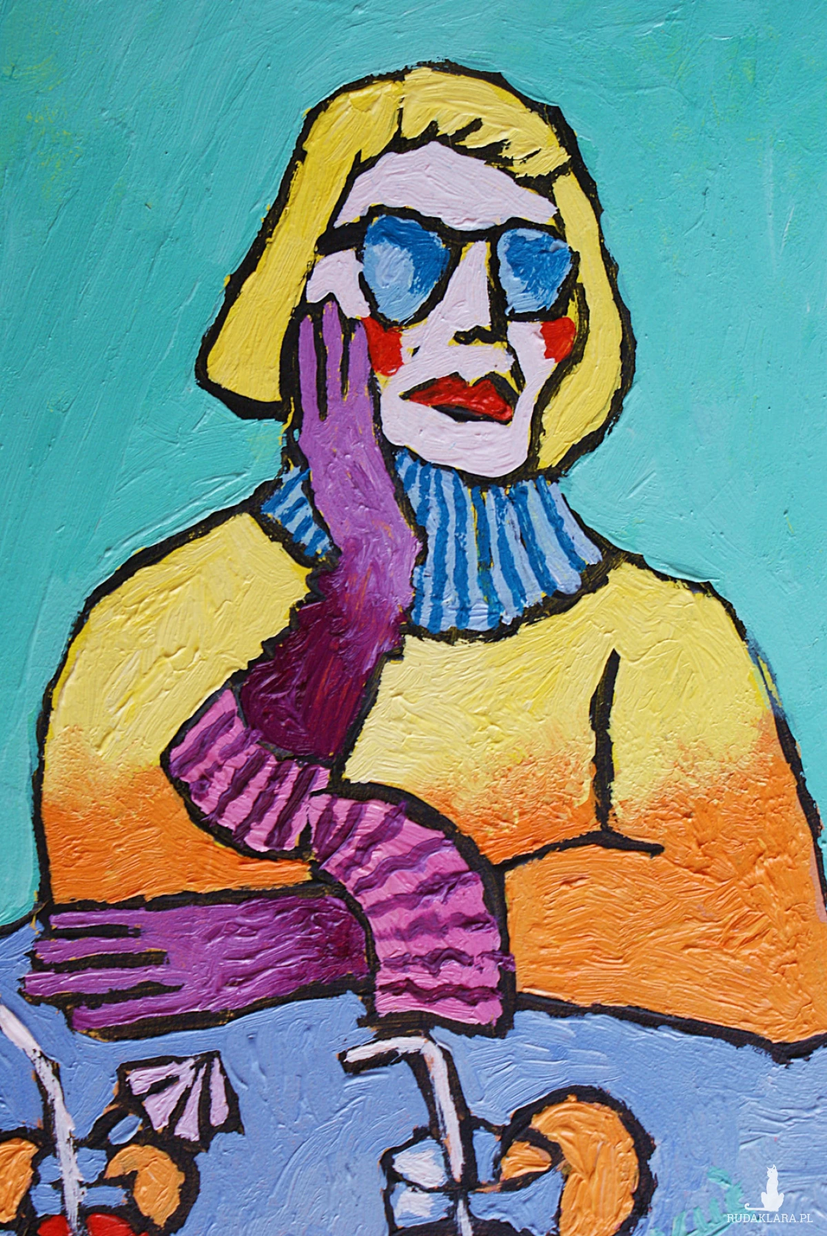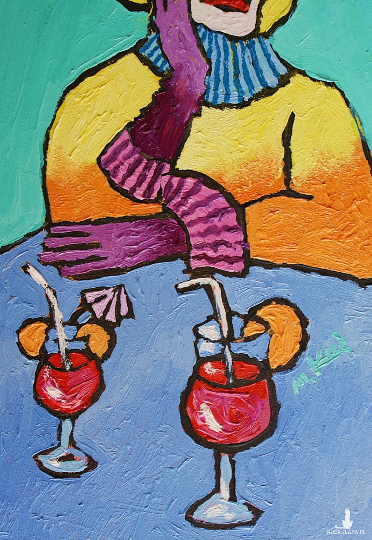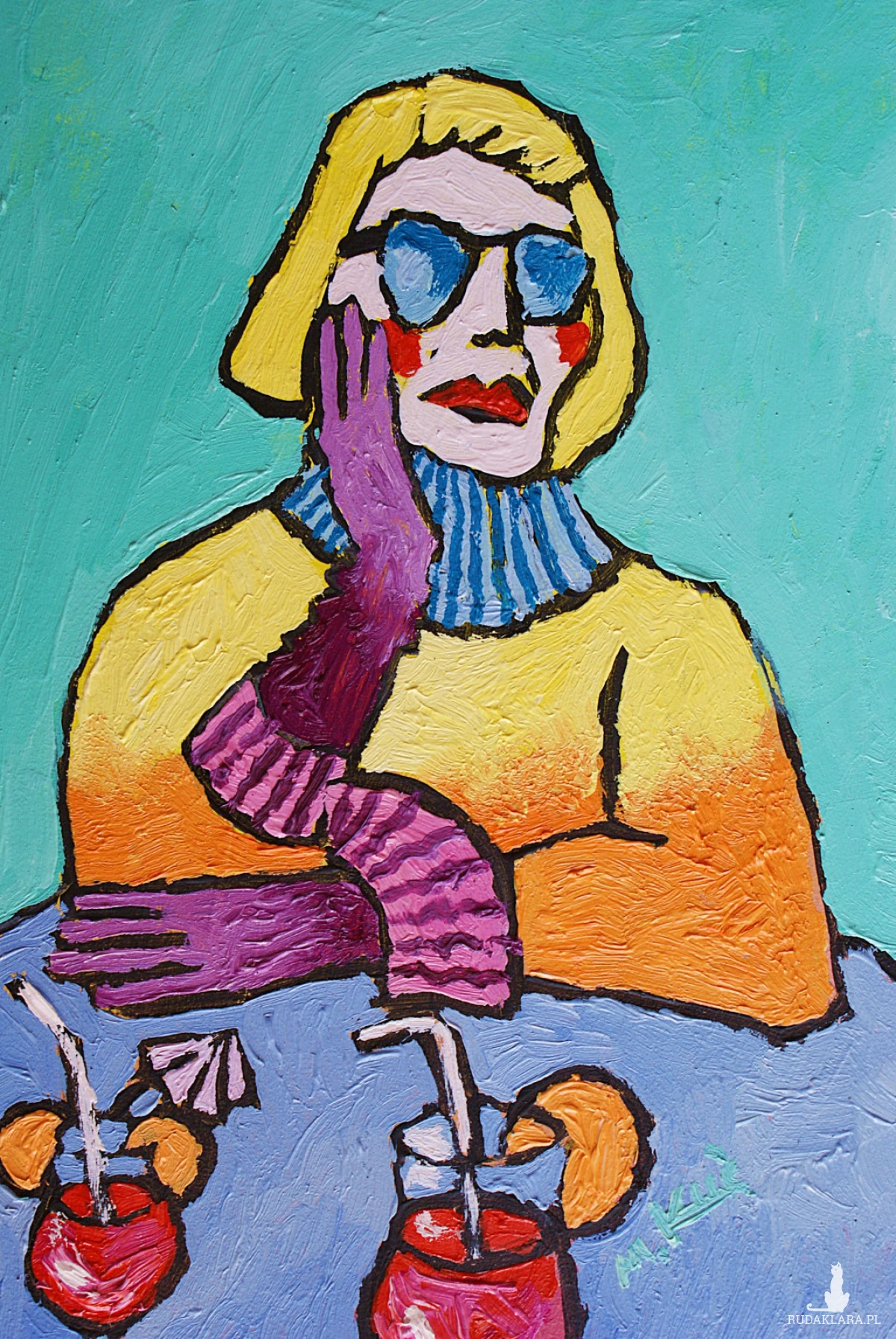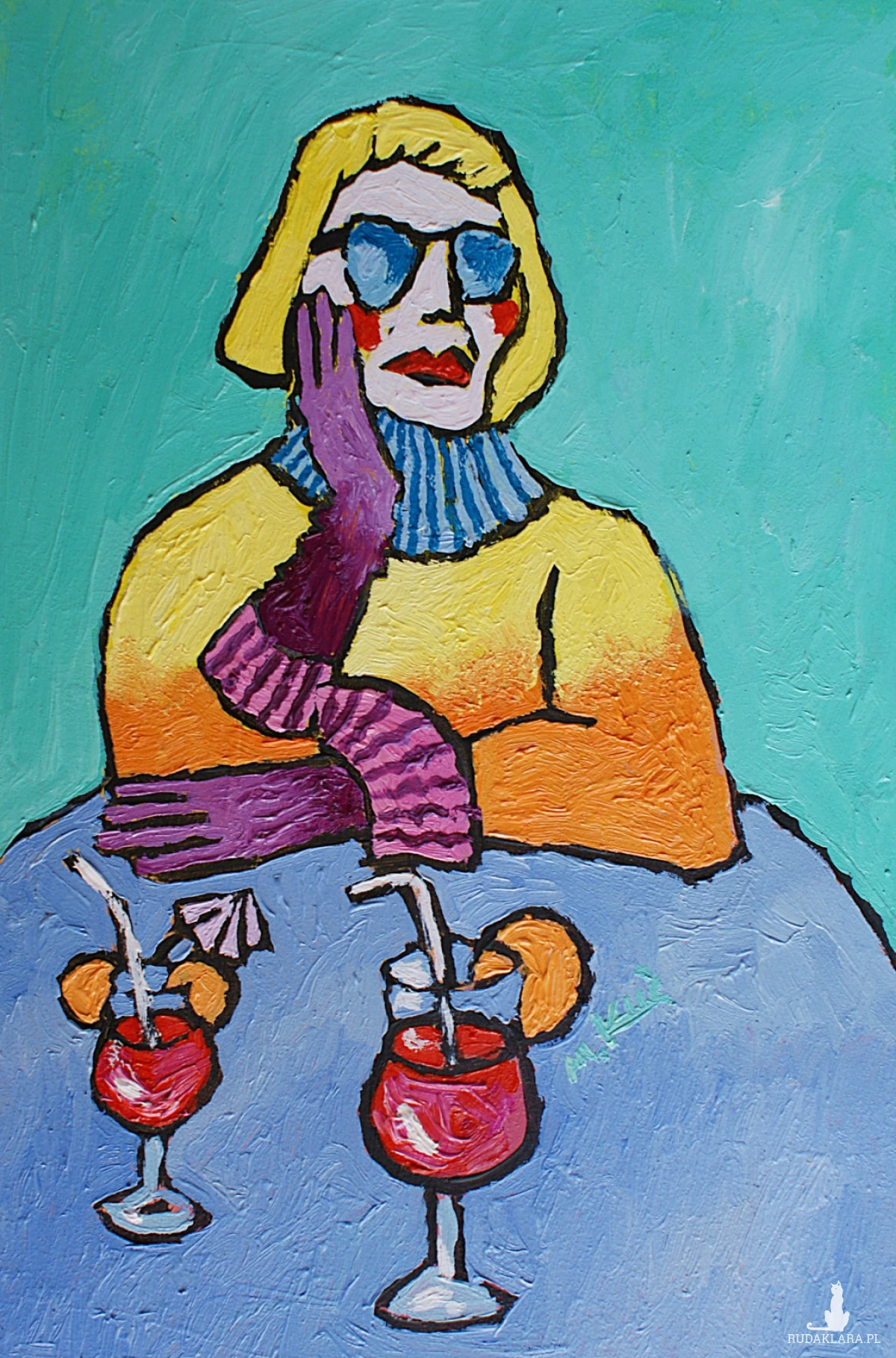 Na obrazie widać kobietę siedzącą przy stoliku, która wygląda jakby była zatopiona w myślach. Jej blond włosy są kontrastowo zestawione z turkusowym tłem, a intensywne kolory stroju przyciągają wzrok. Czerwone usta i okulary nadają jej tajemniczości, jakby coś ukrywały. Na stole stoją dwa drinki z kolorowymi parasolkami. Całość kompozycji sprawia wrażenie, jakby czas się zatrzymał w tym jednym momencie. Technika użyta przez artystę jest odważna, z szerokimi pociągnięciami pędzla i fakturą, która dodaje obrazu dynamiki. Można odczuć tu nonszalancję i pewien rodzaj nostalgii. Emanuje z tego spokój, ale i lekka melancholia. Ale fajne kolory! – powiedziałby młodszy widz, zachwycony intensywnością barw. Ten obraz jest jakby wyjęty z marzeń, trochę surrealistyczny, trochę pop-artowy. Słowo vibe doskonale oddaje klimat tego dzieła. Na końcu pozostaje wrażenie, że obraz ten opowiada jakąś niewypowiedzianą historię, którą każdy może interpretować na swój sposób.