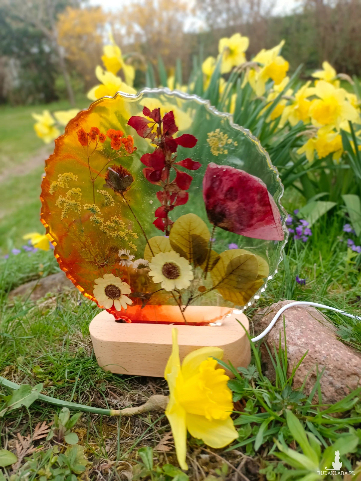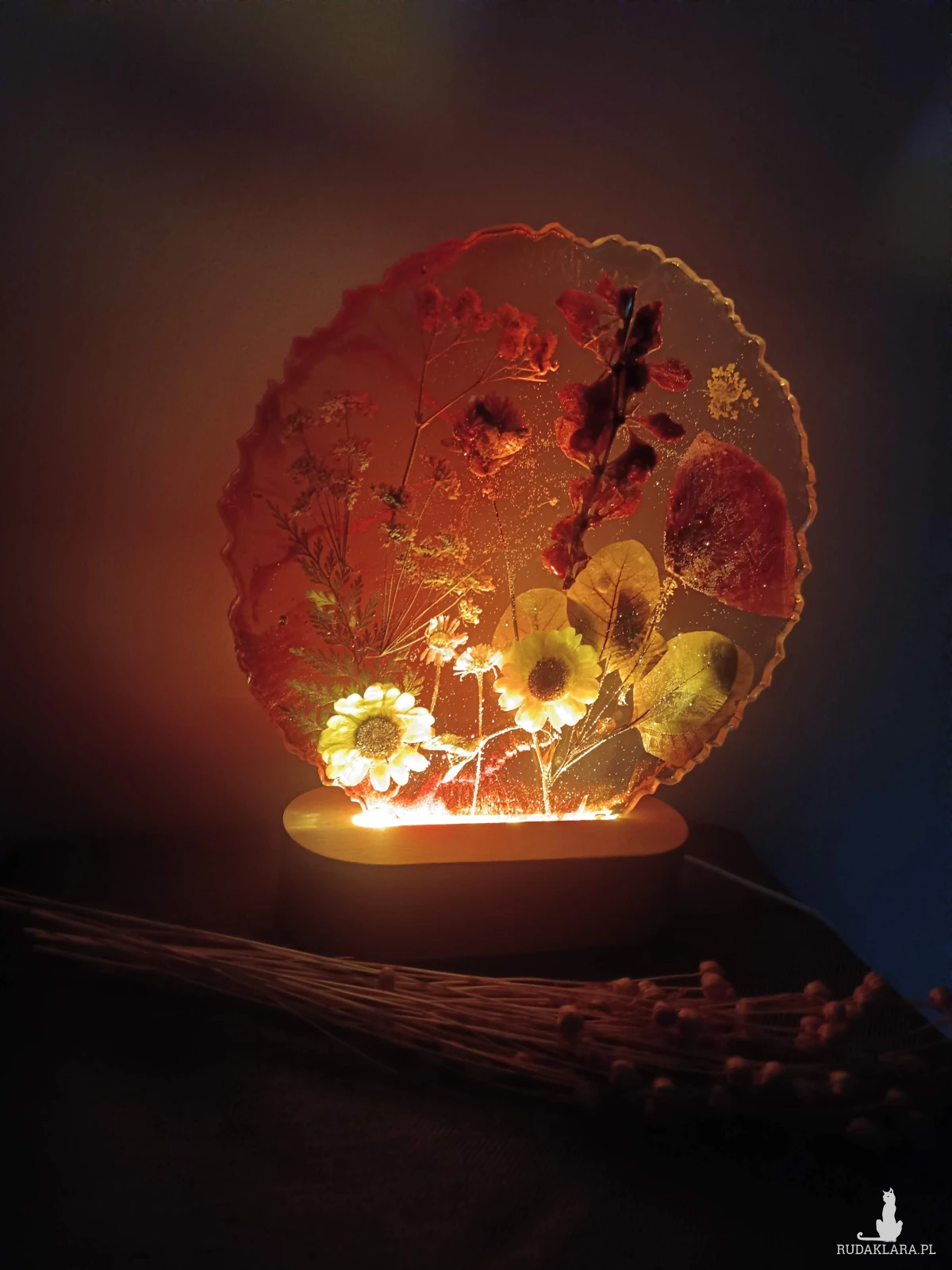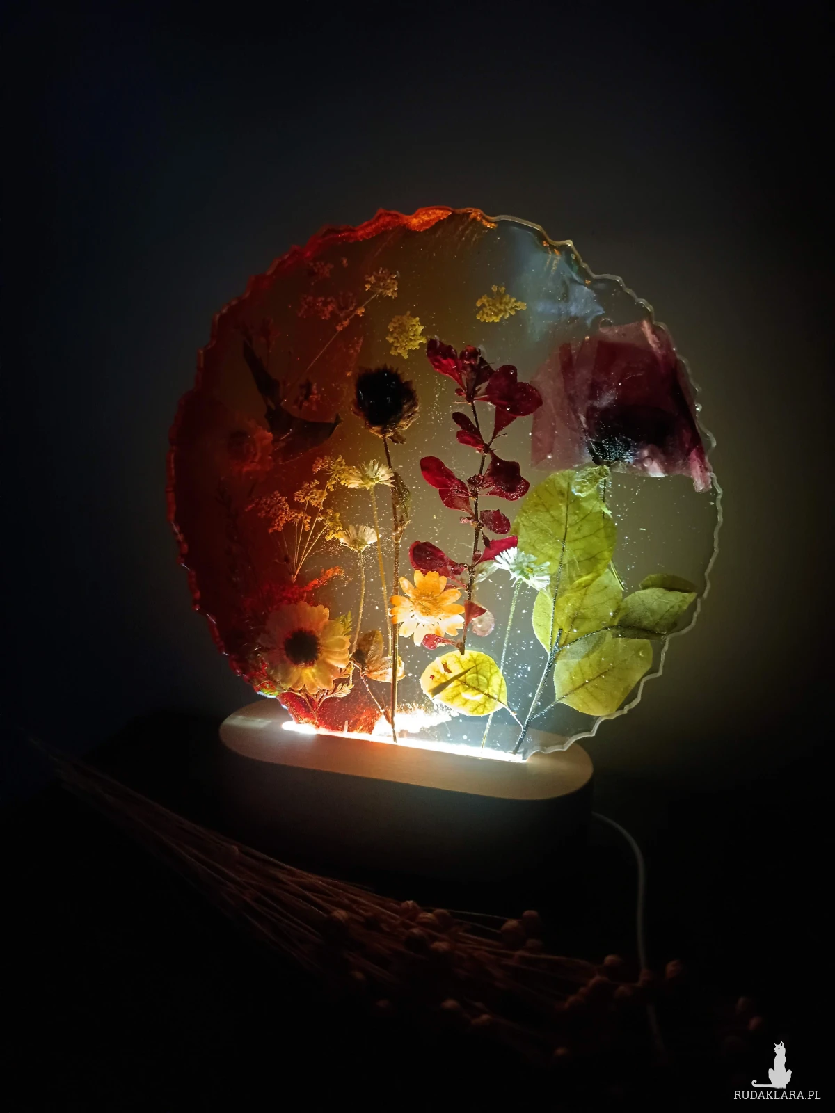 Lampka zasilana przewodem USB, daje subtelne światło rozświetlające zatopione w żywicy kwiaty.