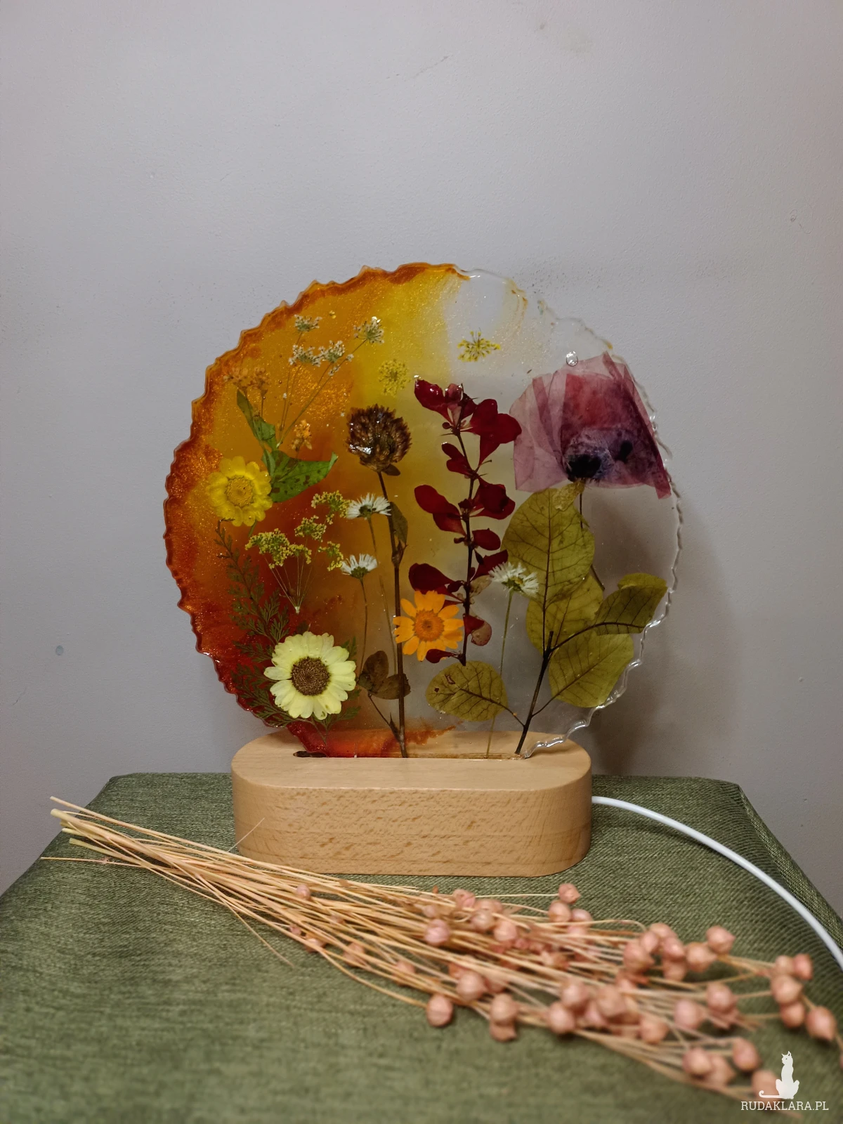Lampka LED z autorską kompozycją z suszonych kwiatów - tonacja pomarańczowa/bursztynowa