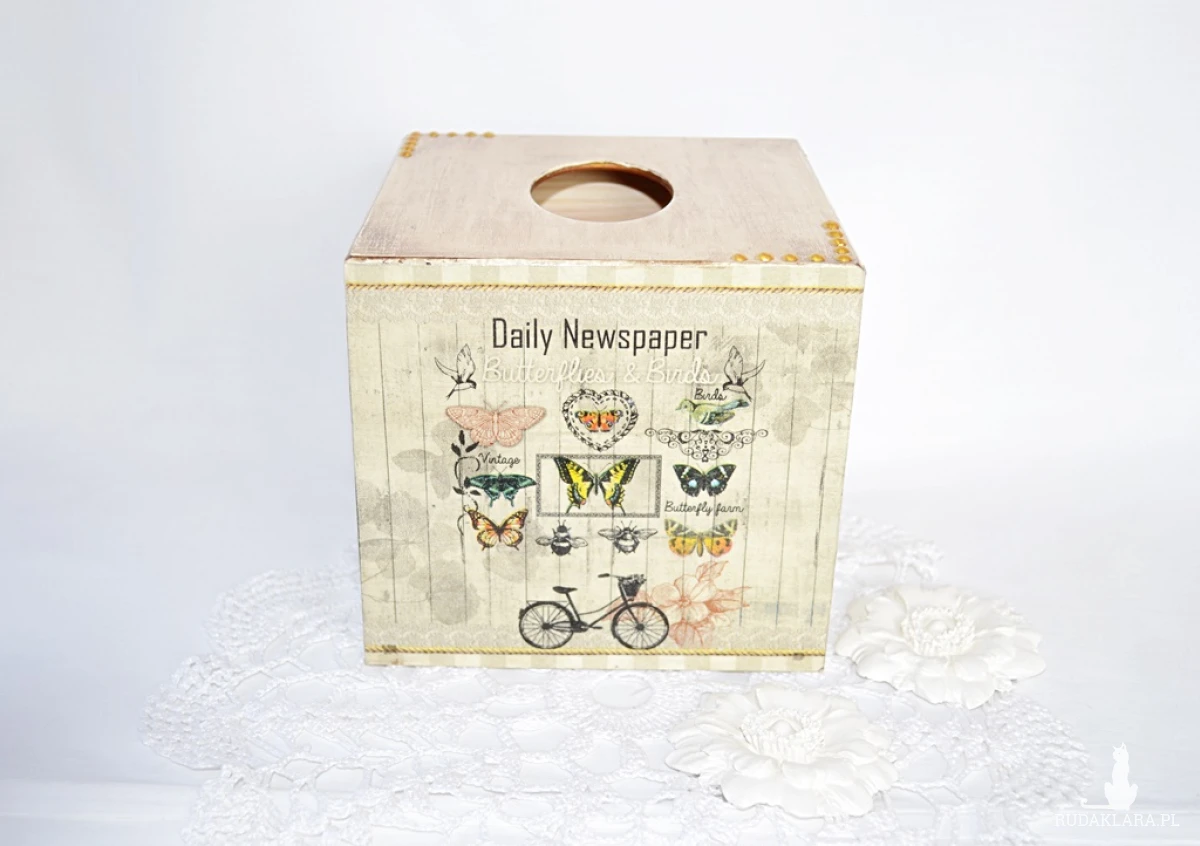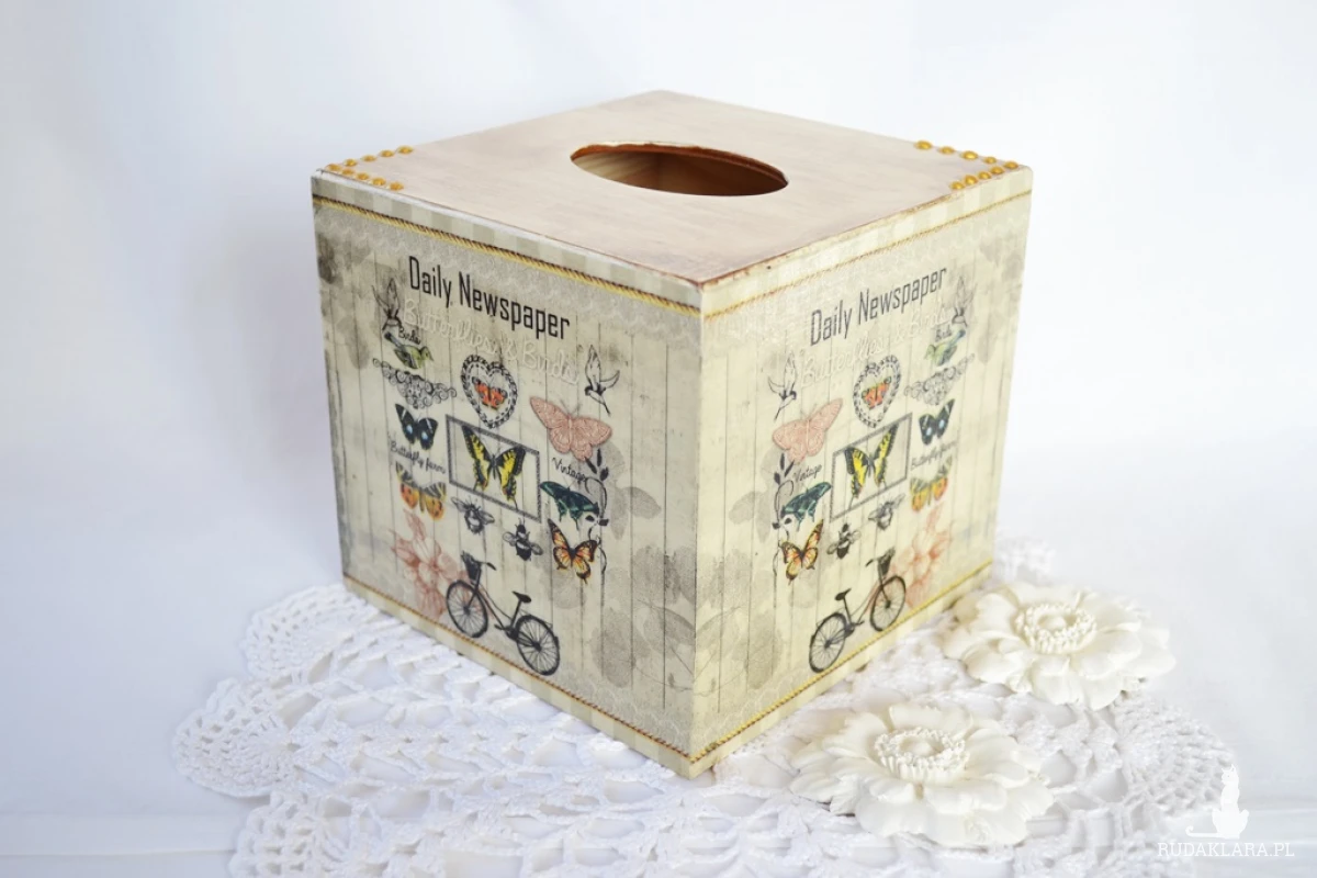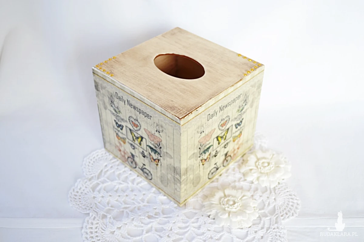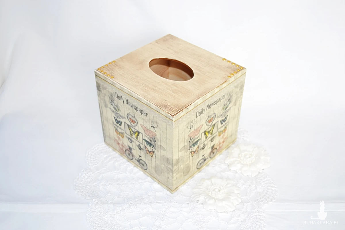 Oryginalny drewniany chustecznik w kolorach brązu i beżu zdobiony metodą decoupage. Chustecznik jest zabezpieczony lakierem bezbarwnym