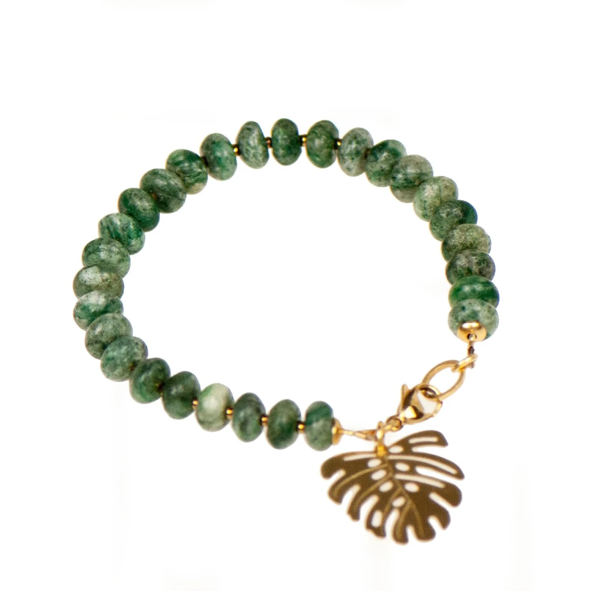 Zielona bransoletka została stworzona ręcznie z zielonych jaspisów i złoconych elementów wykończeniowych. Do złocenia wykorzystano 23 karatowe złoto. Kolor złota został dobrany tak, aby miał kolor mosiądzu. Dzięki temu, nawet jeśli warstwa złota z czasem miejscowo się zetrze na skutek codziennego użytkowania, nie będzie to widoczne, gdyż złoto i mosiądz mają taki sam kolor. Bransoletka została wykończona mosiężną zawieszką w kształcie liścia monstery (bez złocenia). Bransoletka będzie stylowym dodatkiem do stylizacji smart casual lub trafionym prezentem dla bliskiej osoby.
