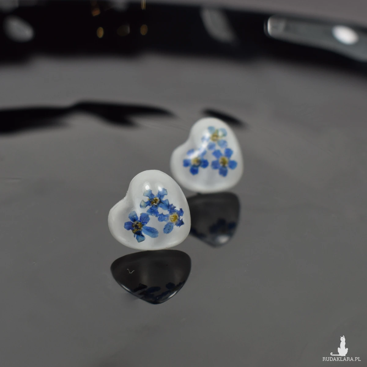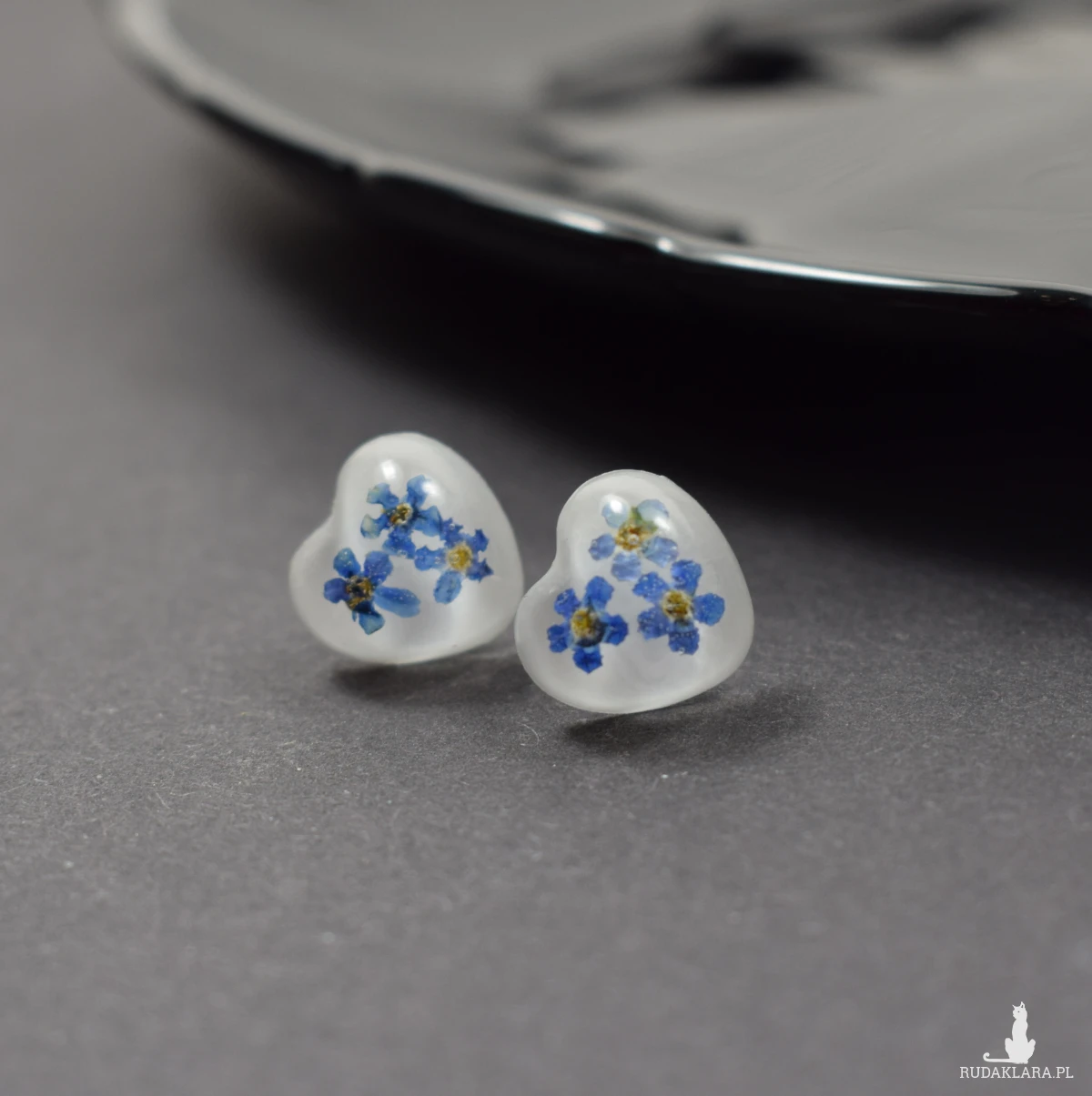 Niewielkie kolczyki sztyfty z prawdziwymi niezapominajkami zatopionymi w żywicy.