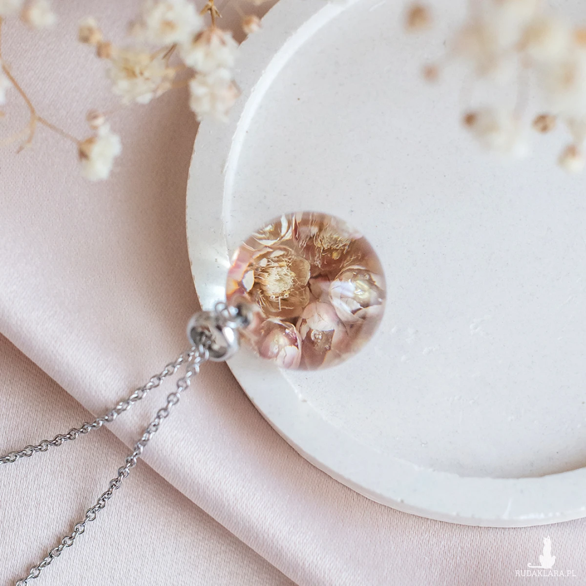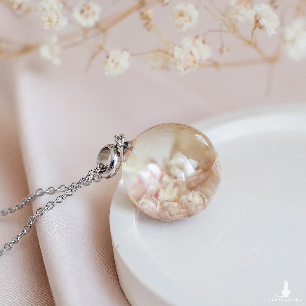 Wisiorek wykonany jest z żywicy epoksydowej z wykorzystaniem suszonych kwiatów. Metalowe elementy to stal nierdzewna szlachetna chirurgiczna.