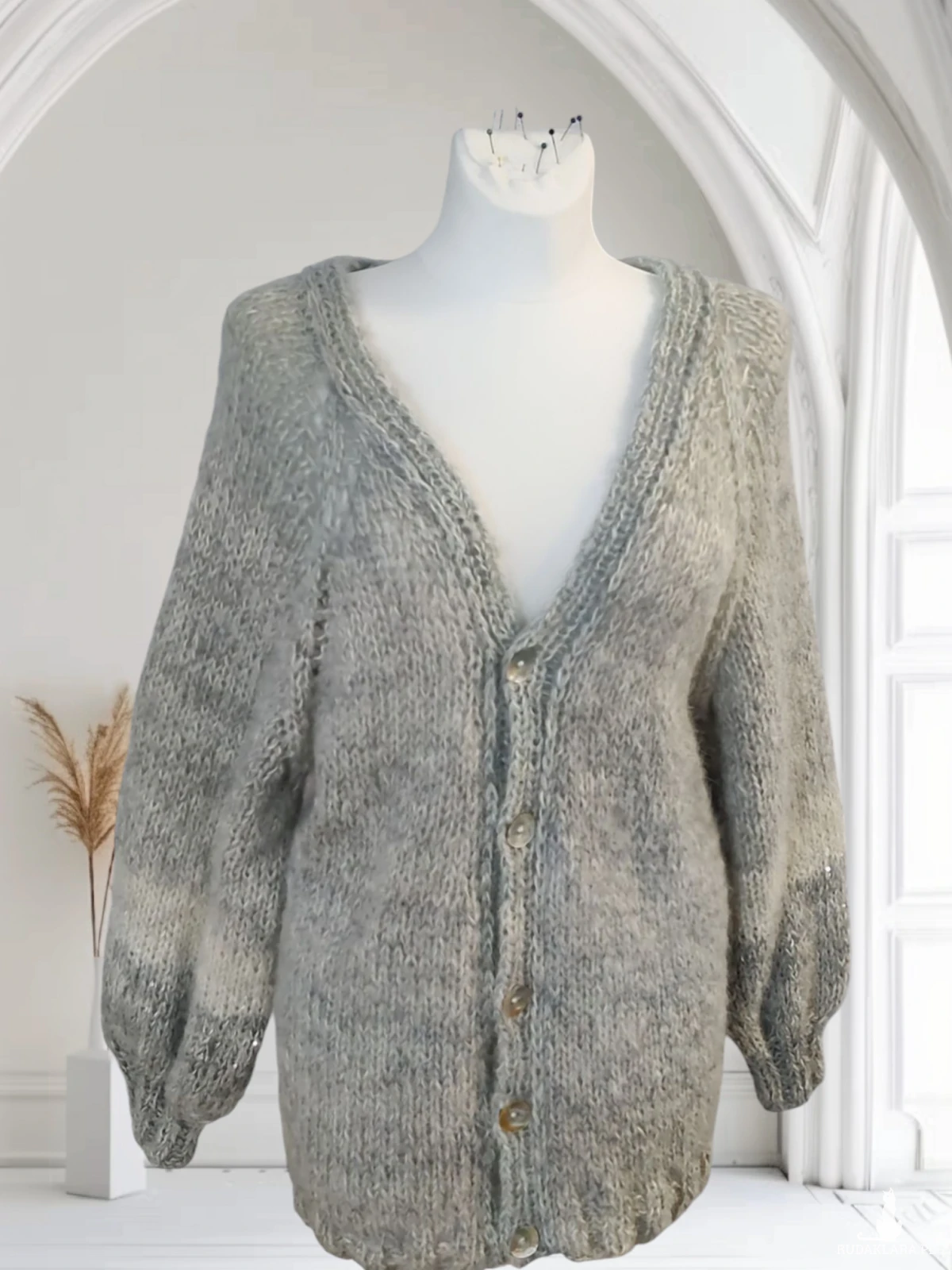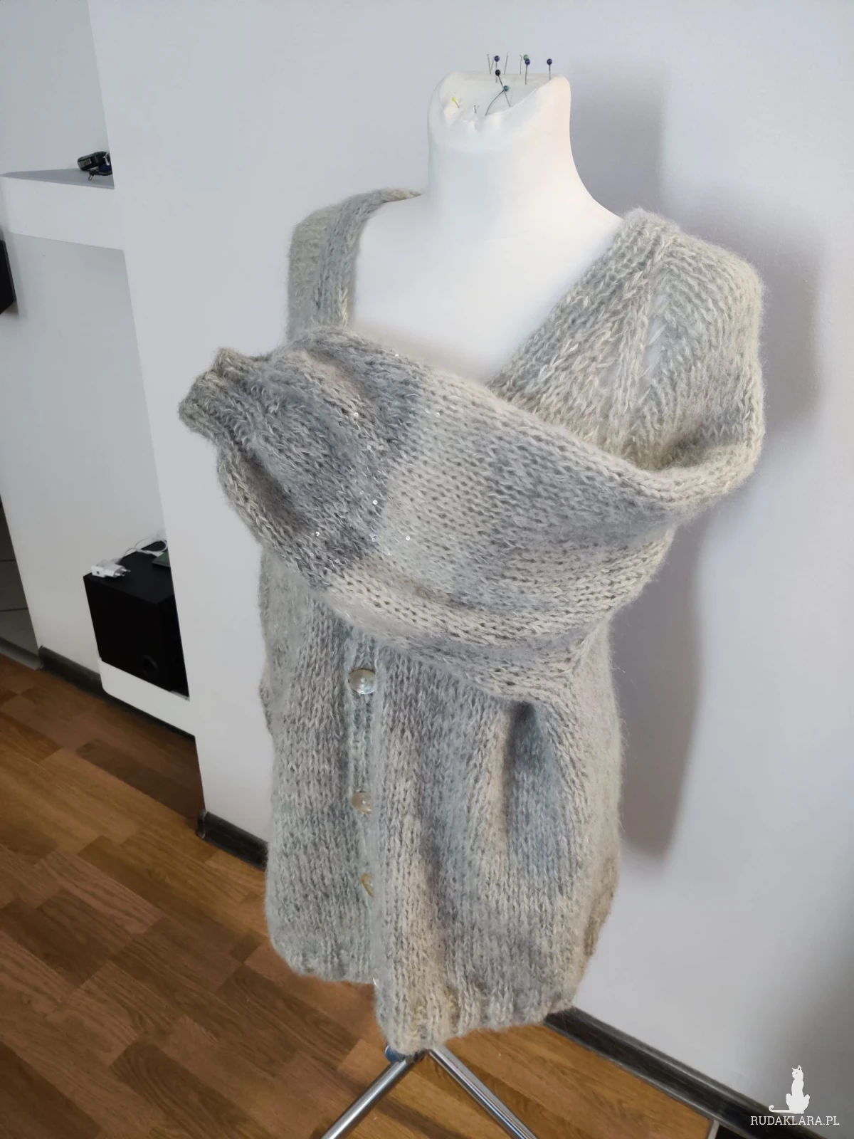 Kardigan damski ręcznie zrobiony z naturalnych włókien wełny i angory i moheru z jedwabiem.