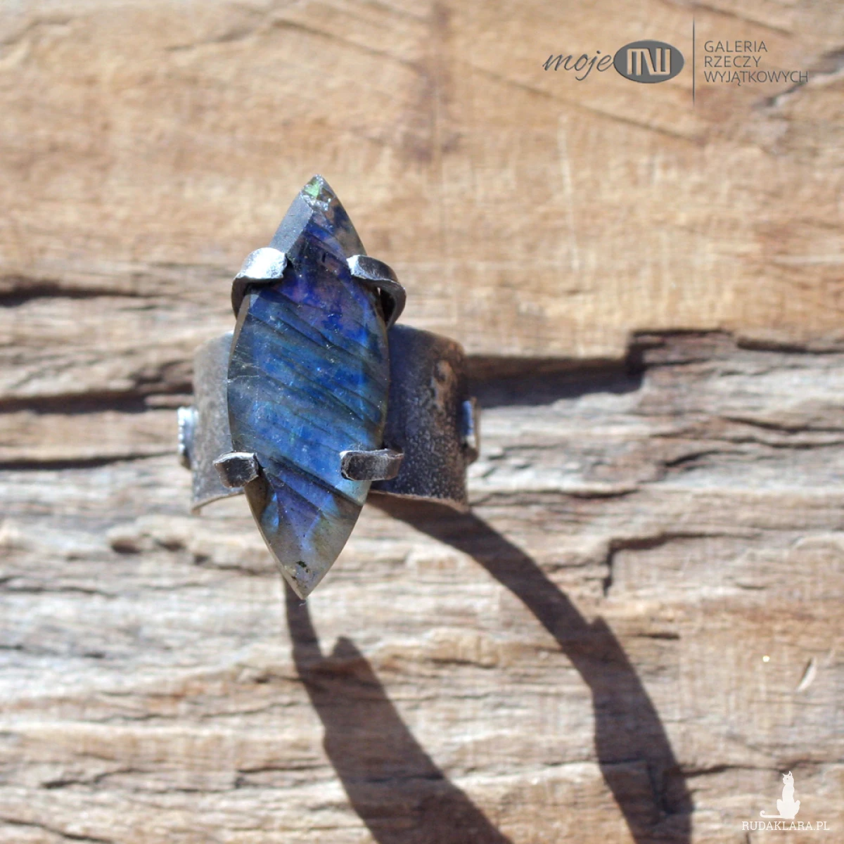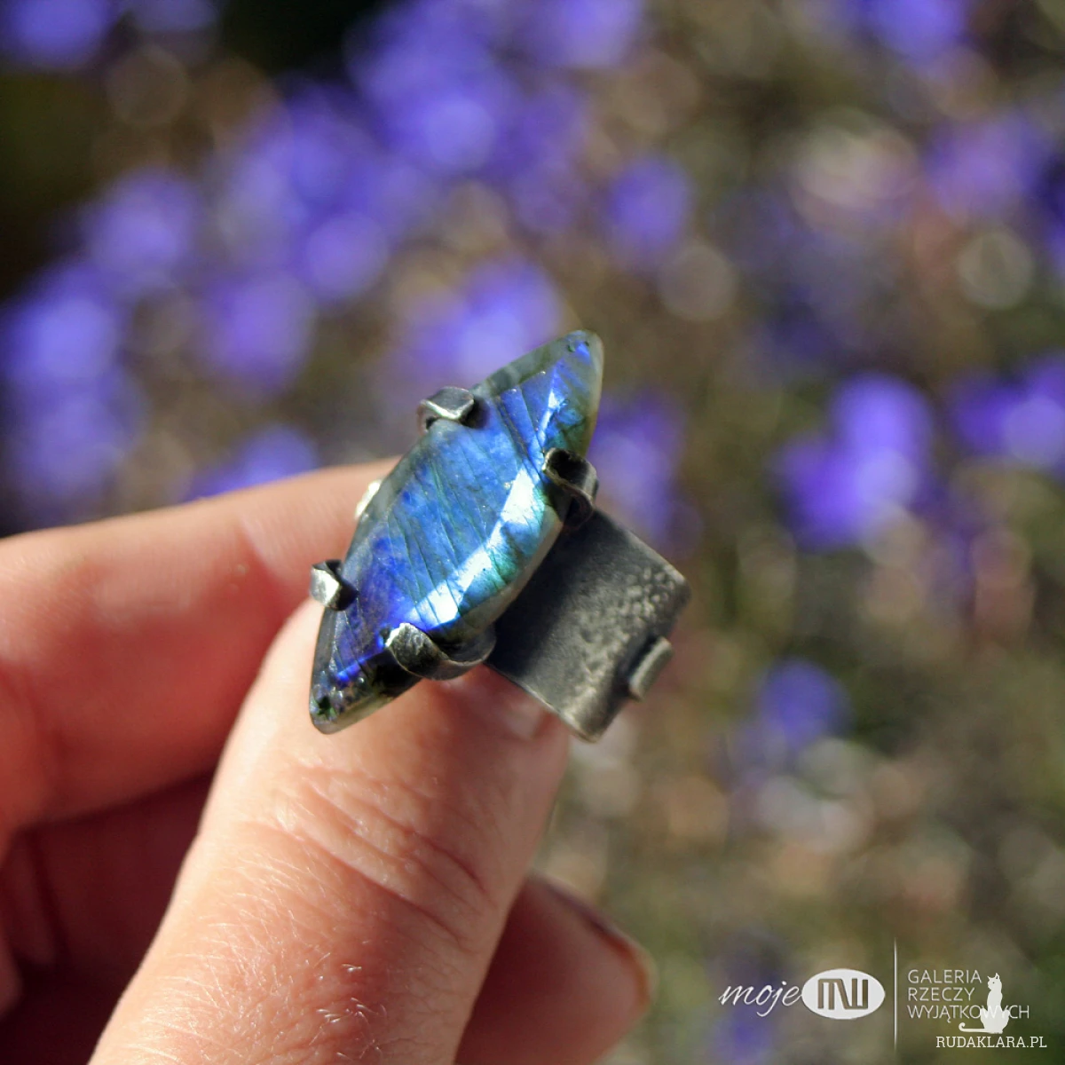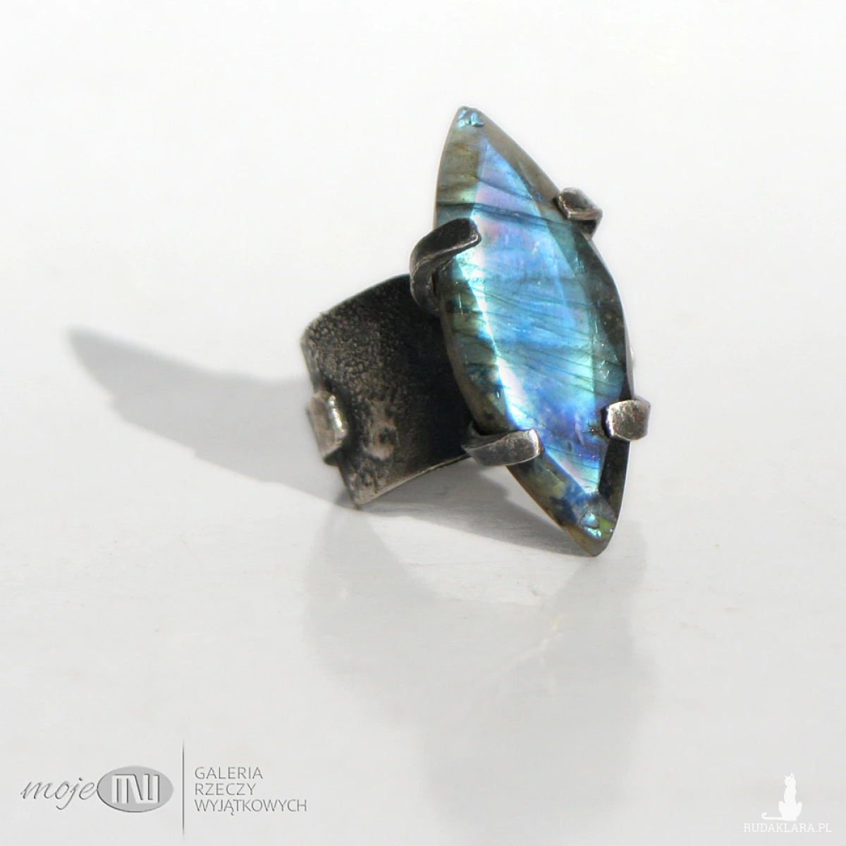 Pierścionek z labradorytem. Kamień - duża markiza- w odcieniach błękitu i lazuru osadzony jest prosto w srebrze próby min. 925. Oksydowany i przecierany.