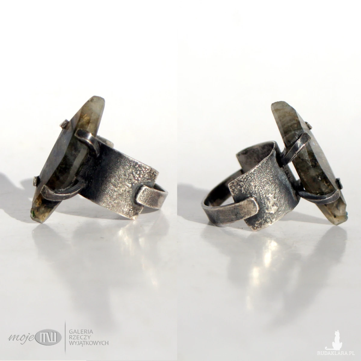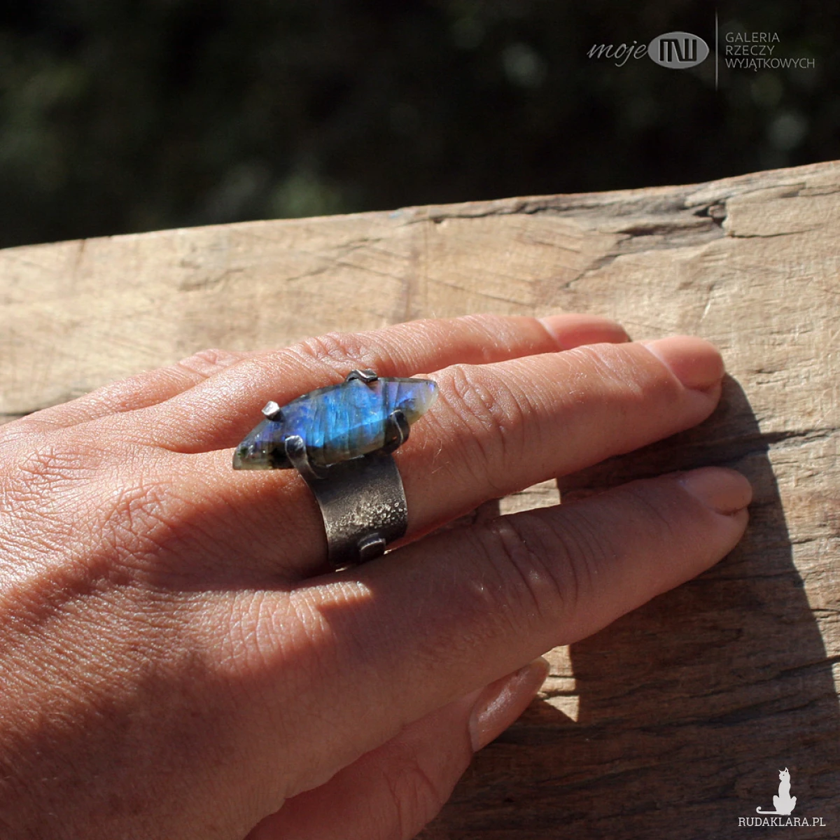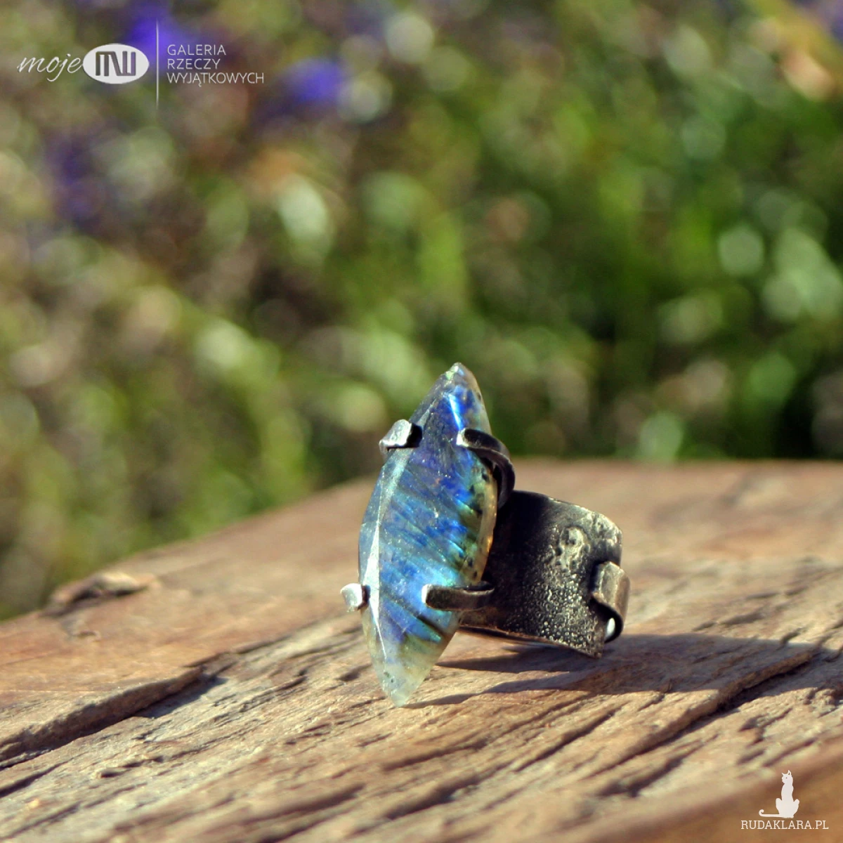 Pierścionek z labradorytem. Kamień - duża markiza- w odcieniach błękitu i lazuru osadzony jest prosto w srebrze próby min. 925. Oksydowany i przecierany.