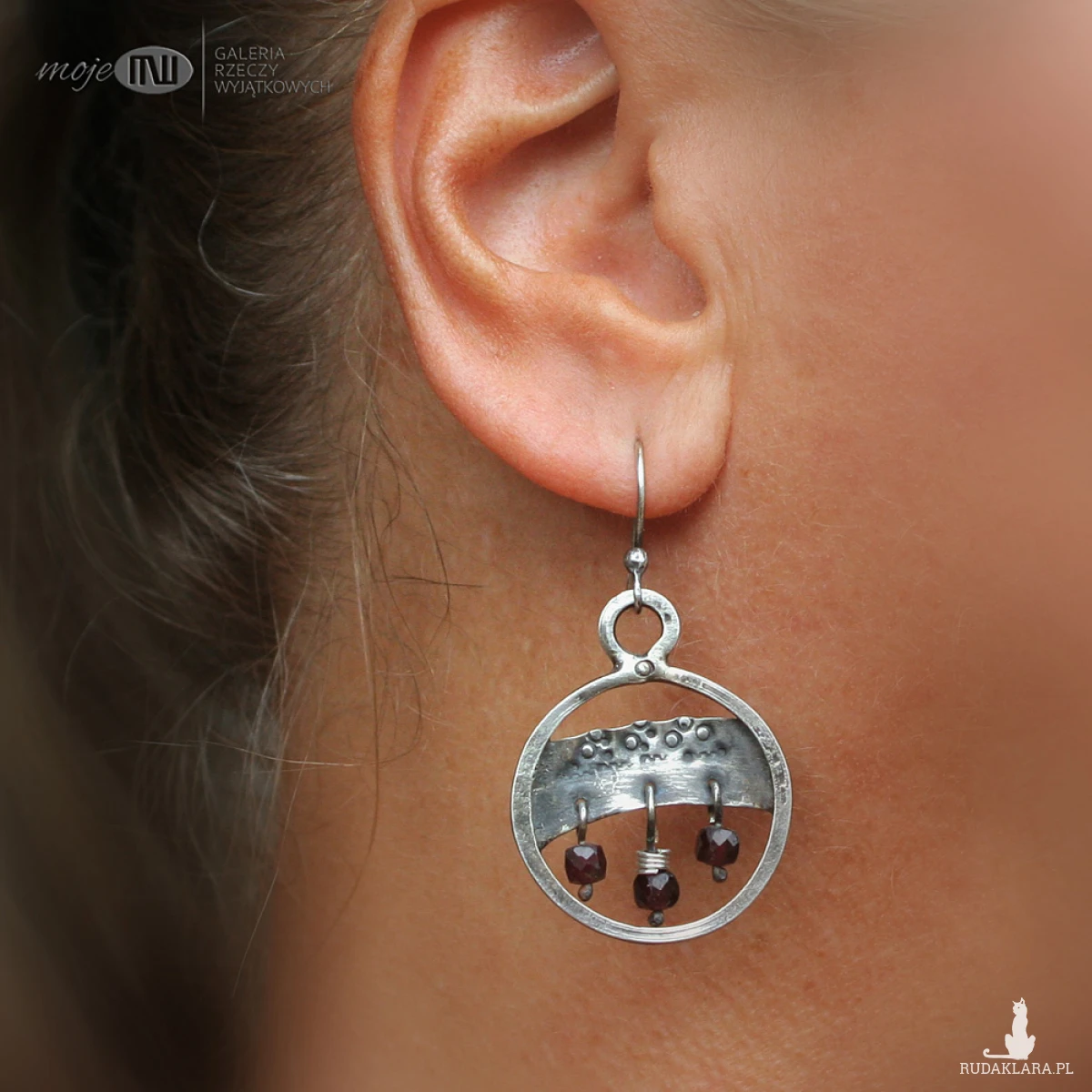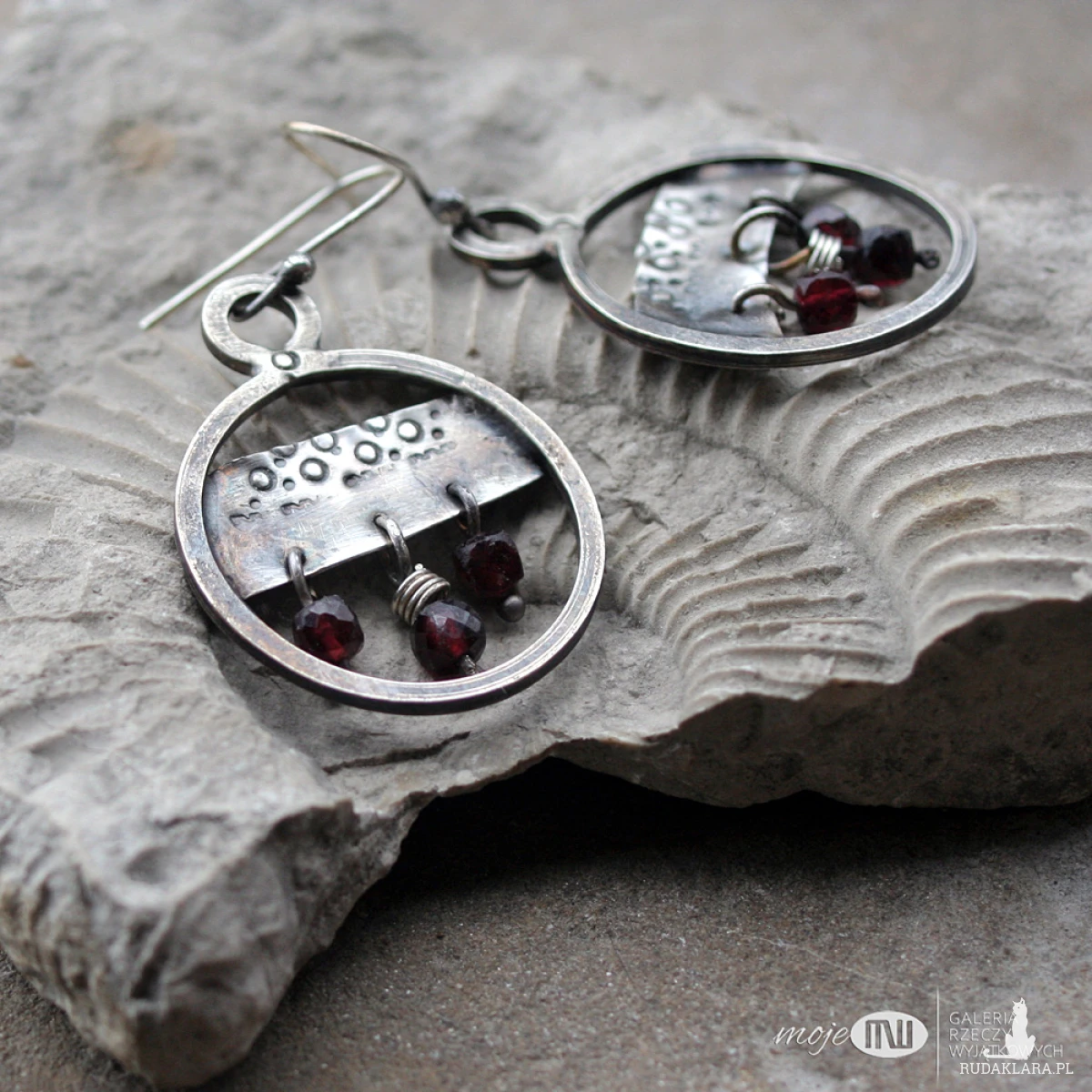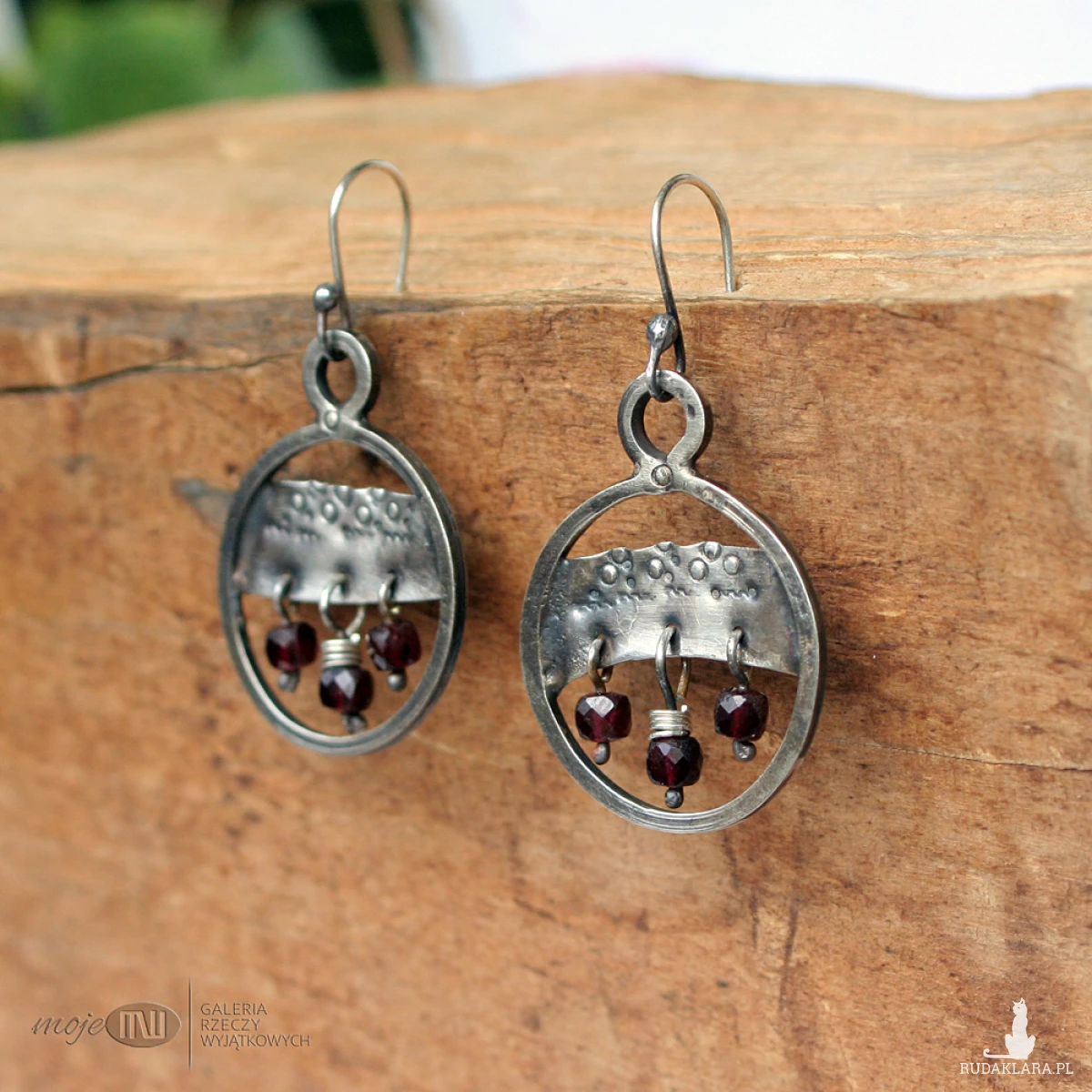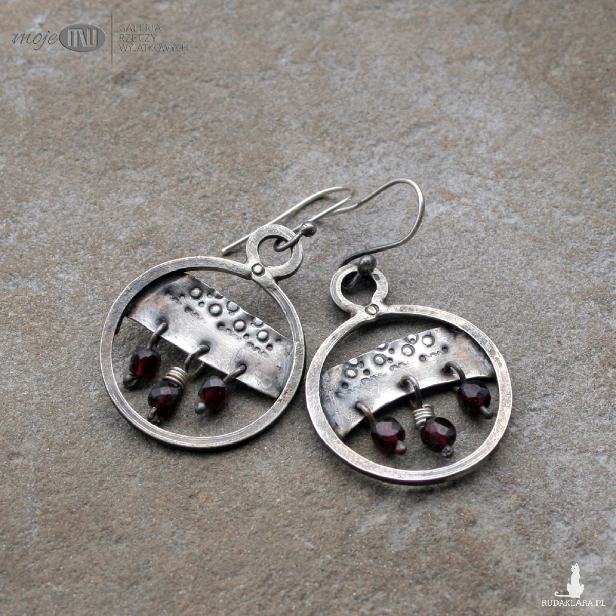 Rustykalne, wiszące kolczyki ze srebra w formie kół. Srebro jest młotkowane, oksydowane i przetarte dla wydobycia faktury. Zdobią je fasetowane granaty. Kolczyki zawieszone są na prostych biglach ze srebrnego drutu.