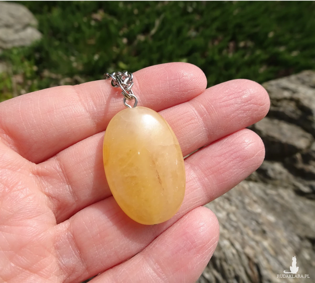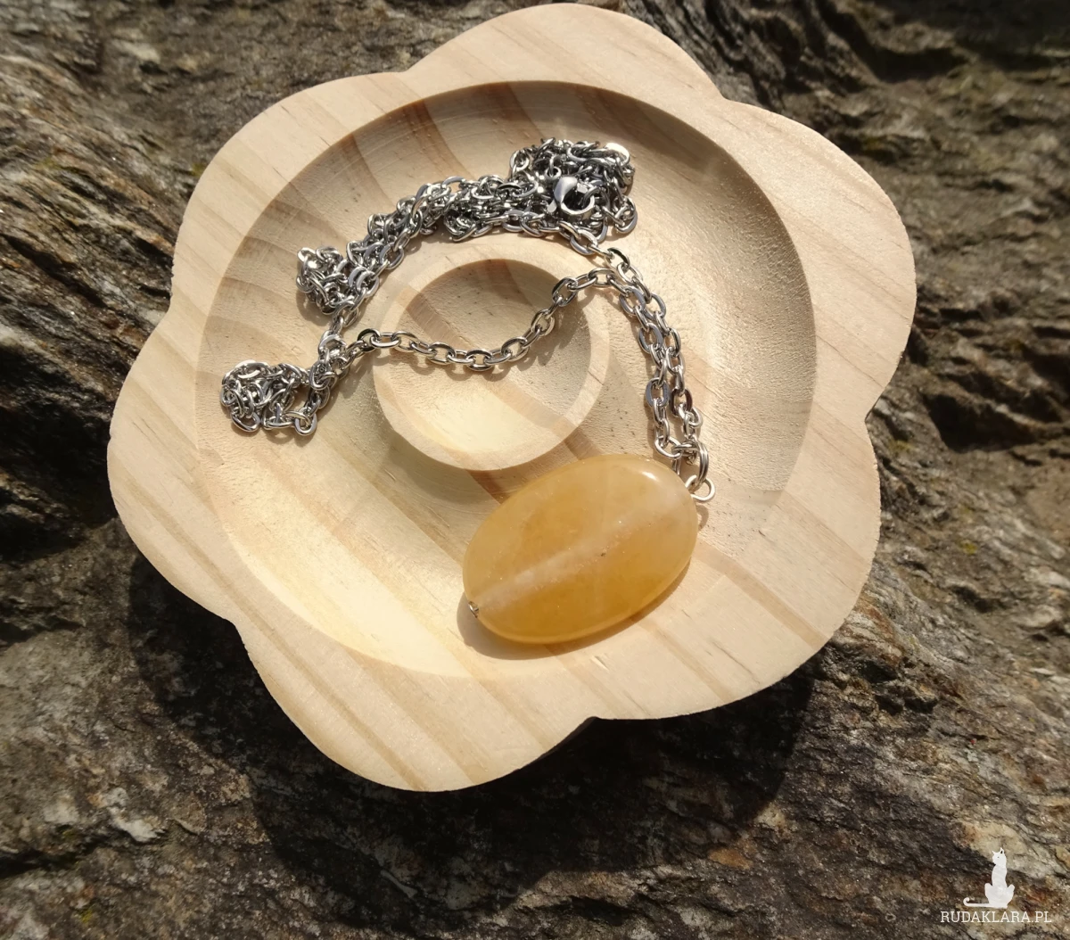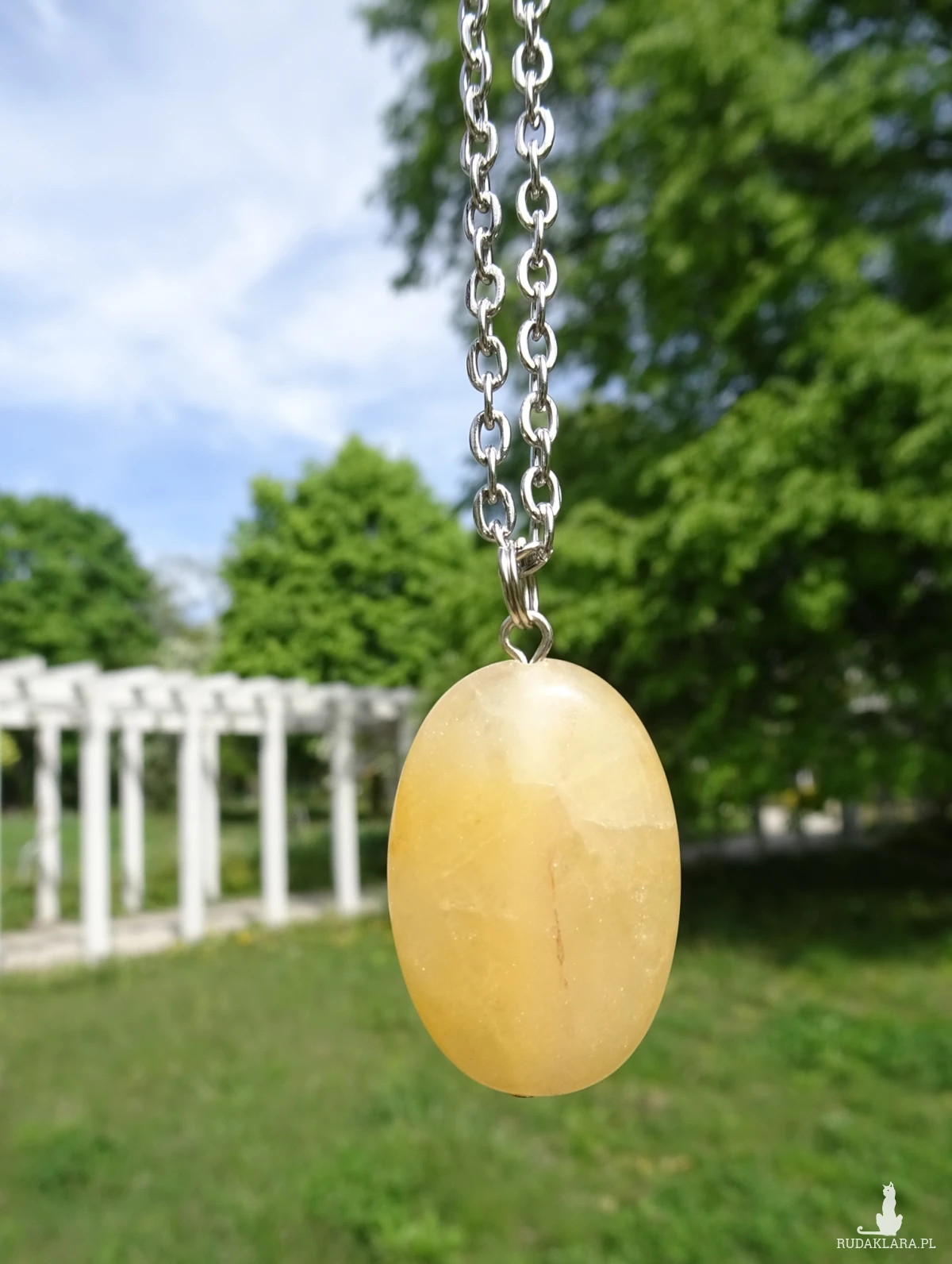 Nowy wisiorek z łańcuszka ze stali chirurgicznej i zawieszki z z żółtego kalcytu w kształcie owalu o wymiarach ok. 3,7x2cm. Długość z zapięciem 60cm.
