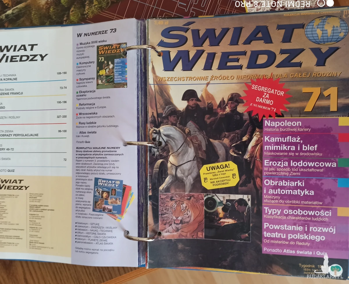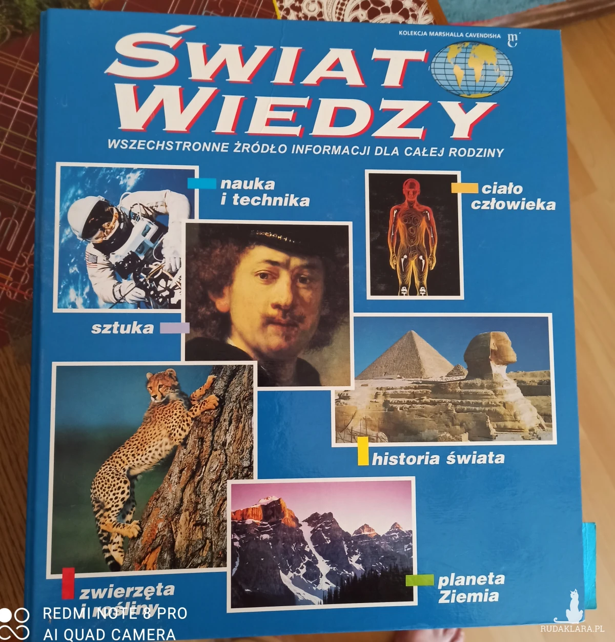 Wydawnictwo Kolekcja Marshala Cavendisha " Świat wiedzy" zebrana drogą subskrypcji. Kolekcja podzielona na 6 tomów składający się z tematycznych działów kilkuset stron każdy pod następującymi tytułami: Nauka i technika, Sztuka, Ciało człowieka, Historia świata, Planeta Ziemia, Zwierzęta i rośliny. Format większy do A4. Subskrypcja oprócz rozległej wiedzy jest bogato ilustrowana w kolorze, papier wysokiej jakości. Każdy temat zwiera sprawdzian wiedzy w postaci pytań do każdego tematu z każdych sześciu tytułów. Subskrypcja zebrana w segregatorach oprawa twarda. Wydanie adresowane do nauczycieli oraz uczniów w różnym wieku / szkoła podstawowa i średnia/. Bogato ilustrowany środek dydaktyczny do wykorzystania w pracy nauczyciela i poszerzania wiedzy i zainteresowań przez ucznia w wielu obszarach.