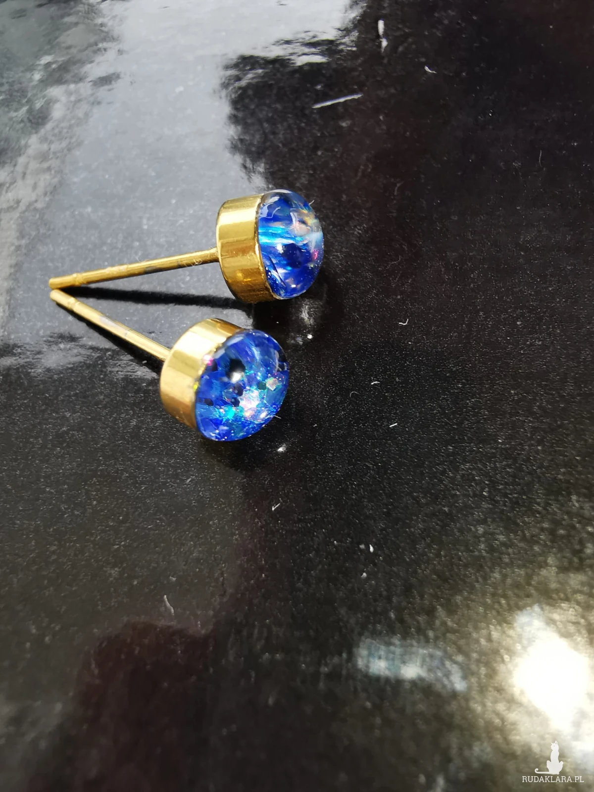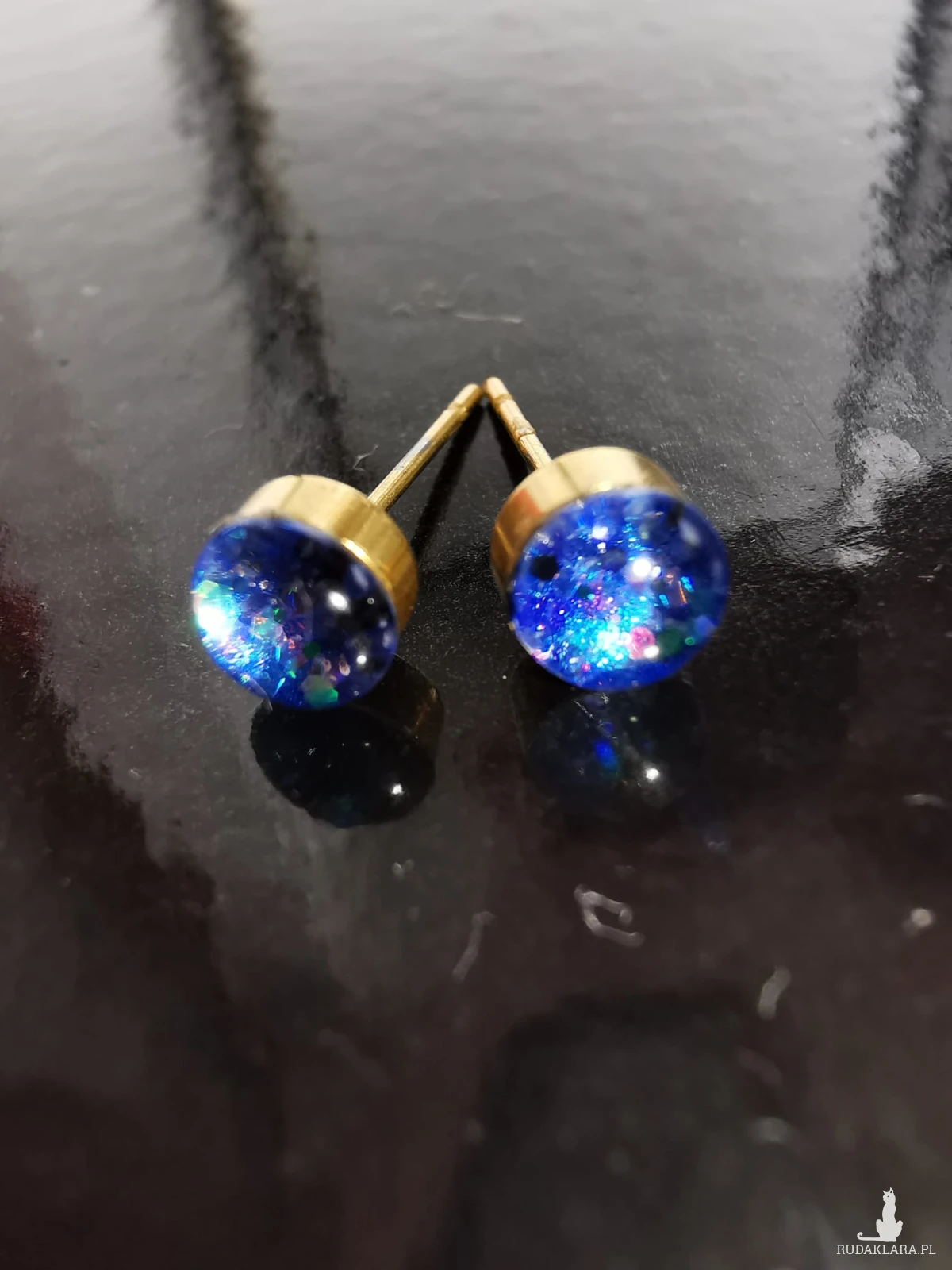 Drobne kolczyki stalowe 4mm, ręcznie wypełnione żywicą epoksydową i brokatami. Mocno się mienia różnymi kolorami. Są gustownym dodatkiem do różnych stylizacji.