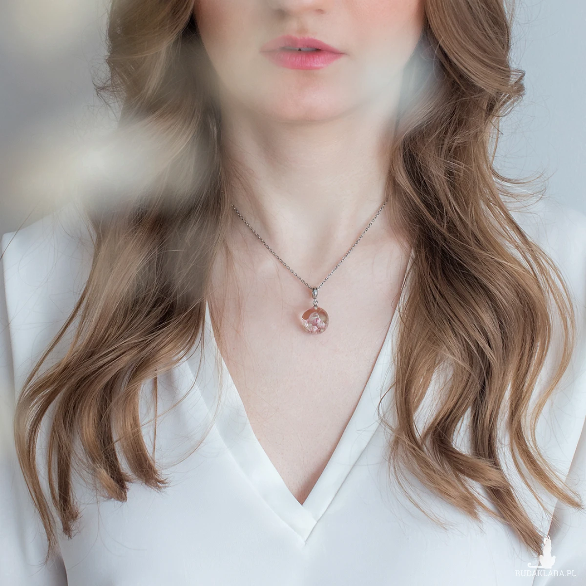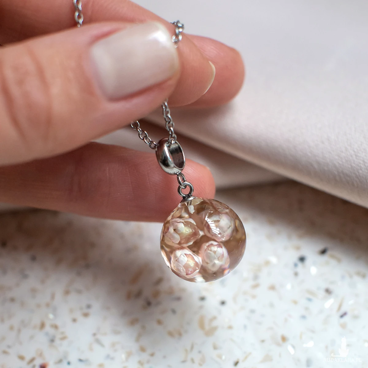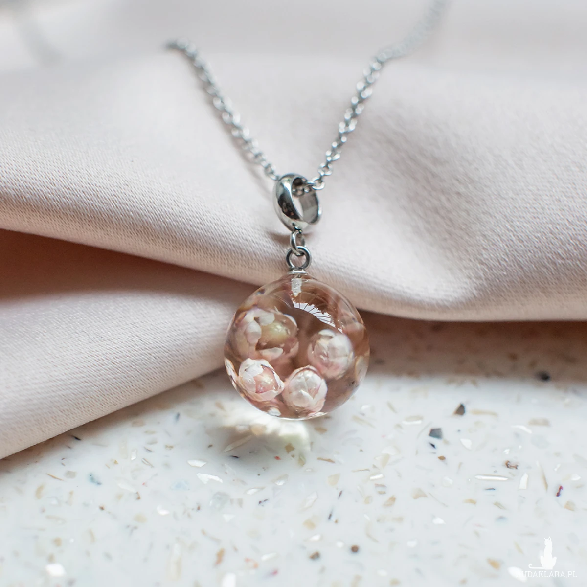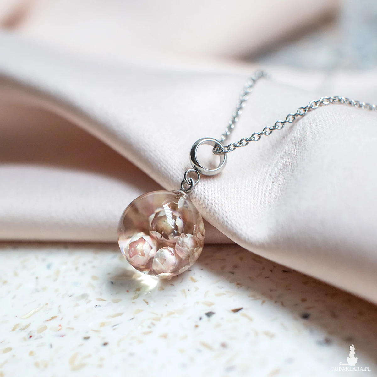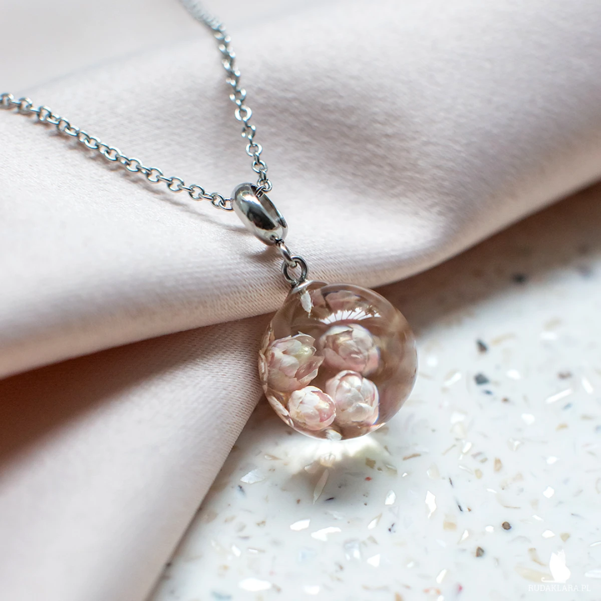 Wisiorek wykonany jest z żywicy epoksydowej z wykorzystaniem suszonych kwiatów. Metalowe elementy to stal nierdzewna szlachetna chirurgiczna.