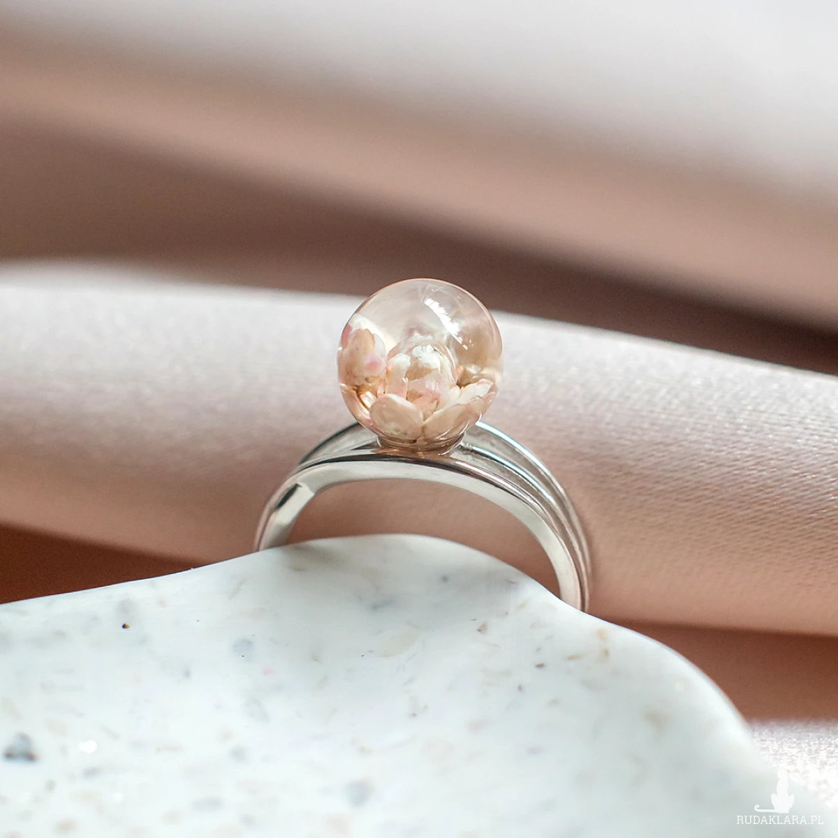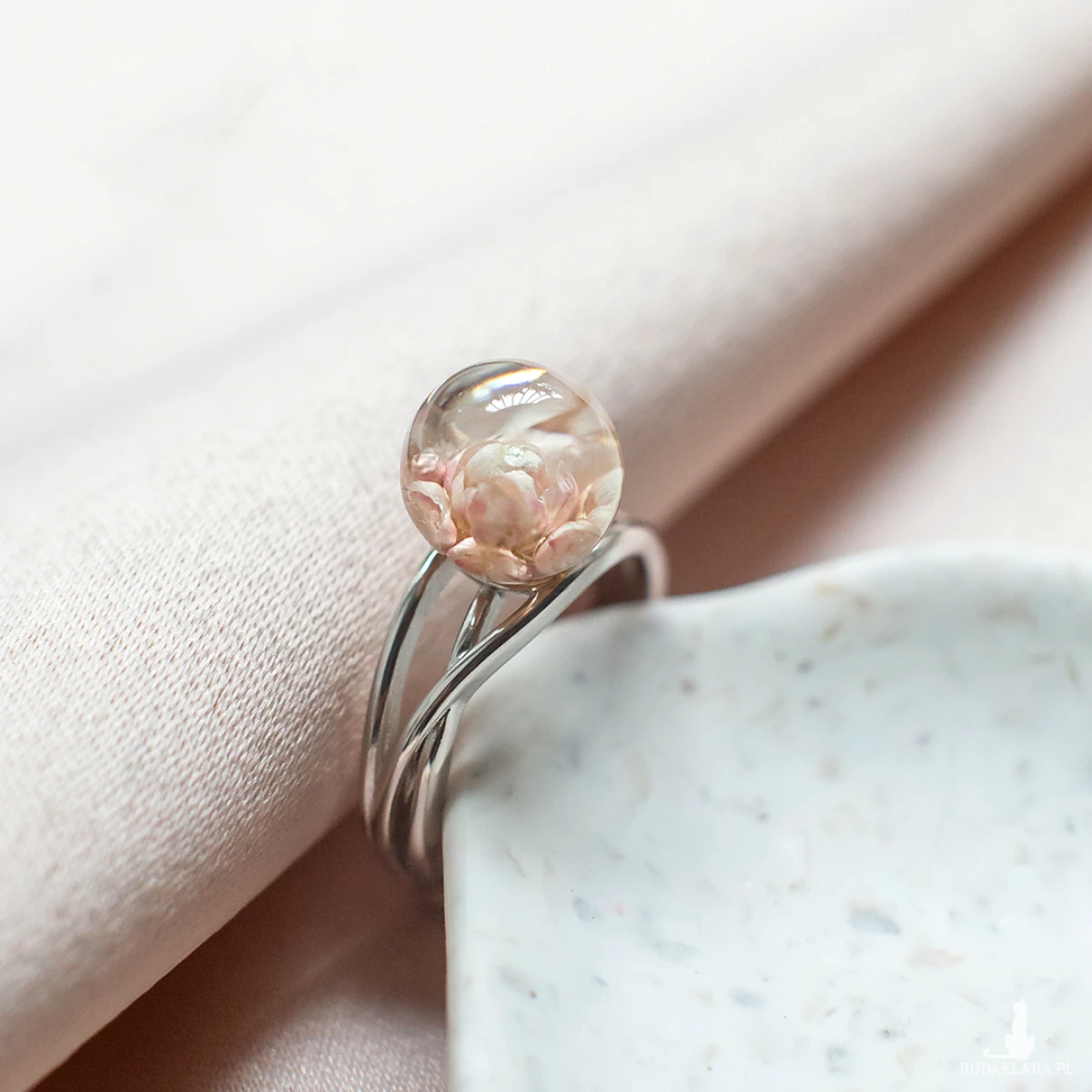Pierścionek wykonany jest z żywicy epoksydowej z wykorzystaniem suszonych kwiatów. Elementy metalowe są wykonane z mosiądzu i pokryte rodem.