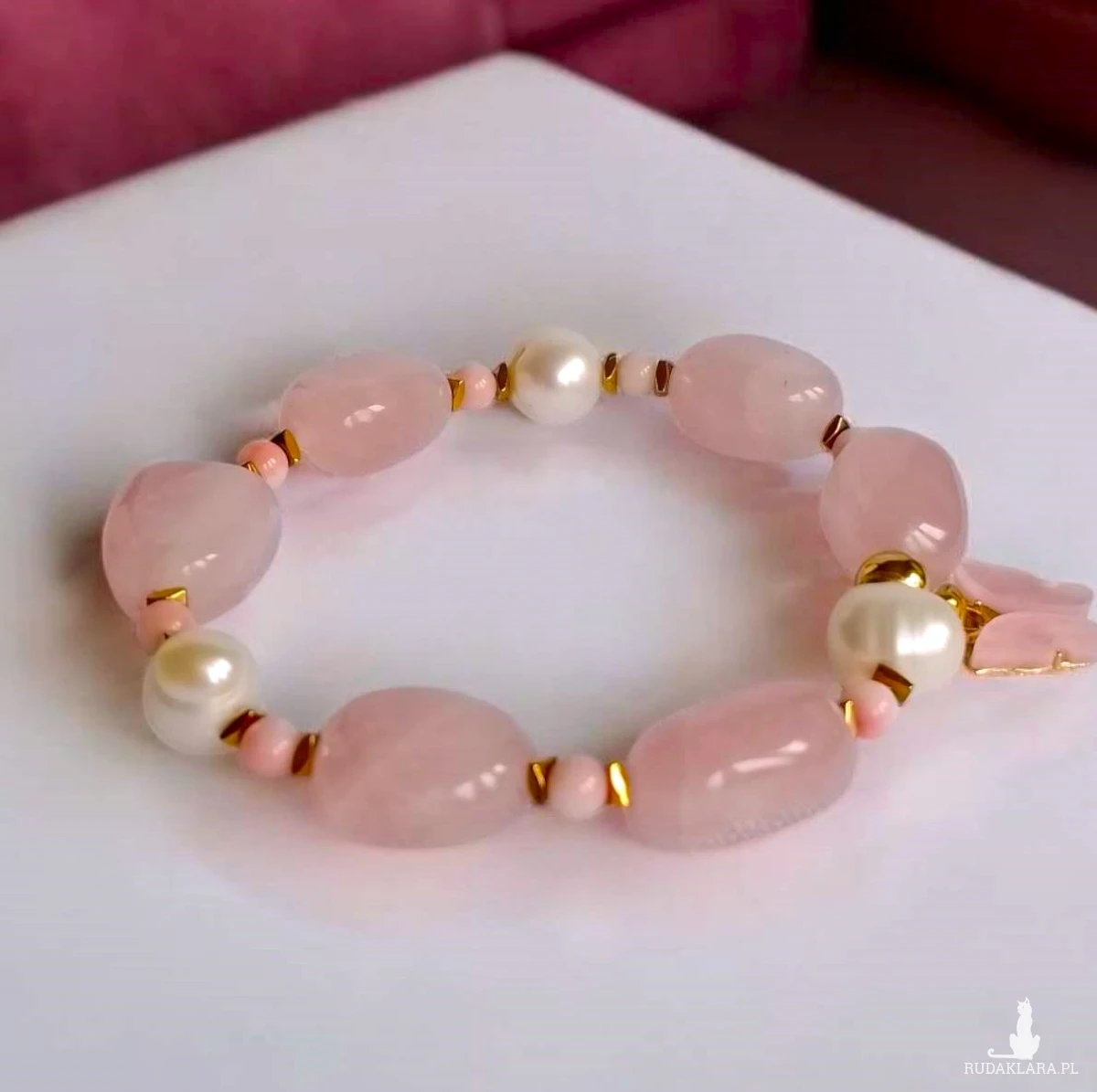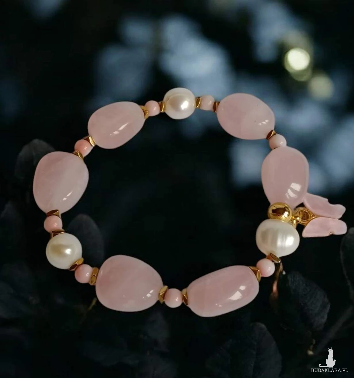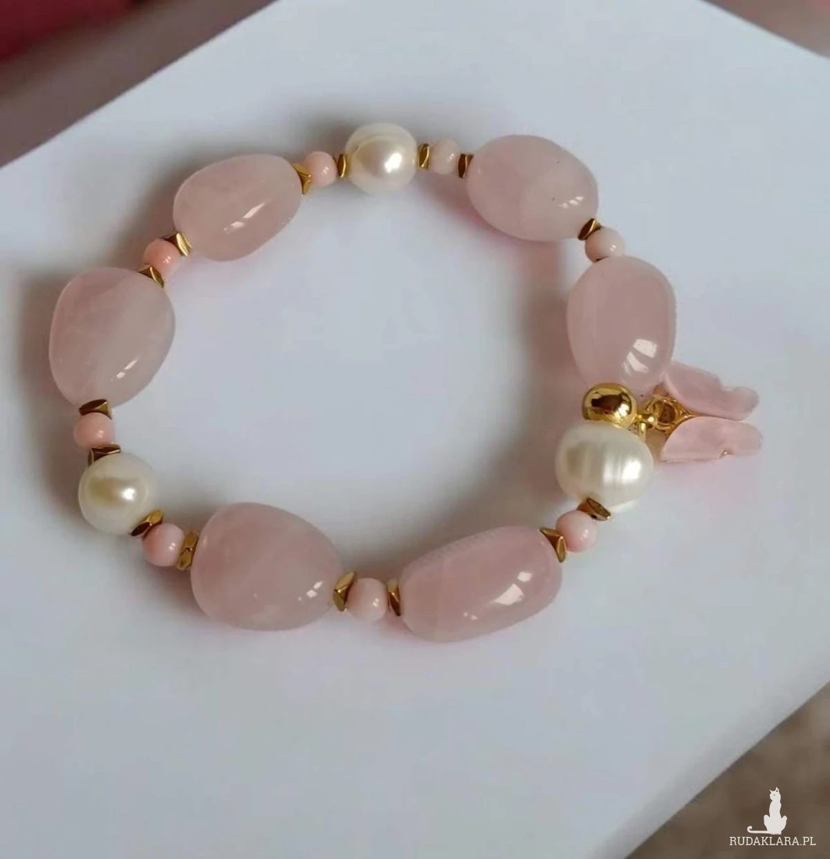 Tę niepowtarzalną bransoletkę tworzą nieregularne bryłki różowego kwarcu oraz duże hodowane perły przekładane kuleczkami z muszli i hematytami w złotym kolorze, a dodatkową ozdobę stanowi zawieszka w kształcie motylka z masy perłowej. Bransoletka wykonana została na elastycznej żyłce silikonowej, odpowiednia dla nadgarstka ok.16-17 cm.
