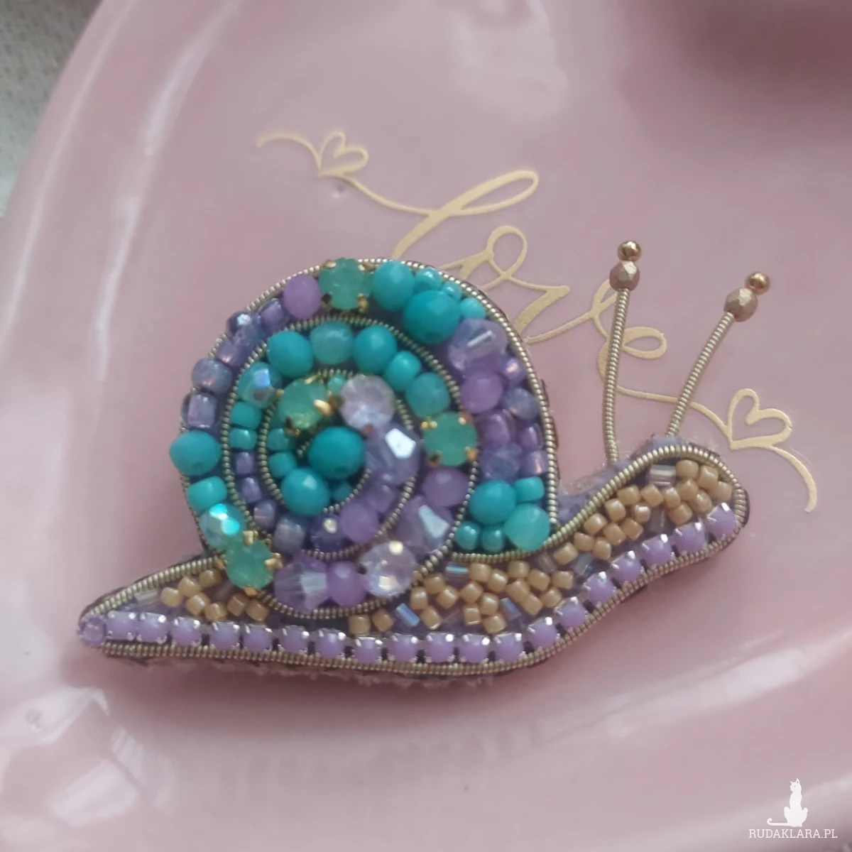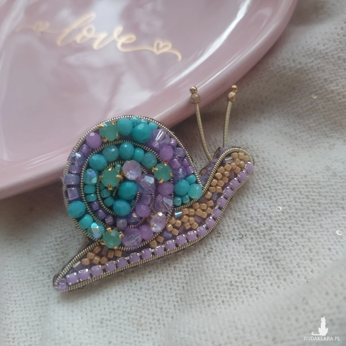 Wyjątkowa wiosenno-letnia broszka ślimak w powstała techniką haftu koralikowego. To doskonały dodatek biżuteryjny dla miłośniczek fioletu i turkusu.