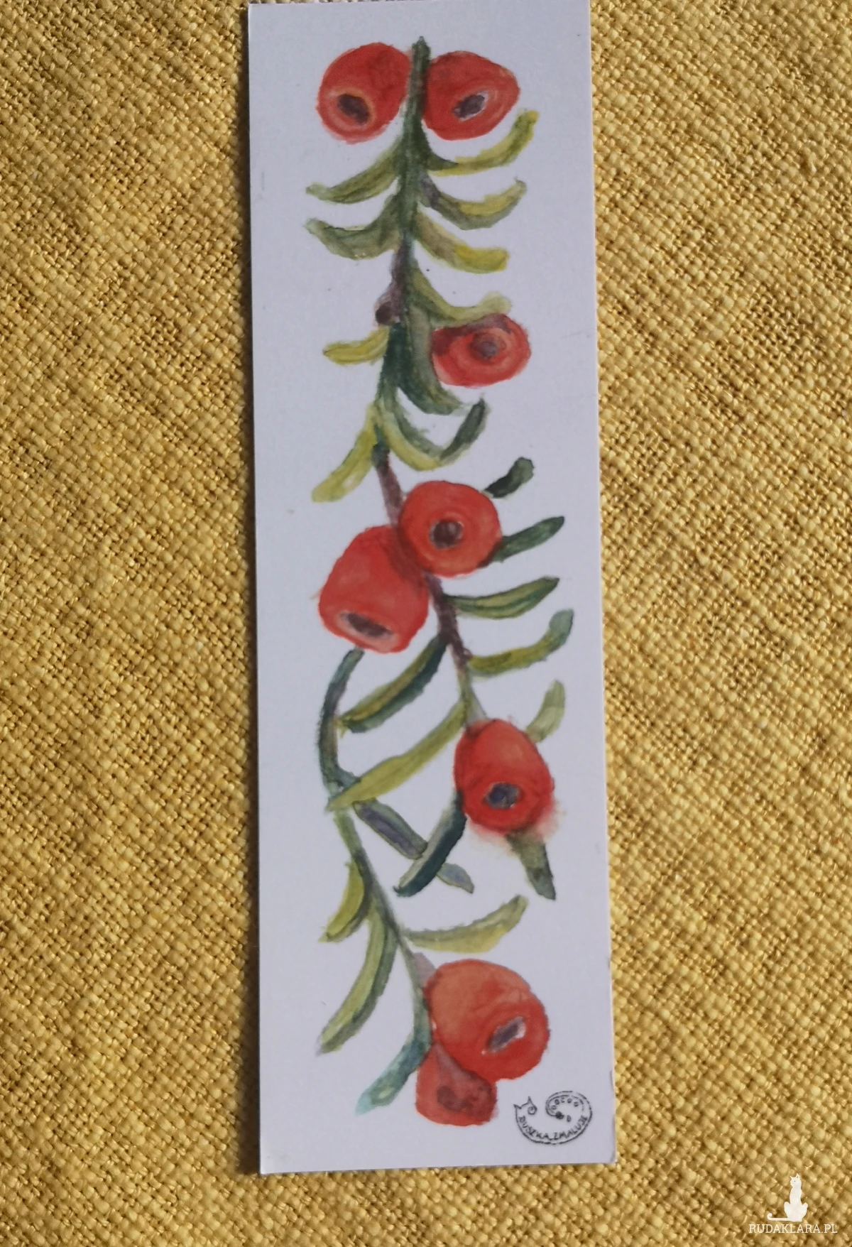 Drukowana zakładka do książki o wymiarach 15 x 4,5 cm. Dekoracja przedstawiająca gałązki cisu została specjalnie zaprojektowana dla ozdoby tego przedmiotu i jest reprodukcją mojej akwareli namalowanej na podstawie sfotografowanej przeze mnie rośliny. Kolorystyka z dominującymi odcieniami zieleni i czerwieni w oryginale może nieznacznie odbiegać od przedstawionej na fotografii. Odwrotna strona zakładki gładka.